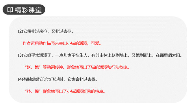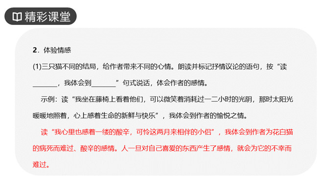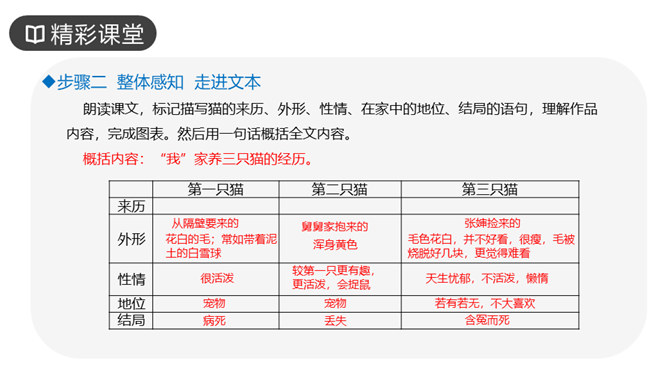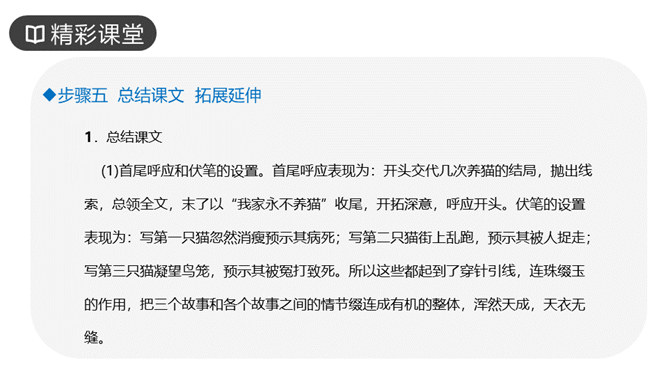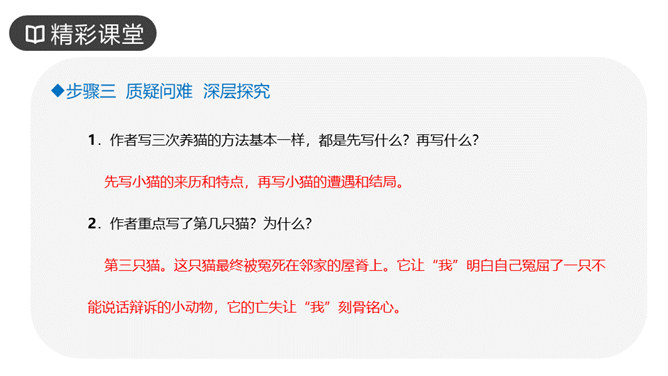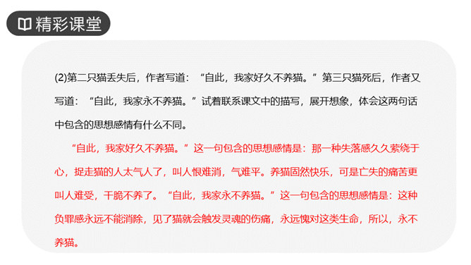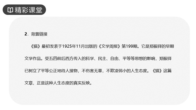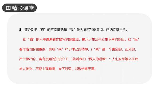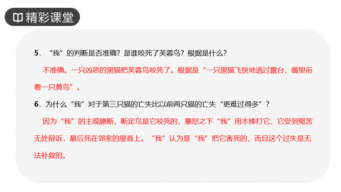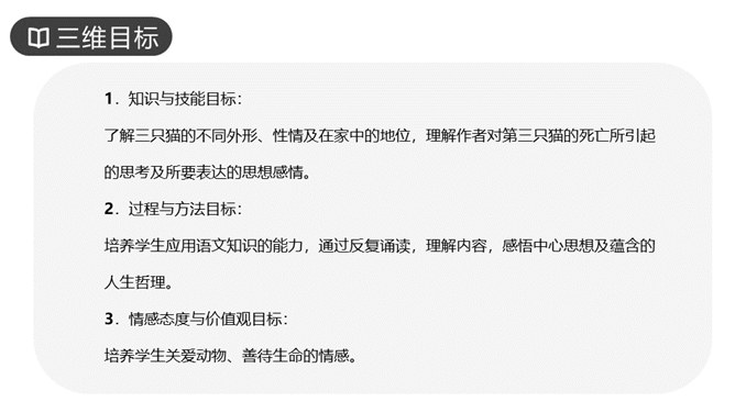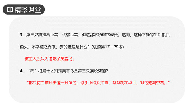 作者写三次养猫的方法基本一样,都是先写什么?再写什么?先写小猫的来历和特点,再写小猫的遭遇和结局。作者重点写了第几只猫?为什么?第三只猫。这只猫最终被冤死在邻家的屋脊上。它让“我”明白自己冤屈了一只不能说话辩诉的小动物,它的亡失让“我”刻骨铭心。第三只猫难看也罢、忧郁也罢,但这都不妨碍它成长。然而,这种平静的生活很快消失,不幸随之而来,猫的遭遇是什么?被主人误认为偷吃了芙蓉鸟。“我”根据什么判定芙蓉鸟是第三只猫咬死的?“那只花白猫对于这一对黄鸟,似乎也特别注意,常常跳在桌上,对鸟笼凝望着。”所属专题:猫ppt。