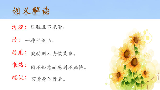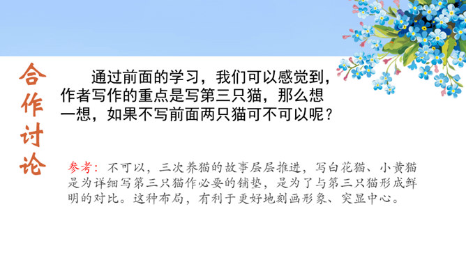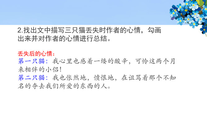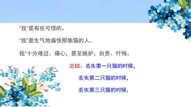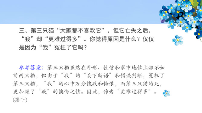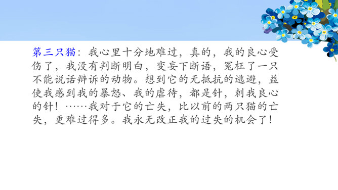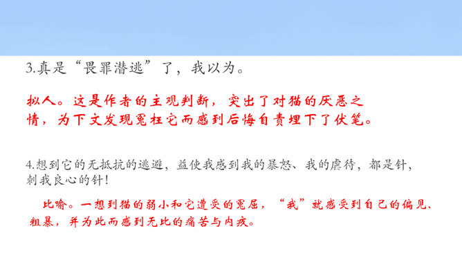 比喻。形象地写出了小猫毛色的漂亮和它的活泼、可爱,进而表现出“我”对它的喜爱之情。比喻。“亲爱的同伴”说明小猫在大家心目中的地位之高,大家和猫的关系亲密无间。拟人。这是作者的主观判断,突出了对猫的厌恶之情,为下文发现冤枉它而感到后悔自责埋下了伏笔。比喻。一想到猫的弱小和它遭受的冤屈,“我”就感受到自己的偏见、粗暴,并为此而感到无比的痛苦与内疚。我对自己冤枉了猫很自责,相对以前的两只猫的亡失的感情,“难过”所表达的痛苦要强烈得多。因为自己的妄断,冤枉了第三只猫,“我”深感内疚和自责。所属专题:猫ppt。