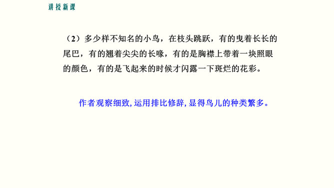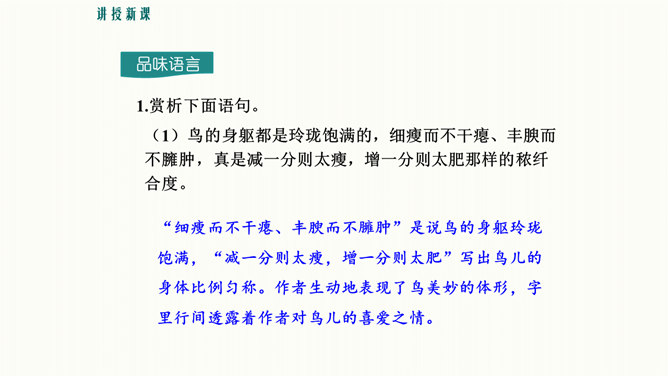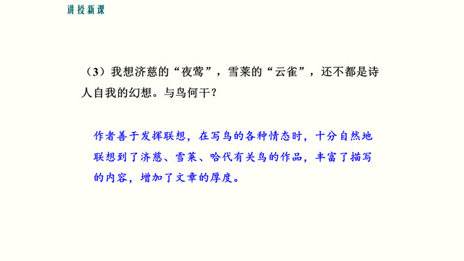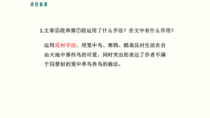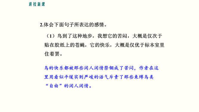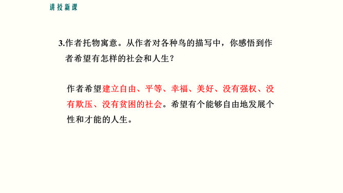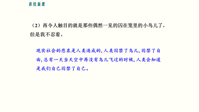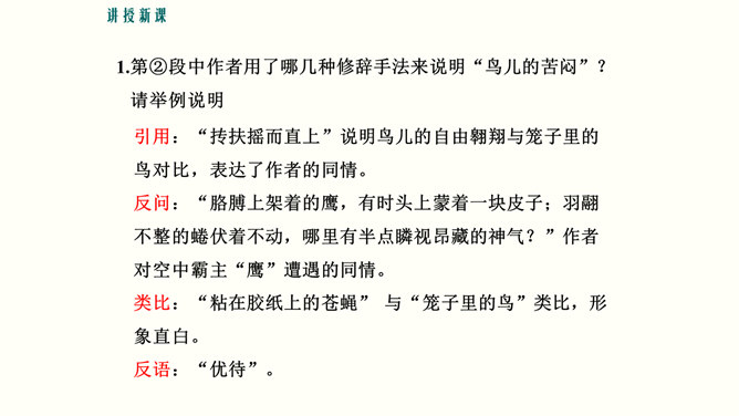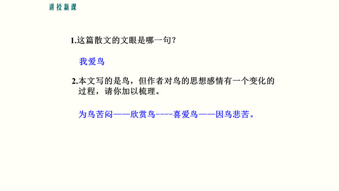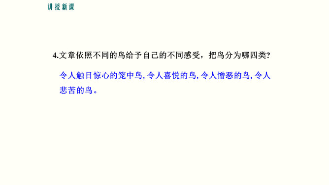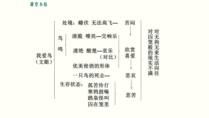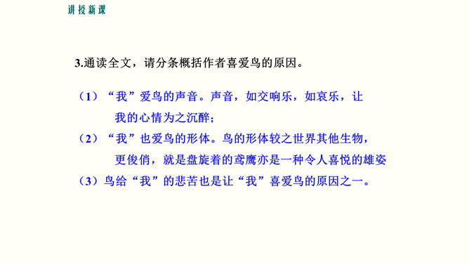 通读全文,请分条概括作者喜爱鸟的原因。(1)“我”爱鸟的声音。声音,如交响乐,如哀乐,让我的心情为之沉醉;(2)“我”也爱鸟的形体。鸟的形体较之世界其他生物,更俊俏,就是盘旋着的鸢鹰亦是一种令人喜悦的雄姿(3)鸟给“我”的悲苦也是让“我”喜爱鸟的原因之一。文章依照不同的鸟给予自己的不同感受,把鸟分为哪四类?令人触目惊心的笼中鸟,令人喜悦的鸟,令人憎恶的鸟,令人悲苦的鸟。所属专题:鸟ppt。