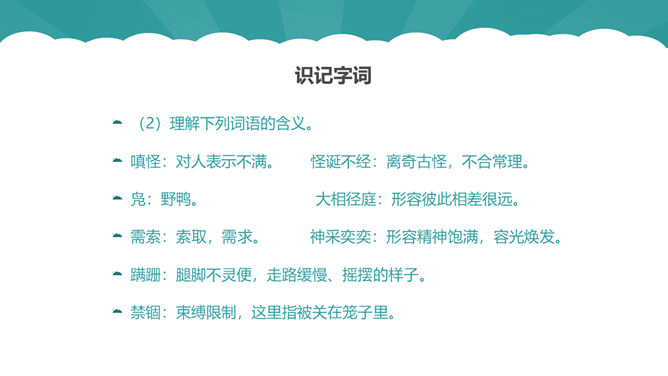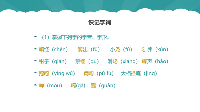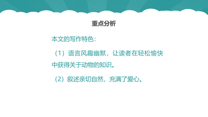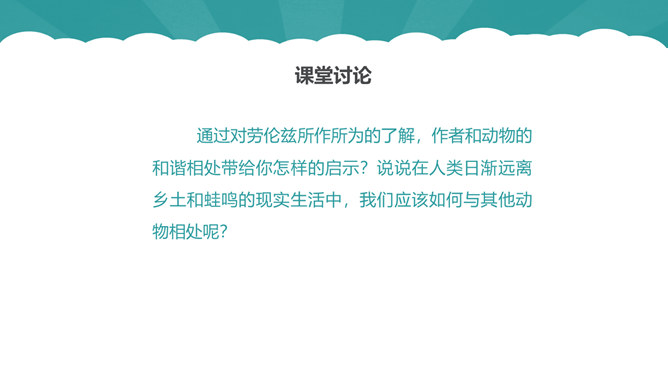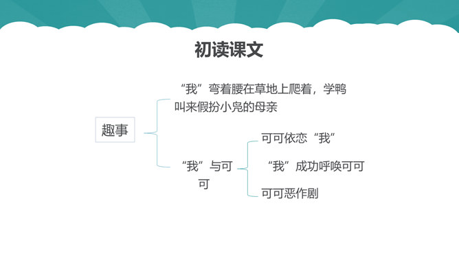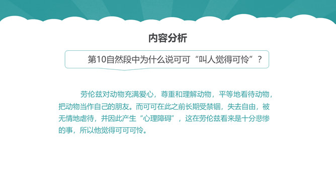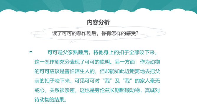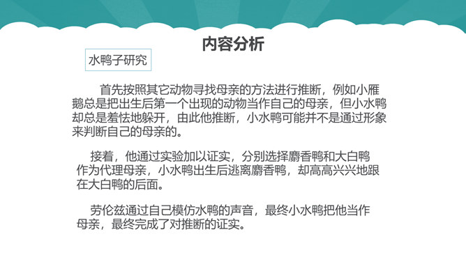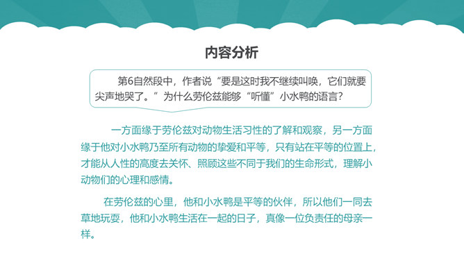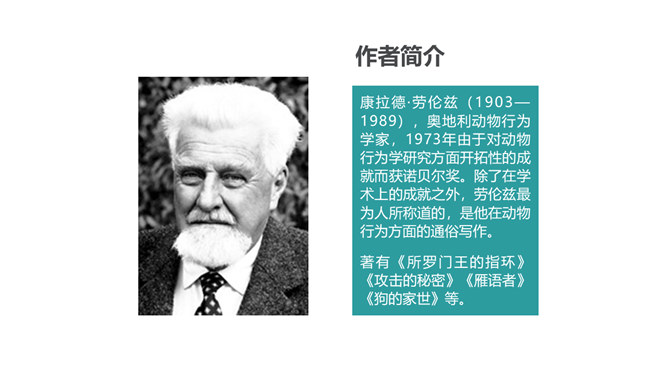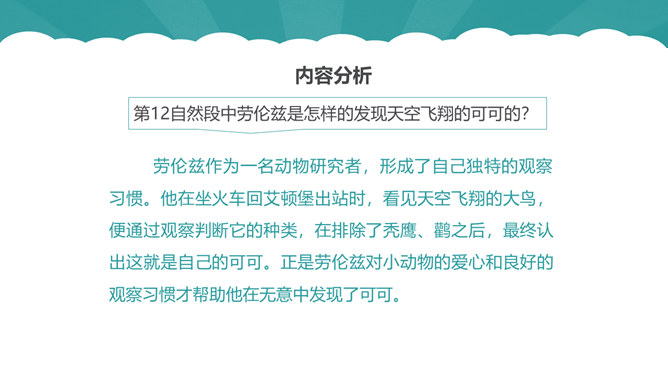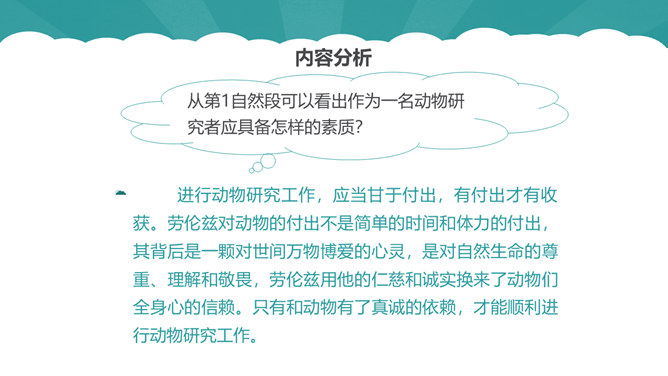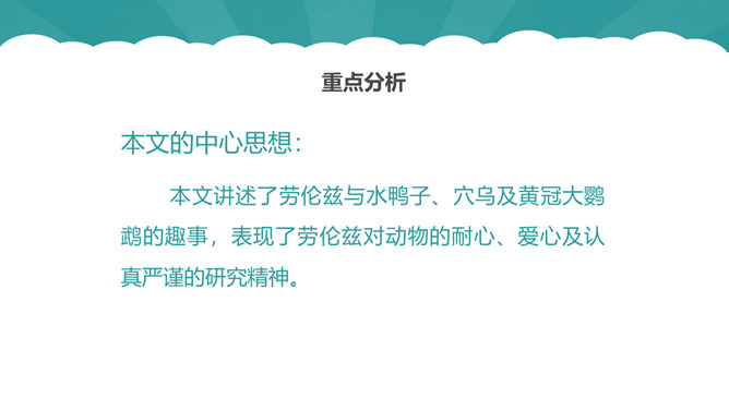 从第1自然段可以看出作为一名动物研究者应具备怎样的素质?第6自然段中,作者说“要是这时我不继续叫唤,它们就要尖声地哭了。”为什么劳伦兹能够“听懂”小水鸭的语言?第10自然段中为什么说可可“叫人觉得可怜”?第12自然段中劳伦兹是怎样的发现天空飞翔的可可的?读了可可的恶作剧后,你有怎样的感受?本文的中心思想:本文讲述了劳伦兹与水鸭子、穴乌及黄冠大鹦鹉的趣事,表现了劳伦兹对动物的耐心、爱心及认真严谨的研究精神。所属专题:动物笑谈ppt。