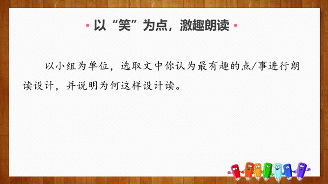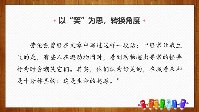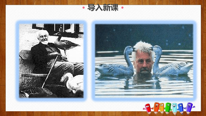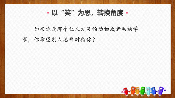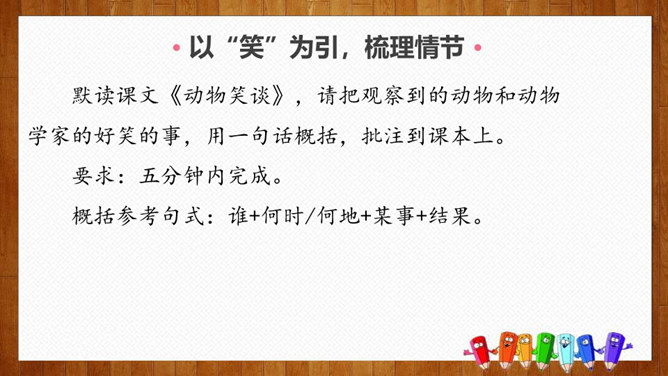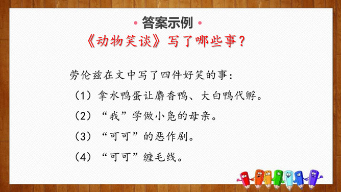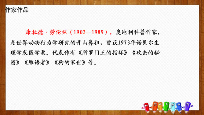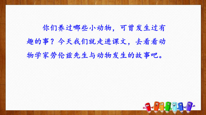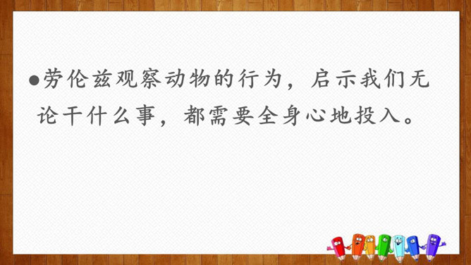 1.练习默读,边读边勾画,学做摘录。2.体会作者爱护动物、尊重生命的情感。3.学习科学工作者专注、忘我的精神和极高的专业素养。你们养过哪些小动物,可曾发生过有趣的事?今天我们就走进课文,去看看动物学家劳伦兹先生与动物发生的故事吧。默读课文,请把观察到的动物和动物学家的好笑的事,用一句话概括,批注到课本上。要求:五分钟内完成。劳伦兹在文中写了四件好笑的事:(1)拿水鸭蛋让麝香鸭、大白鸭代孵。(2)“我”学做小凫的母亲。(3)“可可”的恶作剧。(4)“可可”缠毛线。所属专题:动物笑谈ppt。