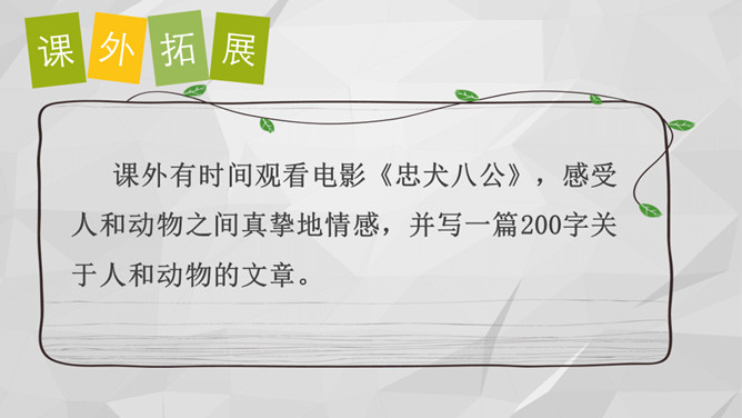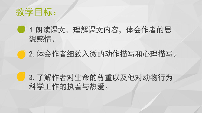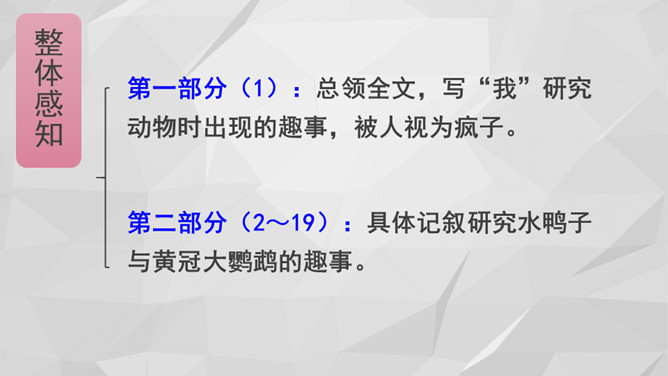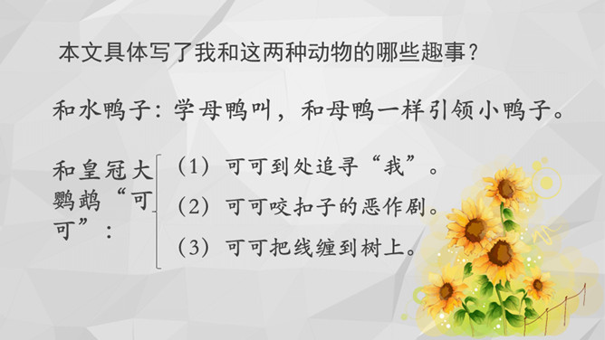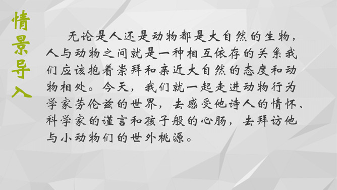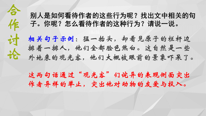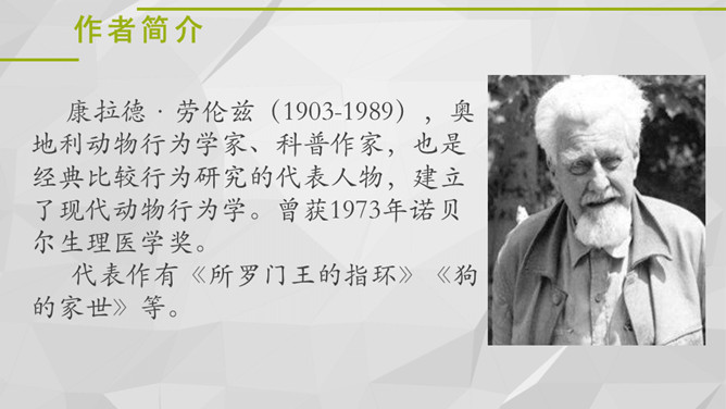 无论是人还是动物都是大自然的生物,人与动物之间就是一种相互依存的关系我们应该抱着崇拜和亲近大自然的态度和动物相处。今天,我们就一起走进动物行为学家劳伦兹的世界,去感受他诗人的情怀、科学家的谨言和孩子般的心肠,去拜访他与小动物们的世外桃源。别人是如何看待作者的这些行为呢?找出文中相关的句子。你呢?怎么看待作者的这种行为?请说一说。这两句话通过“观光客”们诧异的表现侧面突出作者异样的举止,突出他对动物的友爱与投入。作者不仅是一个科学家,也是一个极富爱心的人。所属专题:动物笑谈ppt。