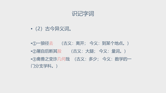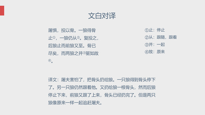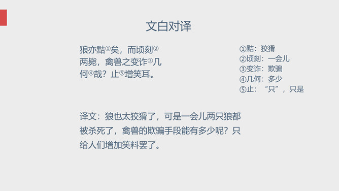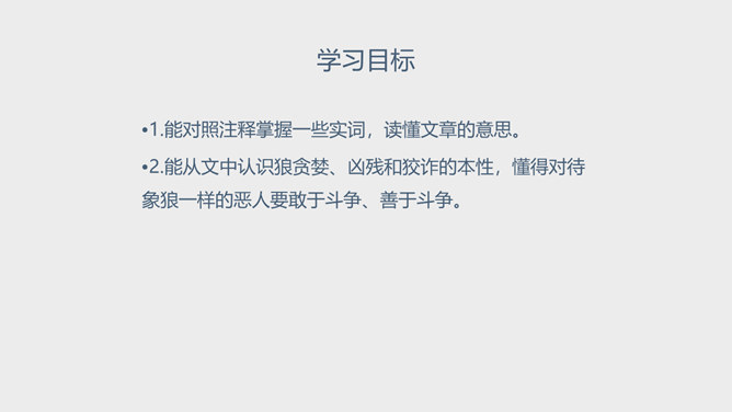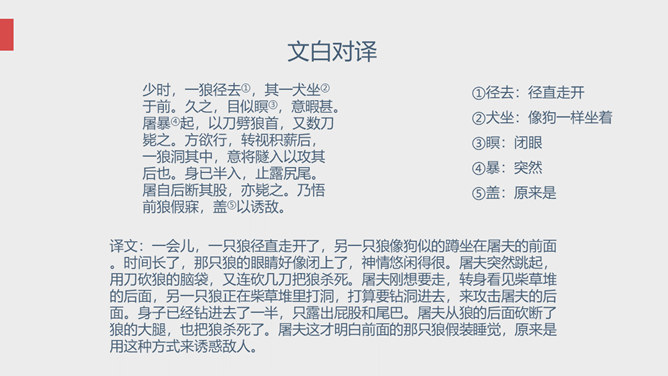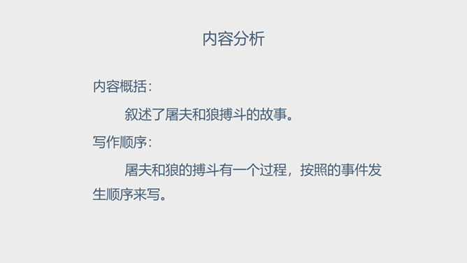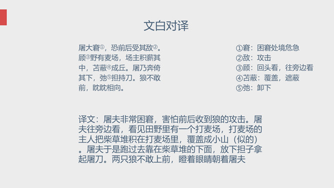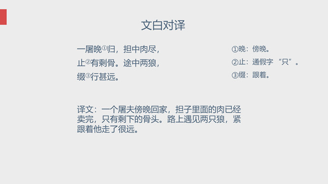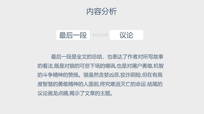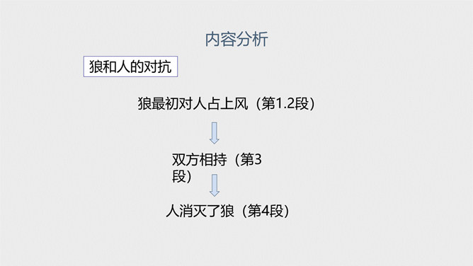 内容概括:叙述了屠夫和狼搏斗的故事。写作顺序:屠夫和狼的搏斗有一个过程,按照的事件发生顺序来写。最后一段是全文的总结,也表达了作者对所写故事的看法,既是对狼的可悲下场的嘲讽,也是对屠户勇敢,机智的斗争精神的赞扬。狼虽然贪婪凶恶,狡诈阴险,但在有高度智慧的勇敢精神的人面前,终究难逃灭亡的命运.结尾的议论画龙点睛,揭示了文章的主题。“止增笑耳”一句,作者嘲讽的仅仅是恶狼吗?从这个屠户胜利的故事中你获得怎样的启示?所属专题:狼ppt。