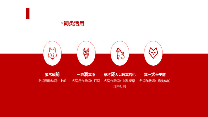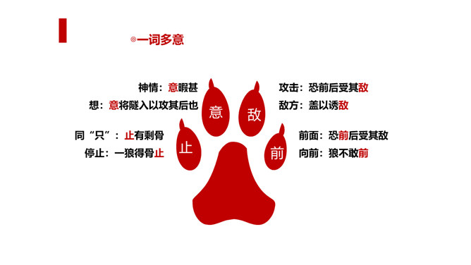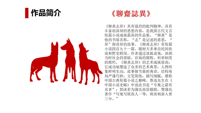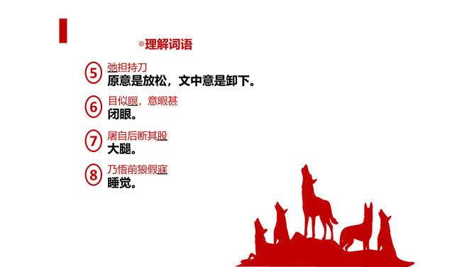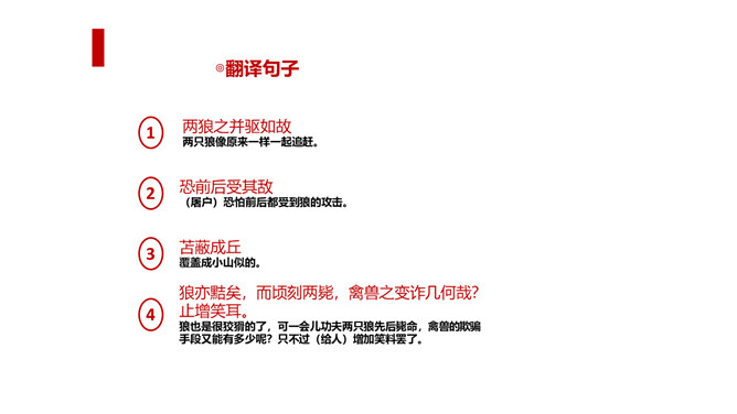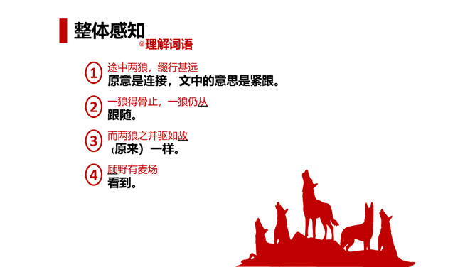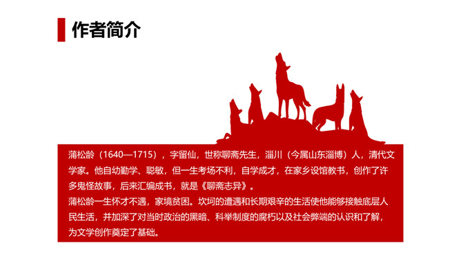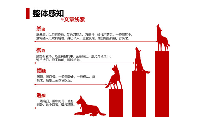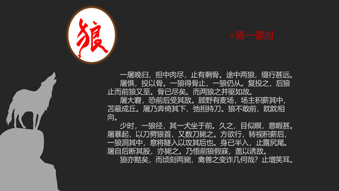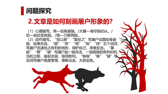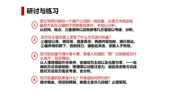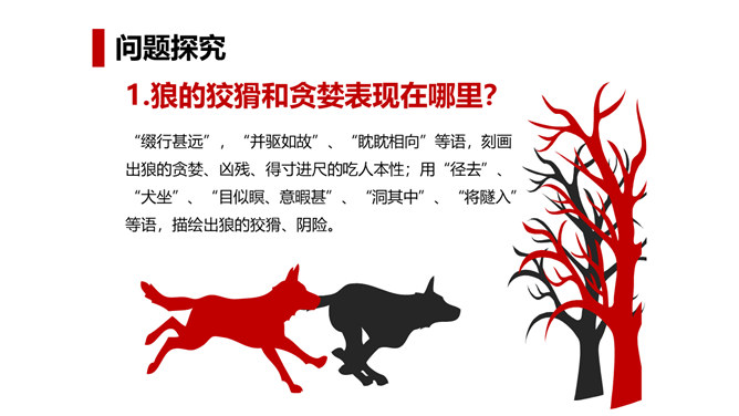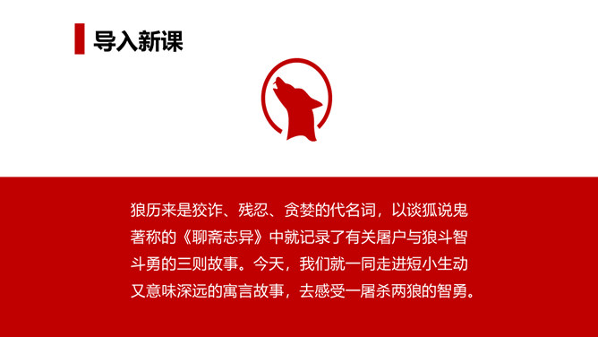 狼历来是狡诈、残忍、贪婪的代名词,以谈狐说鬼著称的《聊斋志异》中就记录了有关屠户与狼斗智斗勇的三则故事。今天,我们就一同走进短小生动又意味深远的寓言故事,去感受一屠杀两狼的智勇。课文写两只狼和一个屠户之间的一场较量,从课文中找出较量双方各自占据的不同的客观条件,并加以分析。从时间、地点、力量悬殊以及物资等几方面加以考虑、分析。双方在主观态度上采取了什么方式进行较量?双方的较量可谓斗智斗勇,看看人和狼的“智”分别表现在什么地方,说说理由。所属专题:狼ppt。