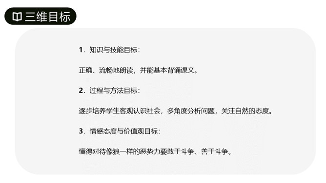 狼,自古以来被人们视为邪恶、残忍、贪婪的象征,什么“狼心狗肺”“狼狈为奸”“狼子野心”等等,足以显示人们对狼的痛恨。但是如果我们换一个角度想一下,狼的所谓“贪婪凶恶、狡诈阴险”其实只是它们在险恶的生存环境下的生存方式而已,那些关于“狼”的成语,用来形容人类当中的某些卑劣者,倒是挺合适的。现在我们知道,狼的一生是充满艰辛的。生活在野外,狼就必须经常与其他的狼争夺食物和领地。捕猎是危险的,有时也不免空腹而归,一无所获。研究表明,捕猎的成功率只有7%到10%。一旦捕猎成功,狼还必须警惕其他想不劳而获的动物的袭击。所属专题:狼ppt。