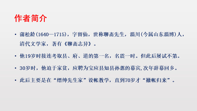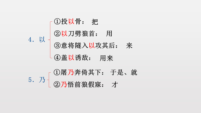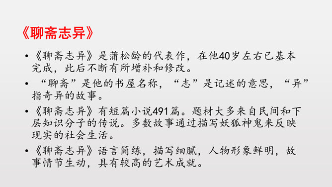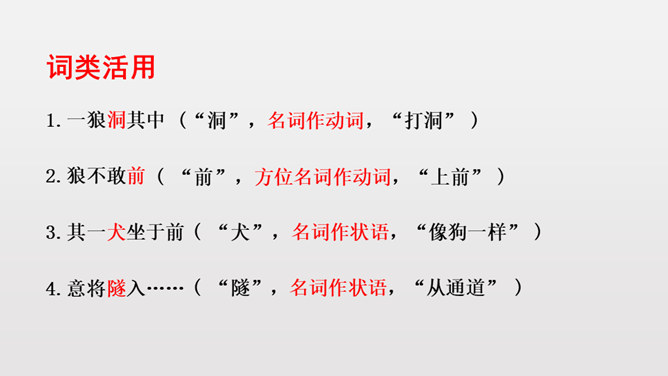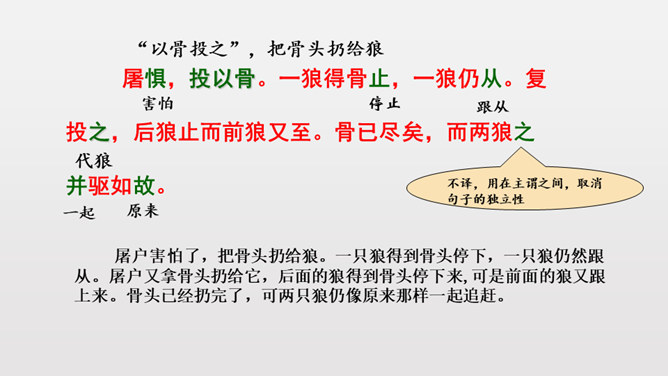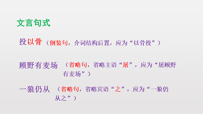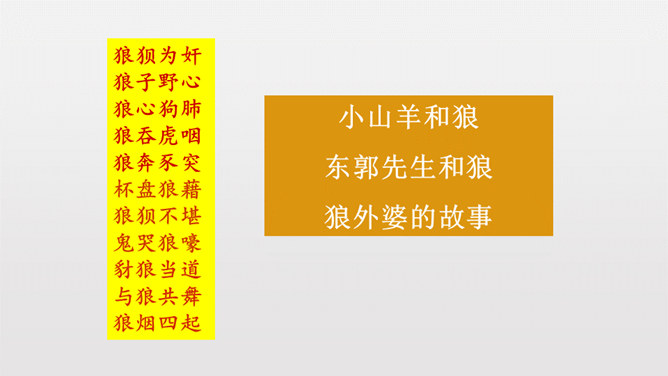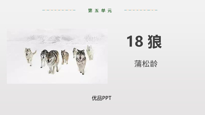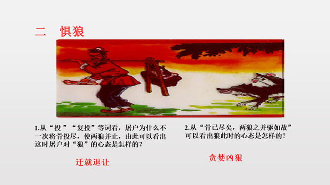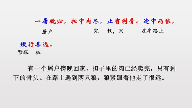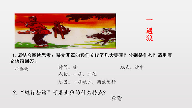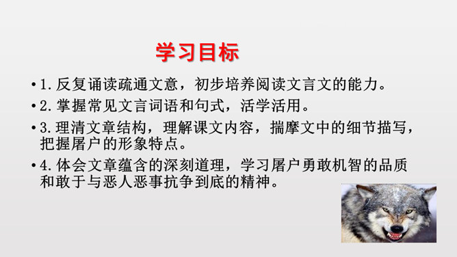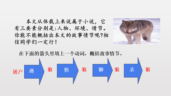1.反复诵读疏通文意,初步培养阅读文言文的能力。2.掌握常见文言词语和句式,活学活用。3.理清文章结构,理解课文内容,揣摩文中的细节描写,把握屠户的形象特点。4.体会文章蕴含的深刻道理,学习屠户勇敢机智的品质和敢于与恶人恶事抗争到底的精神。本文从体裁上来说属于小说,它有三要素分别是:人物、环境、情节。你能不能概括出本文的故事情节呢?相信同学们一定行!这个故事讽喻像狼一样的恶人,不论怎样狡诈,终归要失败的。所属专题:狼ppt。