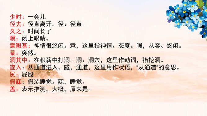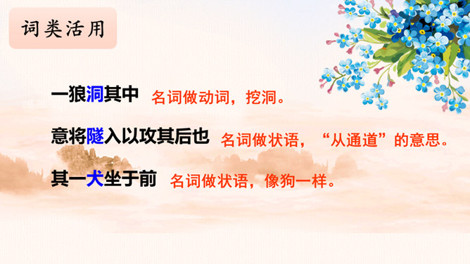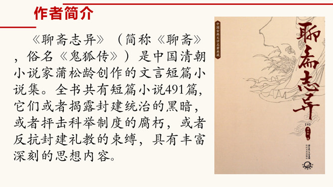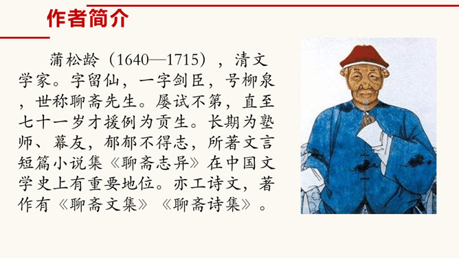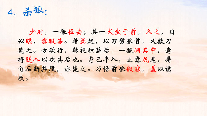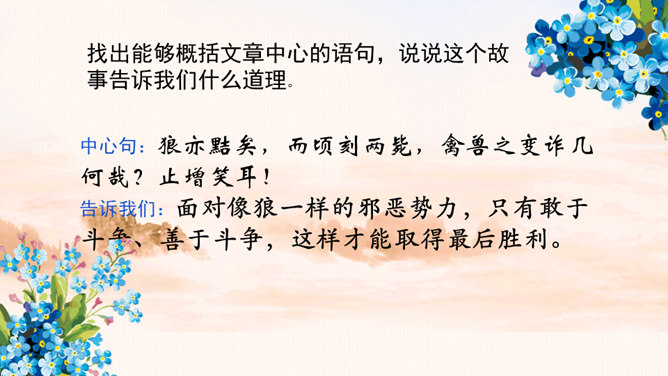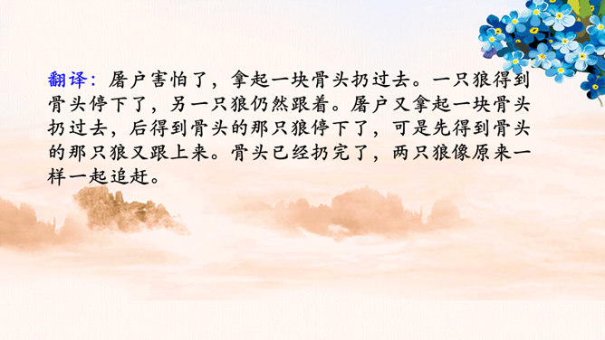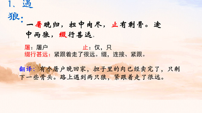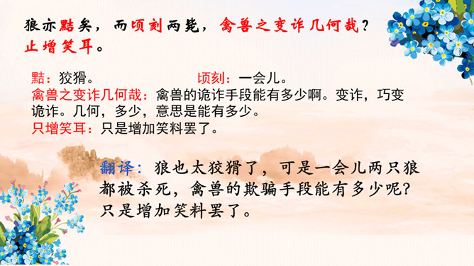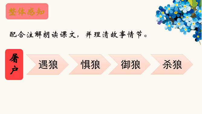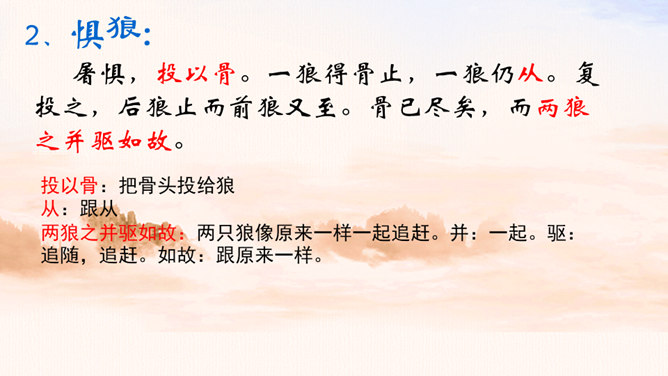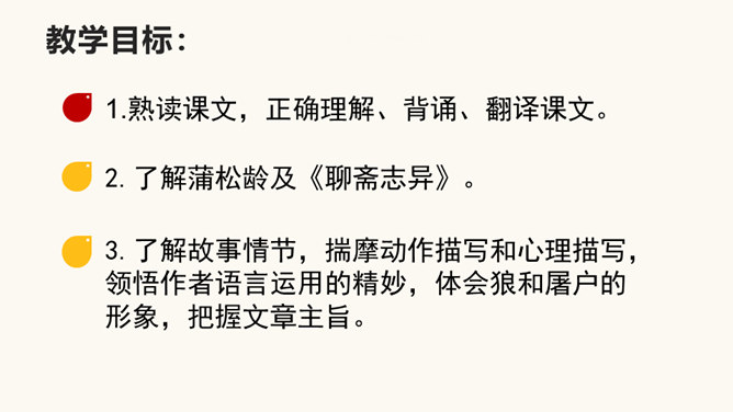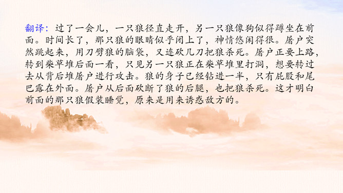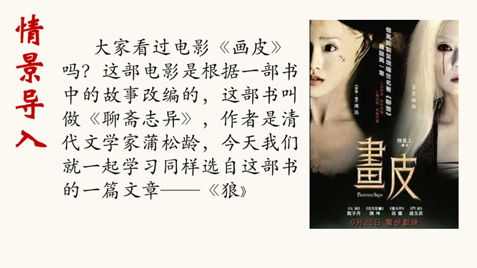 了解故事情节,揣摩动作描写和心理描写,领悟作者语言运用的精妙,体会狼和屠户的形象,把握文章主旨。熟读课文,正确理解、背诵、翻译课文。了解蒲松龄及《聊斋志异》。大家看过电影《画皮》吗?这部电影是根据一部书中的故事改编的,这部书叫做《聊斋志异》,作者是清代文学家蒲松龄,今天我们就一起学习同样选自这部书的一篇文章。找出能够概括文章中心的语句,说说这个故事告诉我们什么道理。下面是一些与狼有关的成语,你能再列举出几个来吗?从这些成语来看,在中国传统文化中,狼的形象是怎样的?你如何看待狼的这种传统形象。所属专题:狼ppt。