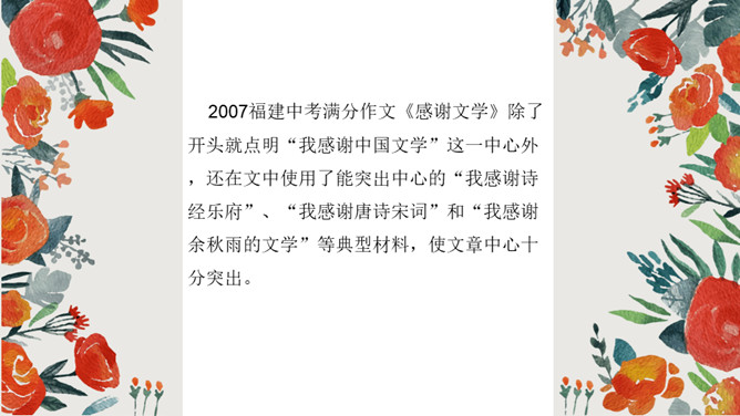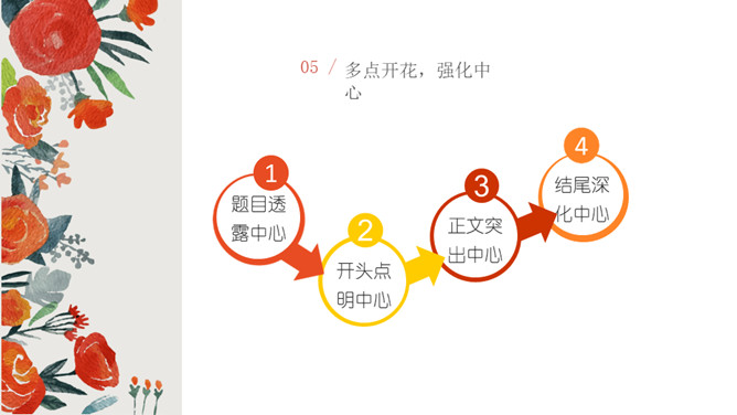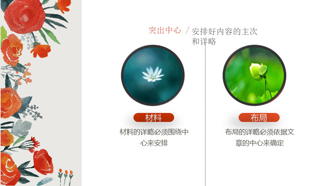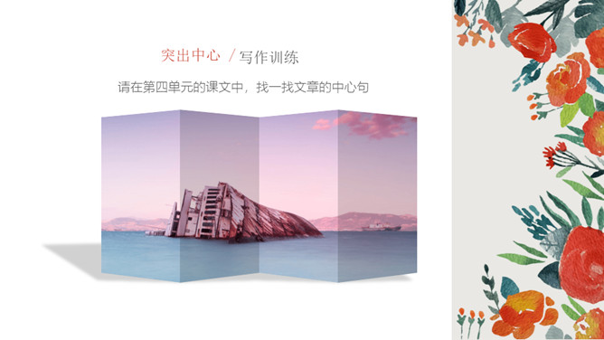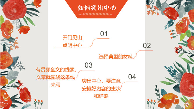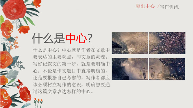 什么是中心?中心就是作者在文章中要表达的主要观点,即文章的灵魂。写好记叙文的第一步,就是要明确中心。不论是作文题目中直接明确的,还是要根据自己考虑的,写作者都应该必须树立写作的意识,明确想要通过这篇文章表达怎样的中心。请在第四单元的课文中,找一找文章的中心句。如何突出中心:开门见山,点明中心。选择典型的材料。有贯穿全文的线索,文章就围绕这条线来写。突出中心,要注意安排好内容的主次和详略。所属专题:如何突出中心ppt。