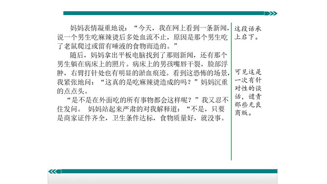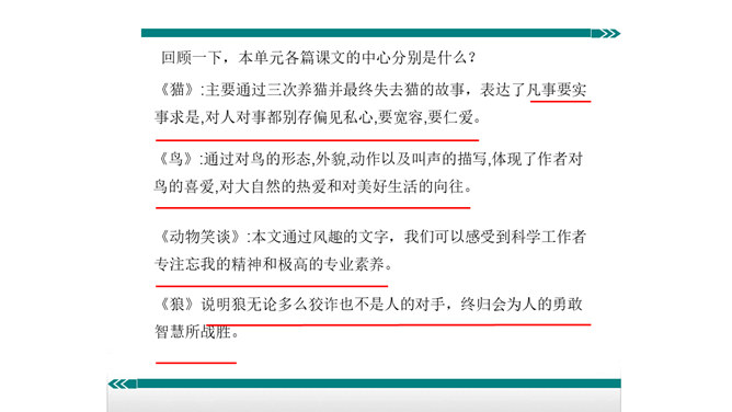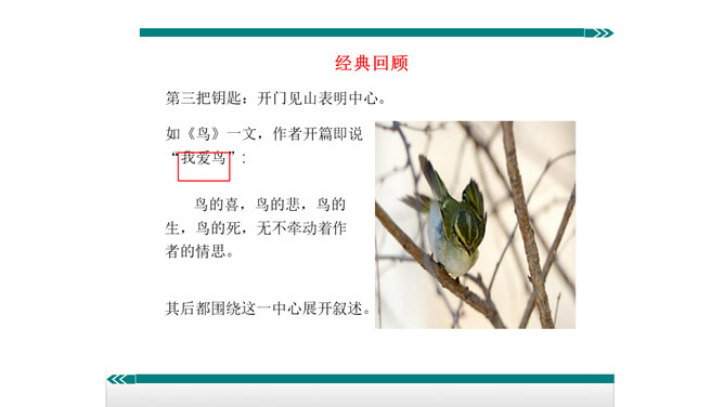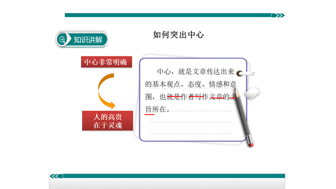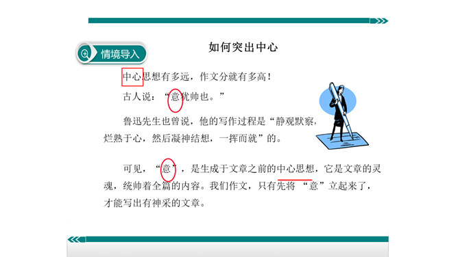 中心思想有多远,作文分就有多高!古人说:“意犹帅也。”鲁迅先生也曾说,他的写作过程是“静观默察,烂熟于心,然后凝神结想,一挥而就”的。可见,“意”,是生成于文章之前的中心思想,它是文章的灵魂,统帅着全篇的内容。我们作文,只有先将 “意”立起来了,才能写出有神采的文章。 1.通过训练、进一步学会写人记事,要有较明确的中心思想。2.学会根据中心审题、处理材料、重点描写 。中心,就是文章传达出来的基本观点、态度、情感和意图,也就是作者写作文章的主旨所在。所属专题:如何突出中心ppt。