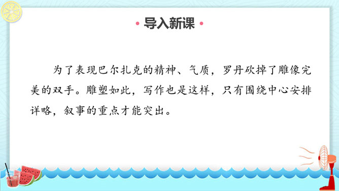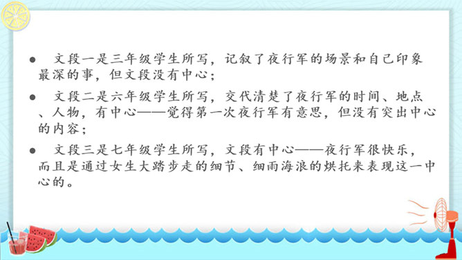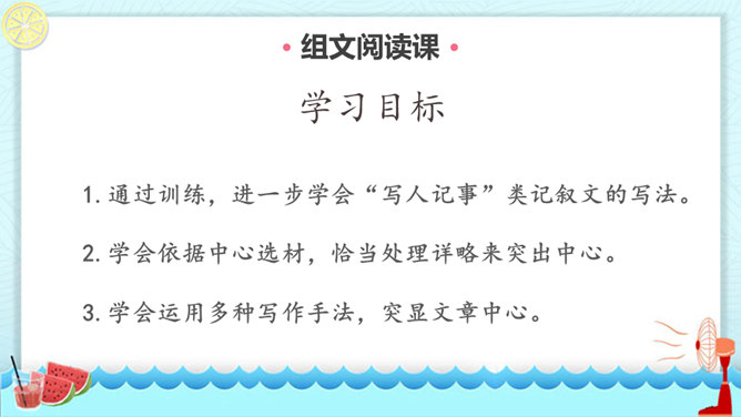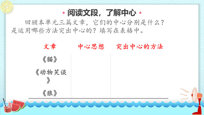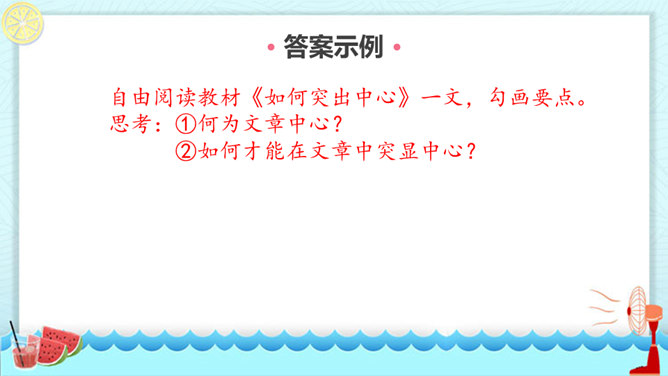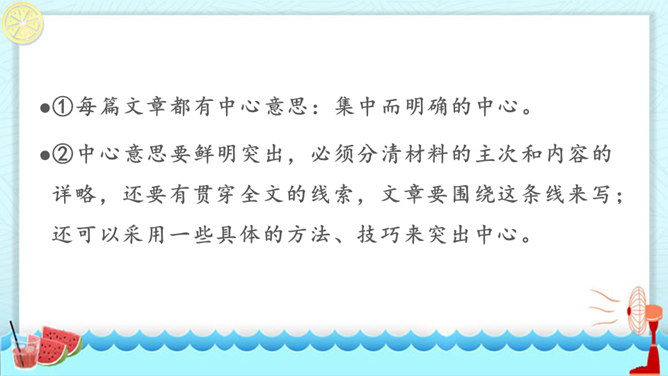 中心就是作者在文章中要表达的主要观点,即文章的灵魂。写好记叙文的第一步,就是要明确中心。有中心的文章如同有统帅的军队,相反,没有中心的文章就像乌合之众,溃不成军。每篇文章都有中心意思:集中而明确的中心。中心意思要鲜明突出,必须分清材料的主次和内容的详略,还要有贯穿全文的线索,文章要围绕这条线来写;还可以采用一些具体的方法、技巧来突出中心。回顾本单元三篇文章,它们的中心分别是什么?突出中心的方法:①设置线索,贯通全文。 ②详略得当,重点突出。③运用技巧,细致描绘。④议论抒情,卒章显志。所属专题:如何突出中心ppt。