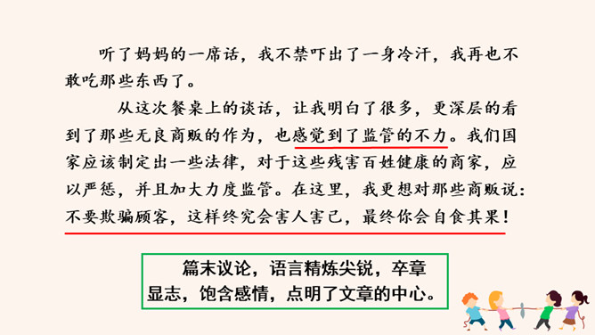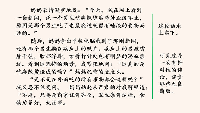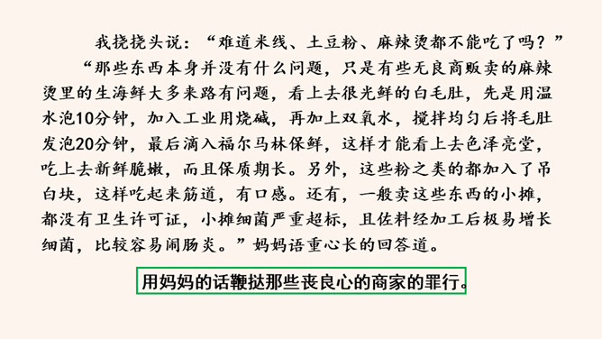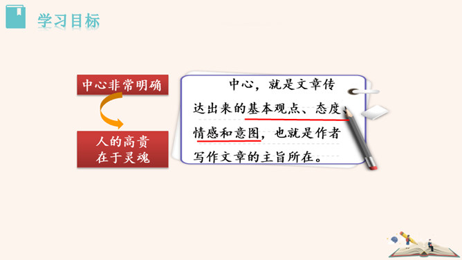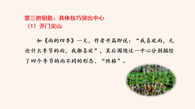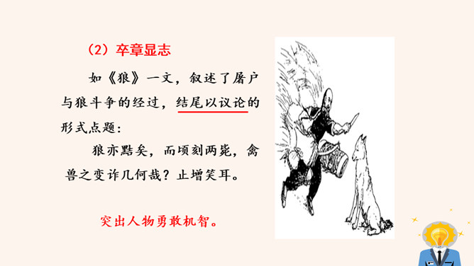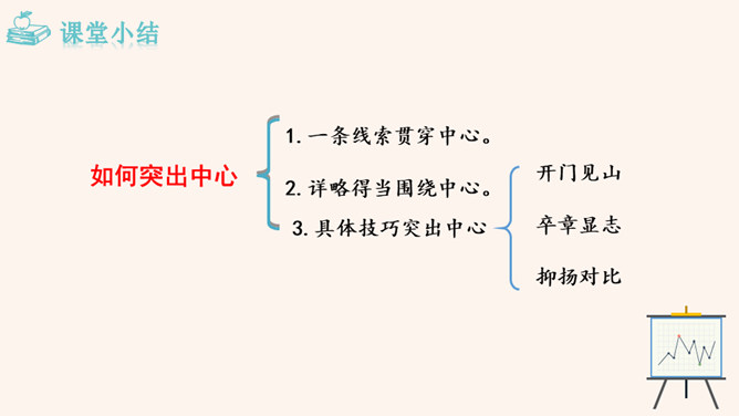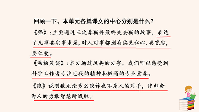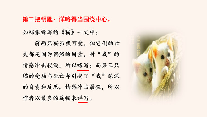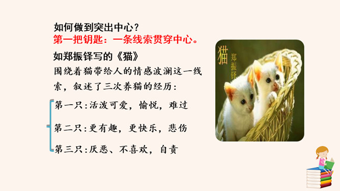 回顾一下,本单元各篇课文的中心分别是什么?《猫》:主要通过三次养猫并最终失去猫的故事,表达了凡事要实事求是,对人对事都别存偏见私心,要宽容,要仁爱。《动物笑谈》:本文通过风趣的文字,我们可以感受到科学工作者专注忘我的精神和极高的专业素养。《狼》说明狼无论多么狡诈也不是人的对手,终归会为人的勇敢智慧所战胜。如何做到突出中心?第一把钥匙:一条线索贯穿中心。第二把钥匙:详略得当围绕中心。所属专题:如何突出中心ppt。