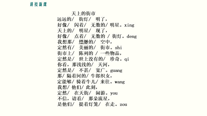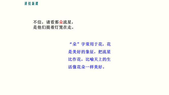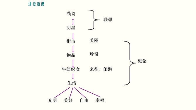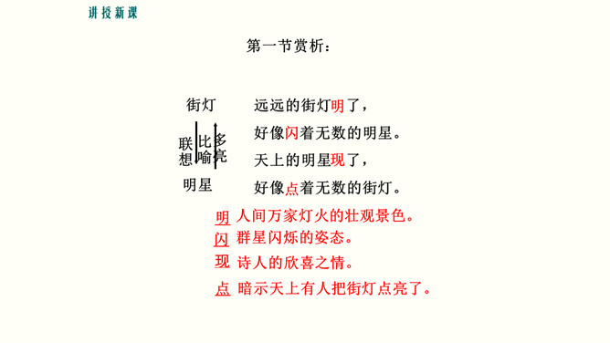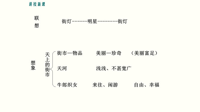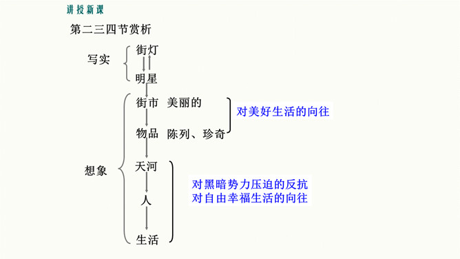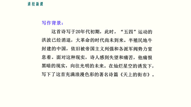 理解诗中联想和想象的运用,培养联想和想象的能力。培养对自由幸福美好生活的向往与追求,体会浪漫主义的创作特色。 你喜欢星光灿烂的夜晚吗?这首诗写于20年代初期,此时,“五四”运动的洪波已经消退,大革命的时代尚未到来。半殖民地牛封建的中国,依旧被帝国主义列强和各派军阀势力窒息着。面对这种现实,诗人感到失望和痛苦,他痛恨黑暗的现实,向往光明的未来。在灿烂星空的诱发下,写下了这首充满浪漫色彩的著名诗篇。所属专题:天上的街市ppt。