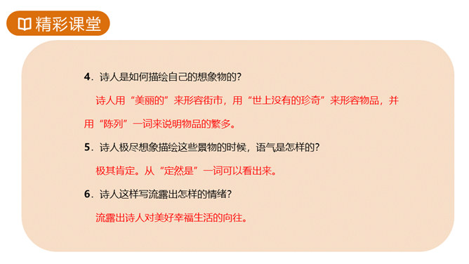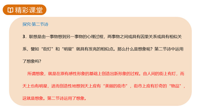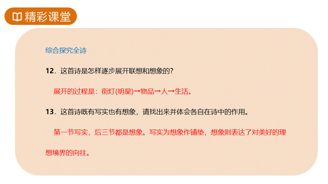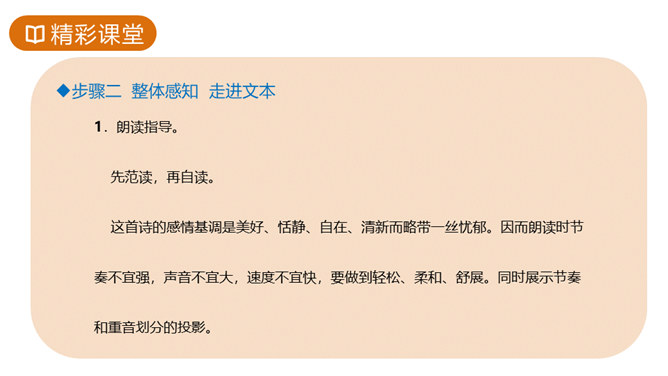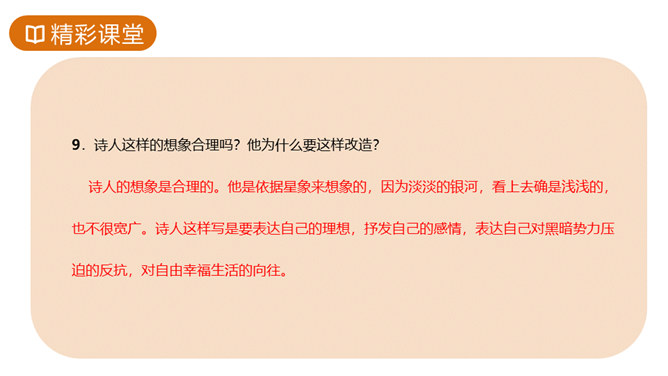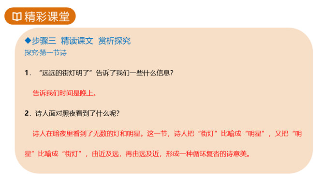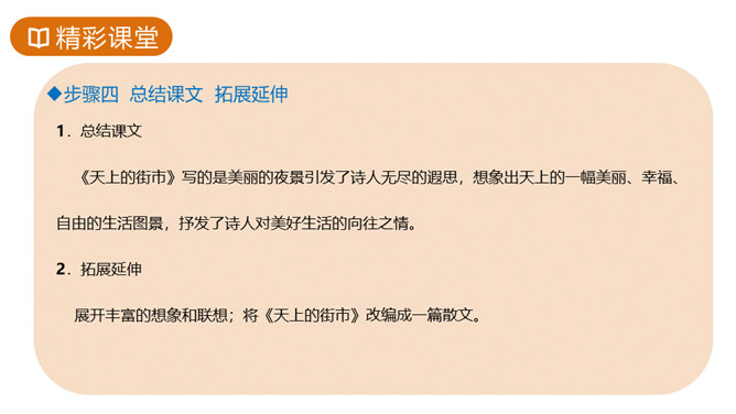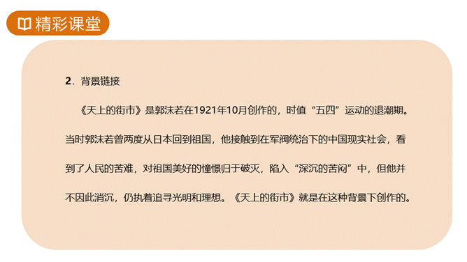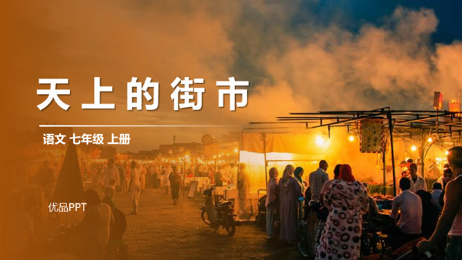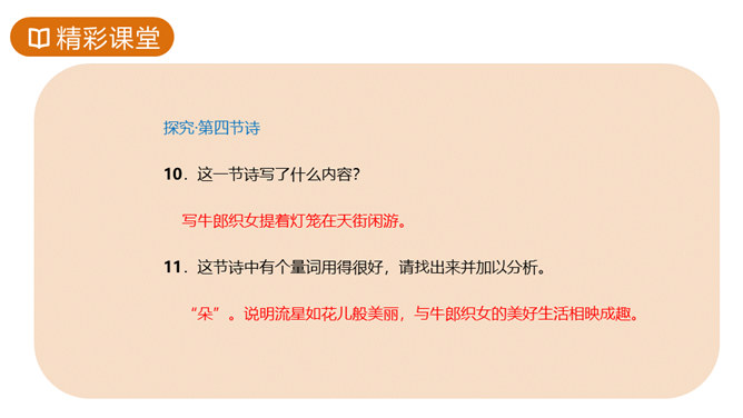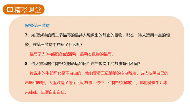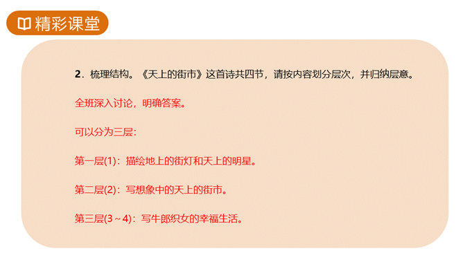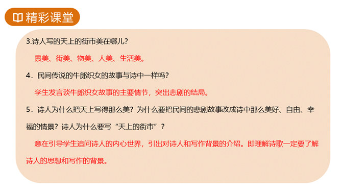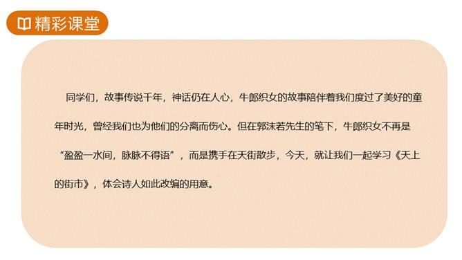 故事传说千年,神话仍在人心,牛郎织女的故事陪伴着我们度过了美好的童年时光,曾经我们也为他们的分离而伤心。但在郭沫若先生的笔下,牛郎织女不再是“盈盈一水间,脉脉不得语”,而是携手在天街散步,今天,就让我们一起学习,体会诗人如此改编的用意。这首诗的感情基调是美好、恬静、自在、清新而略带一丝忧郁。因而朗读时节奏不宜强,声音不宜大,速度不宜快,要做到轻松、柔和、舒展。同时展示节奏和重音划分的投影。所属专题:天上的街市ppt。