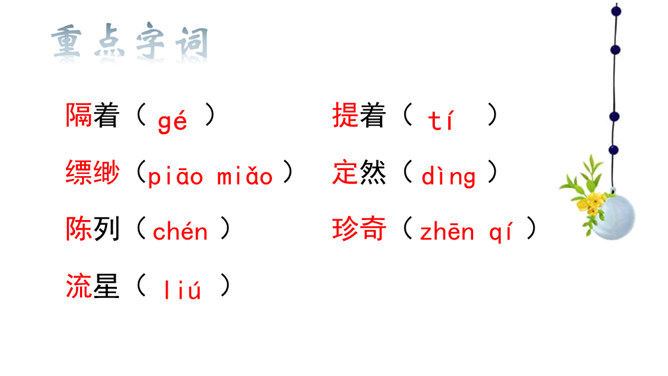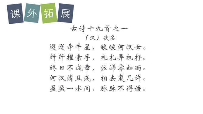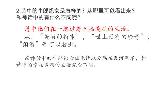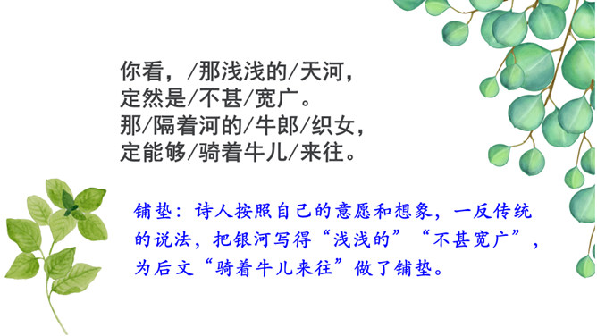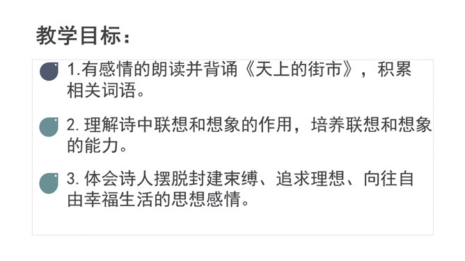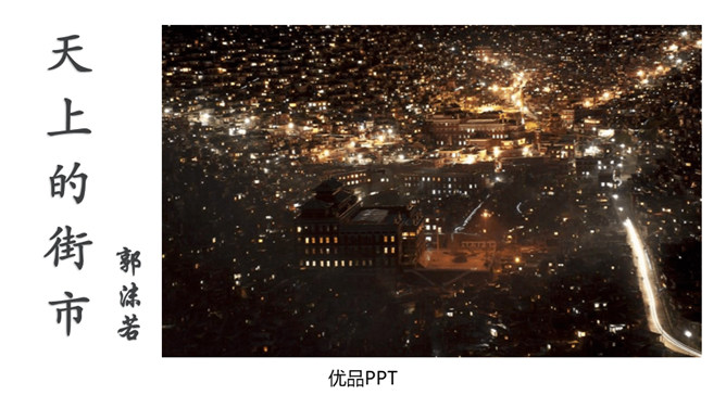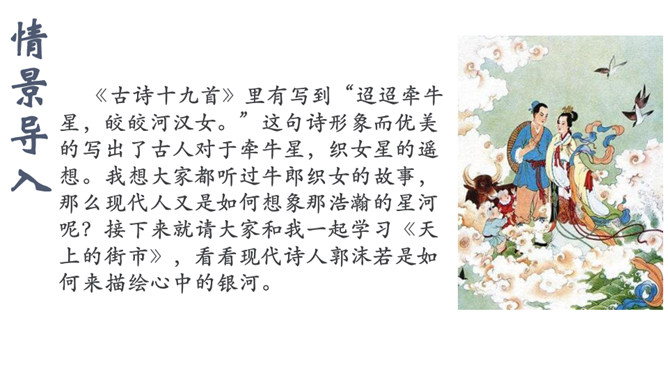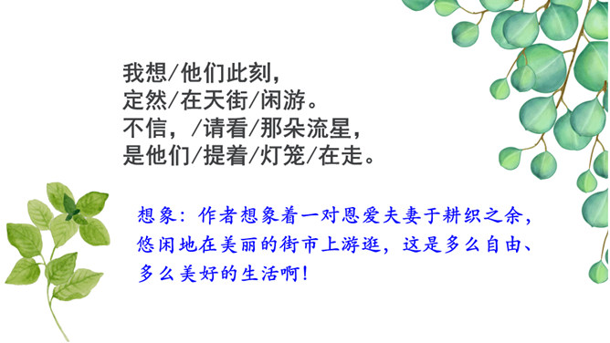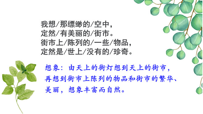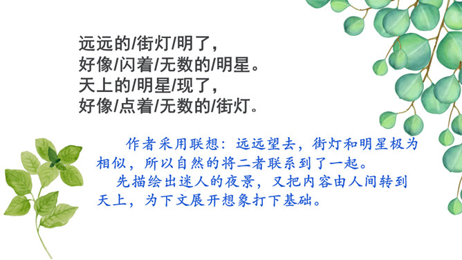 作者采用联想:远远望去,街灯和明星极为相似,所以自然的将二者联系到了一起。先描绘出迷人的夜景,又把内容由人间转到天上,为下文展开想象打下基础。由天上的街灯想到天上的街市,再想到街市上陈列的物品和街市的繁华、美丽,想象丰富而自然。诗人按照自己的意愿和想象,一反传统的说法,把银河写得“浅浅的”“不甚宽广”,为后文“骑着牛儿来往”做了铺垫。作者想象着一对恩爱夫妻于耕织之余,悠闲地在美丽的街市上游逛,这是多么自由、多么美好的生活啊!所属专题:天上的街市ppt。