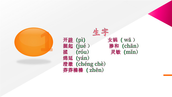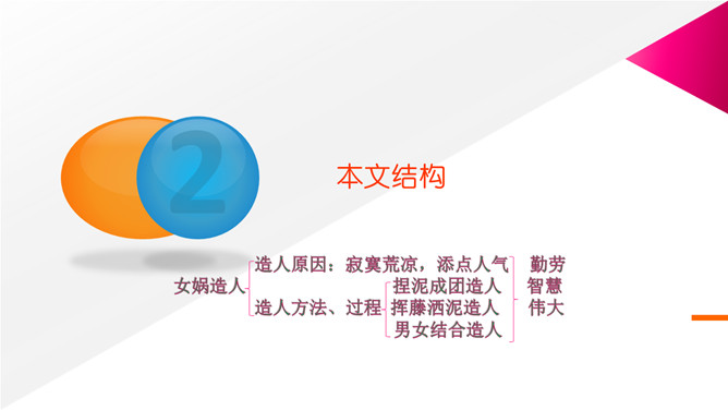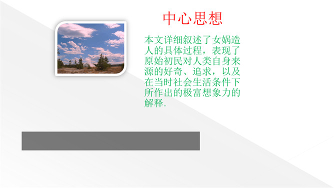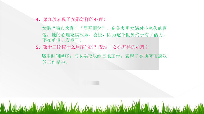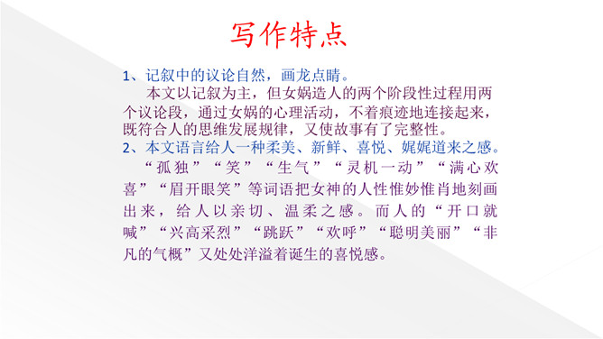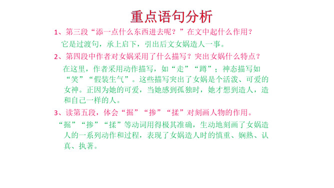 第三段“添一点什么东西进去呢?”在文中起什么作用?它是过渡句,承上启下,引出后文女娲造人一事。第四段中作者对女娲采用了什么描写?突出女娲什么特点?在这里,作者采用动作描写,如“走”“蹲”;神态描写如“笑”“假装生气”。这些描写突出了女娲是个活泼、可爱的女神。正因为她的可爱,当她感到孤独时,她才想到造人,造和自己一样的人。读第五段,体会“掘”“掺”“揉”对刻画人物的作用。“掘”“掺”“揉”等动词用得极其准确,生动地刻画了女娲造人的一系列动作和过程,表现了女娲造人时的慎重、娴熟、认真、执著。所属专题:女娲造人ppt。