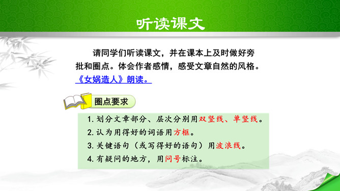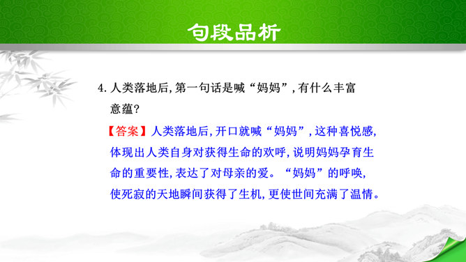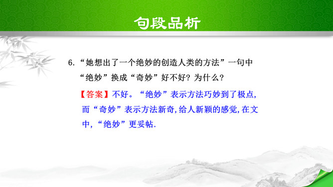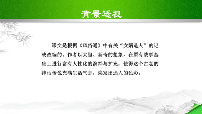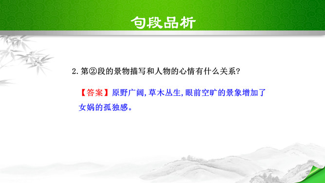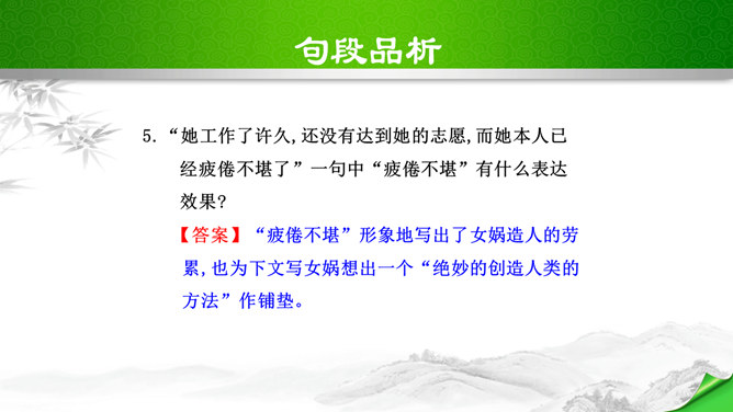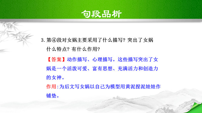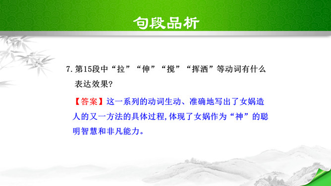 分析文中的女娲的形象。本题运用人物形象五分析法。女娲是文章的核心人物,她是神通广大的“神”,具有非凡的能力,她造人的手段、方法体现了“神”的威力,但是她也有人的情感、人的情怀。广阔的天地,莽莽榛榛的原野,死寂的气氛,使神通广大的女神感到了寂寞孤独;“人”的产生,使女娲体会到做母亲的自豪和欣慰;晚霞里,星光下,女娲的忙碌疲倦,正表现出一位母亲勤劳、智慧、伟大的特征。在女娲的身上,既体现了神的威力,也体现了人的品格。所属专题:女娲造人ppt。