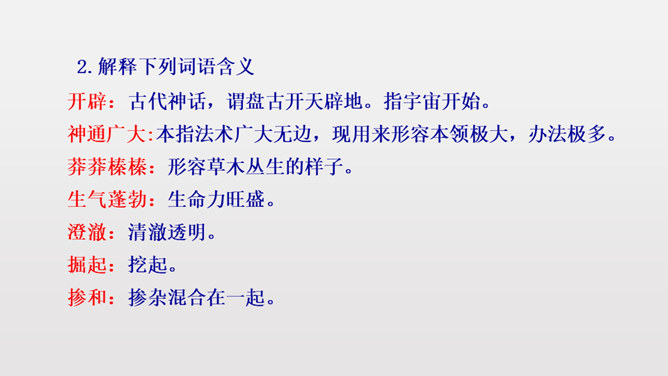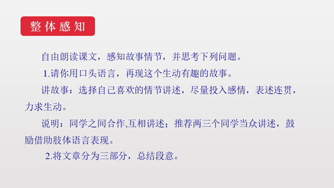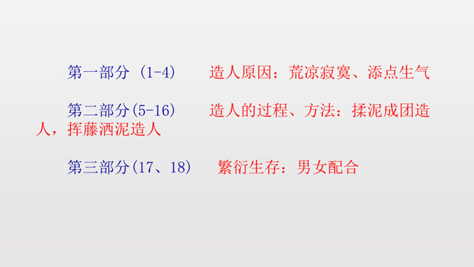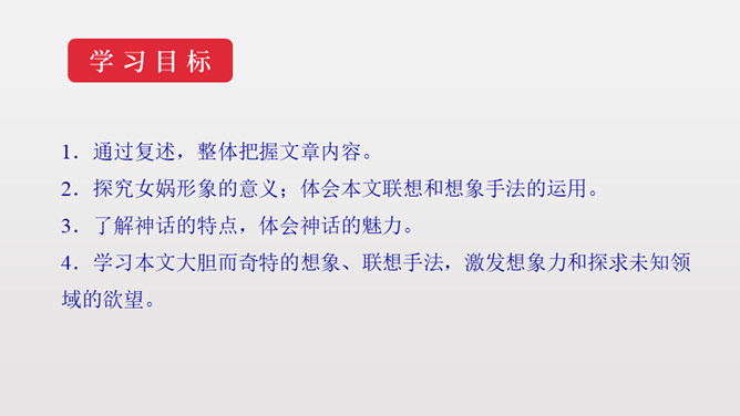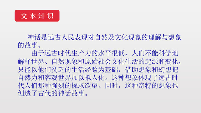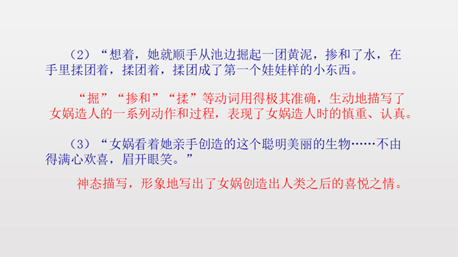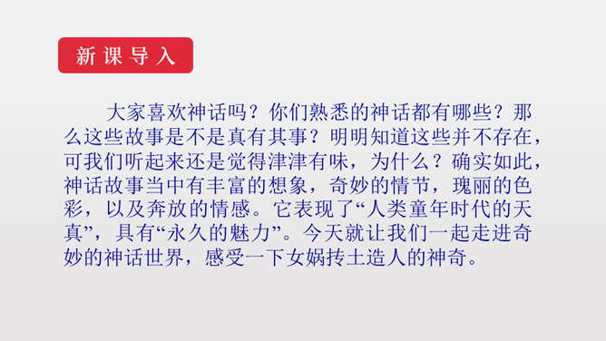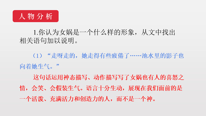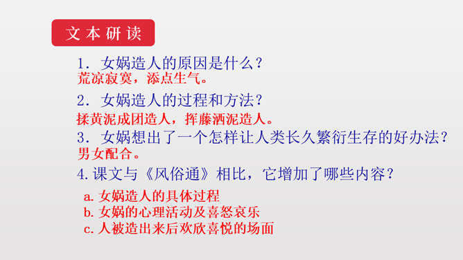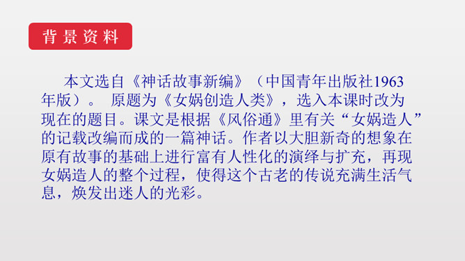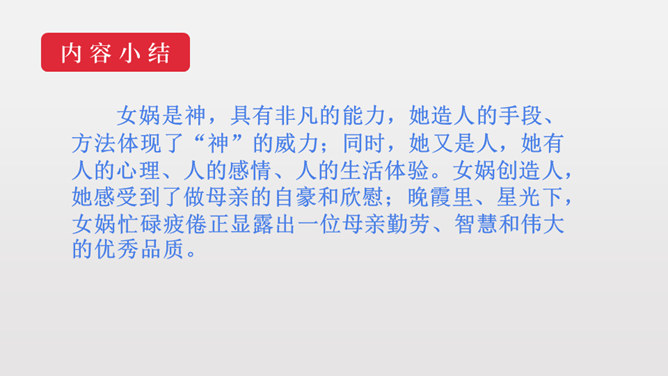 自由朗读课文,感知故事情节,并思考下列问题。1.请你用口头语言,再现这个生动有趣的故事。讲故事:选择自己喜欢的情节讲述,尽量投入感情,表述连贯,力求生动。说明:同学之间合作,互相讲述;推荐两三个同学当众讲述,鼓励借助肢体语言表现。2.将文章分为三部分,总结段意。女娲是神,具有非凡的能力,她造人的手段、方法体现了“神”的威力;同时,她又是人,她有人的心理、人的感情、人的生活体验。女娲创造人,她感受到了做母亲的自豪和欣慰;晚霞里、星光下,女娲忙碌疲倦正显露出一位母亲勤劳、智慧和伟大的优秀品质。所属专题:女娲造人ppt。