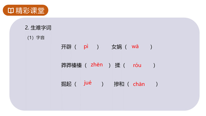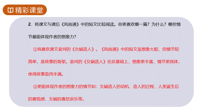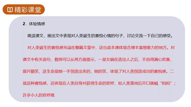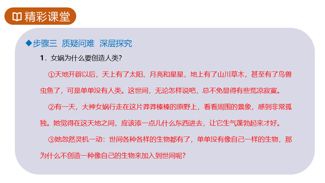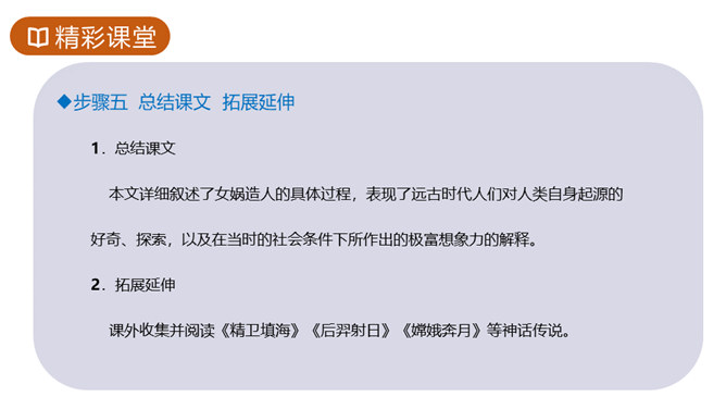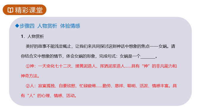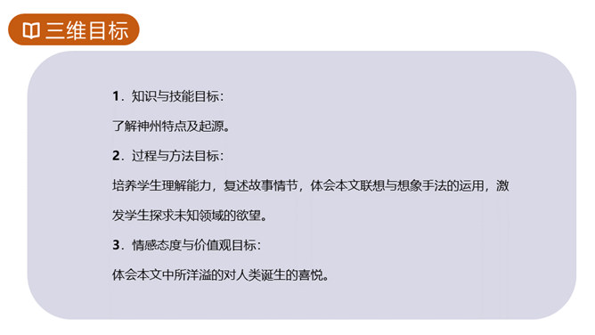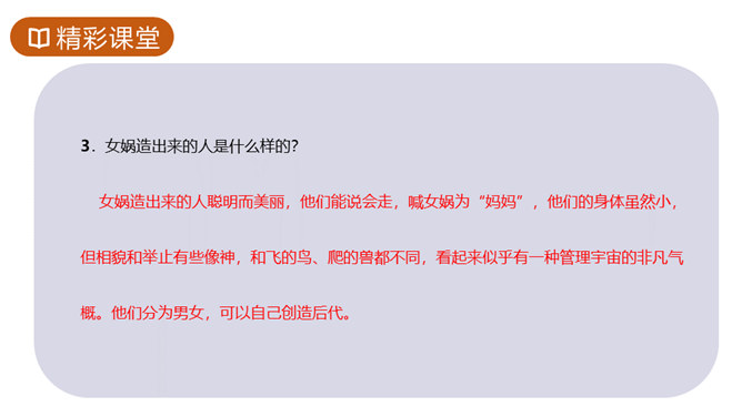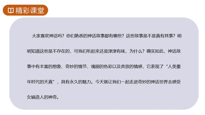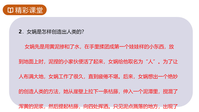 1.知识与技能目标:了解神州特点及起源。2.过程与方法目标:培养学生理解能力,复述故事情节,体会本文联想与想象手法的运用,激发学生探求未知领域的欲望。3.情感态度与价值观目标:体会本文中所洋溢的对人类诞生的喜悦。你们熟悉的神话故事都有哪些?这些故事是不是真有其事?明明知道这些是不存在的,可我们听起来还是津津有味,为什么?确实如此,神话故事中有丰富的想象、奇妙的情节、瑰丽的色彩以及奔放的情感,它表现了“人类童年时代的天真”,具有永久的魅力。今天就让我们一起走进奇妙的神话世界去感受女娲造人的神奇。所属专题:女娲造人ppt。