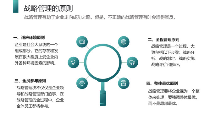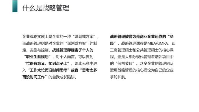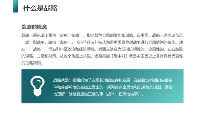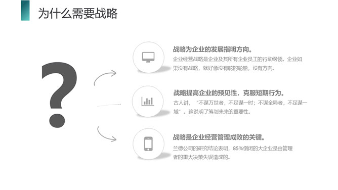 企业战略管理培训PPT模板。战略为企业的发展指明方向。企业经营战略是企业及其所有企业员工的行动纲领。企业如果没有战略,就好像没有舵的轮船,没有方向。