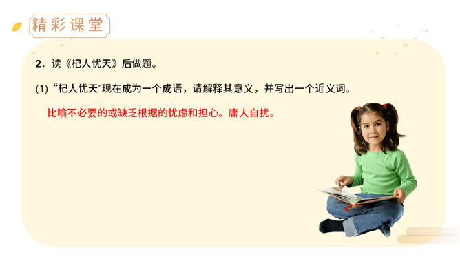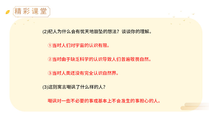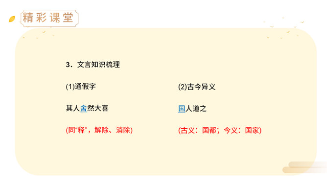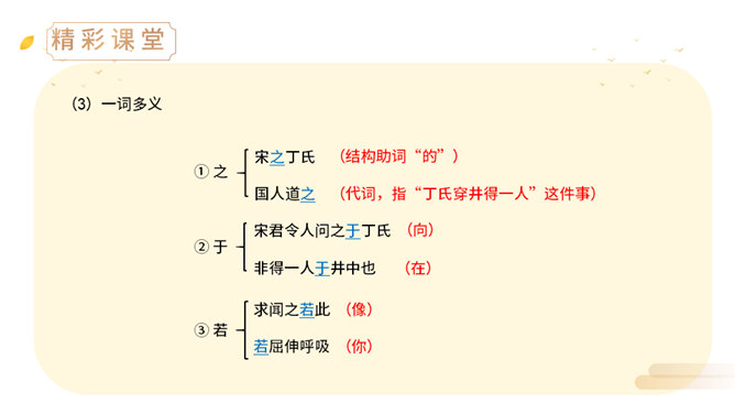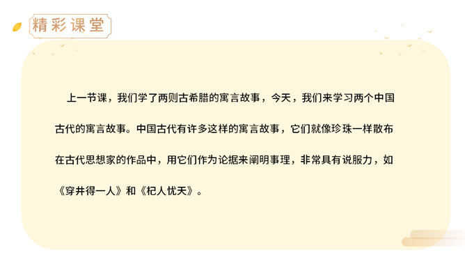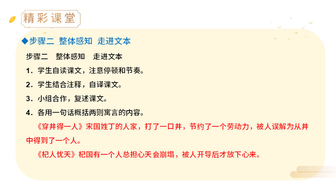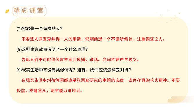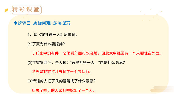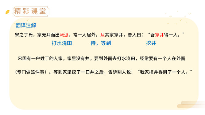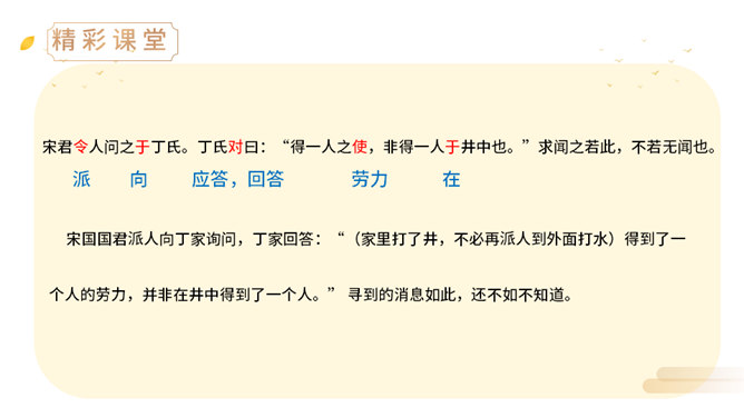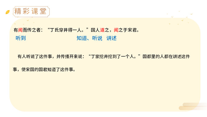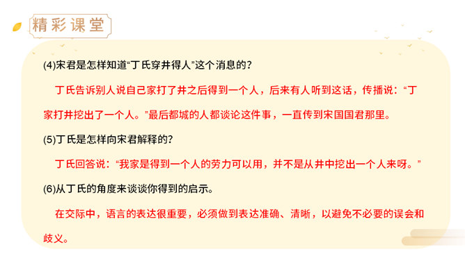 上一节课,我们学了两则古希腊的寓言故事,今天,我们来学习两个中国古代的寓言故事。中国古代有许多这样的寓言故事,它们就像珍珠一样散布在古代思想家的作品中,用它们作为论据来阐明事理,非常具有说服力。(1)丁家为什么要挖井?丁氏家中没有井,必须到外面打水浇地,因此家中经常有一个人要住在外面。(2)丁家穿井后,告人曰:“吾穿井得一人。”这是什么意思?意思是我家打井节省了一个劳动力。(3)传话的人把丁氏的话听成了什么意思?听成了姓丁的人家打井挖出了一个人。(4)宋君是怎样知道“丁氏穿井得人”这个消息的?