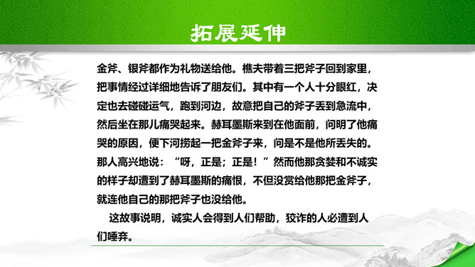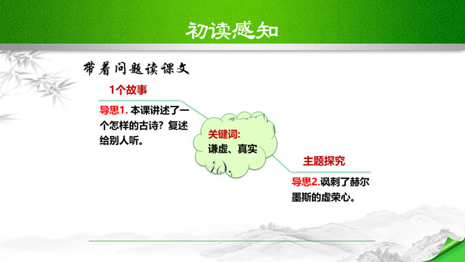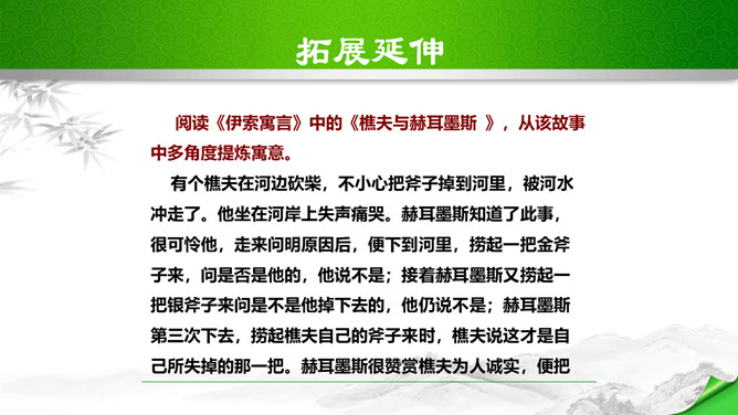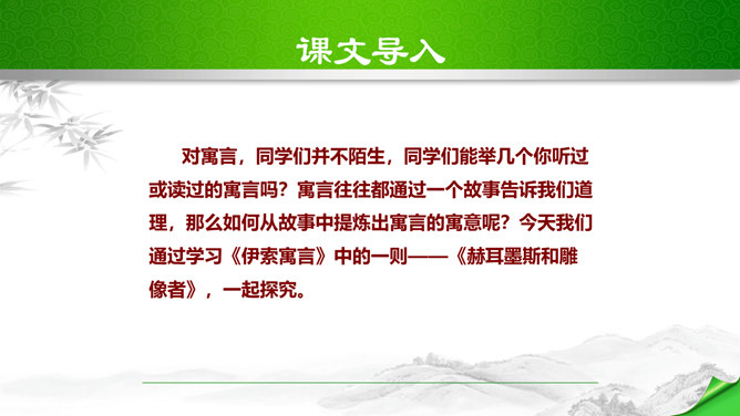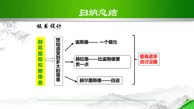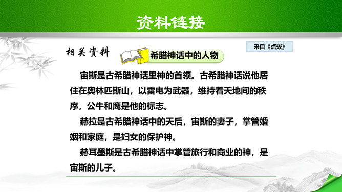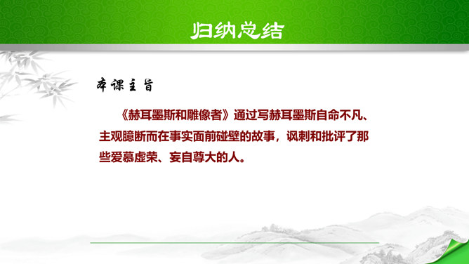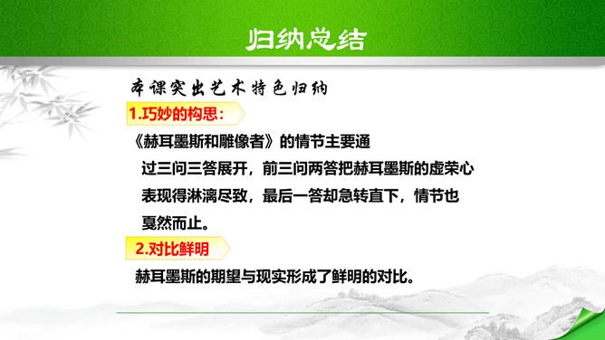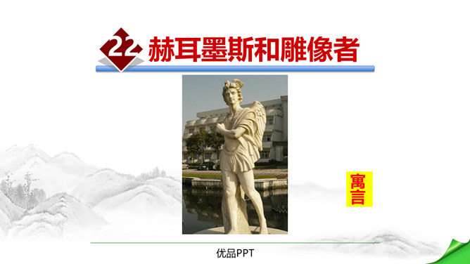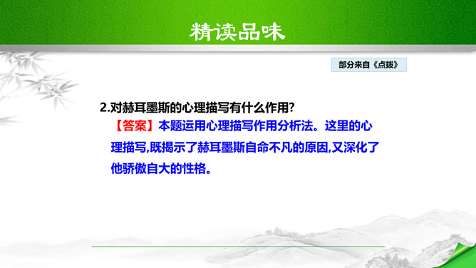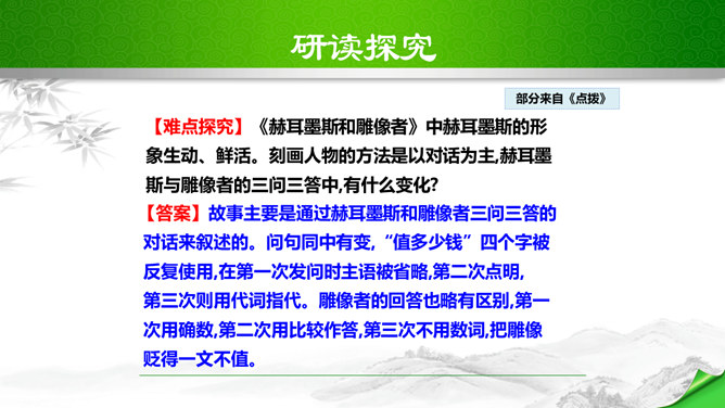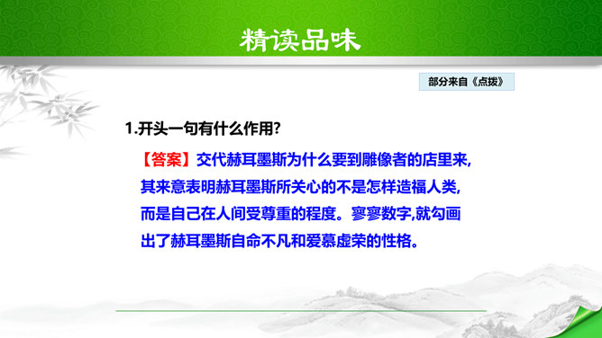 请同学们朗读课文,并在课本上及时做好旁批和圈点。体会作者感情,感受文章的风格。开头一句有什么作用?交代赫耳墨斯为什么要到雕像者的店里来,其来意表明赫耳墨斯所关心的不是怎样造福人类,而是自己在人间受尊重的程度。寥寥数字,就勾画出了赫耳墨斯自命不凡和爱慕虚荣的性格。对赫耳墨斯的心理描写有什么作用?本题运用心理描写作用分析法。这里的心理描写,既揭示了赫耳墨斯自命不凡的原因,又深化了他骄傲自大的性格。所属专题:赫尔墨斯和雕像者ppt。