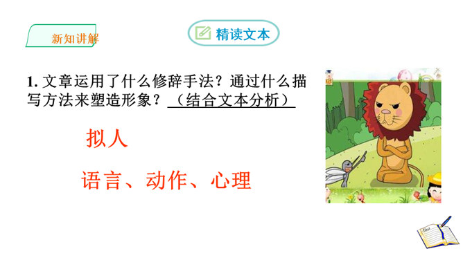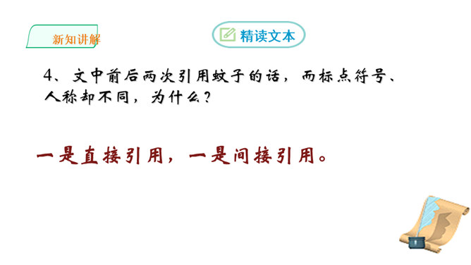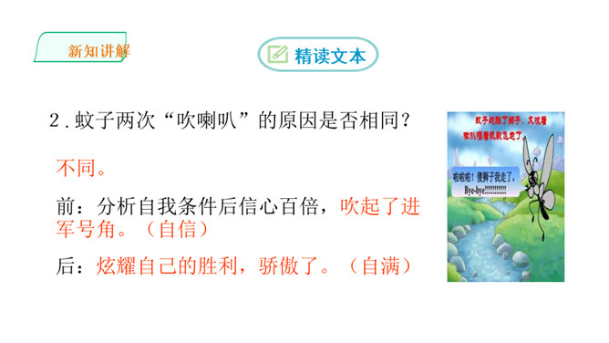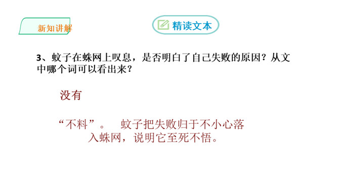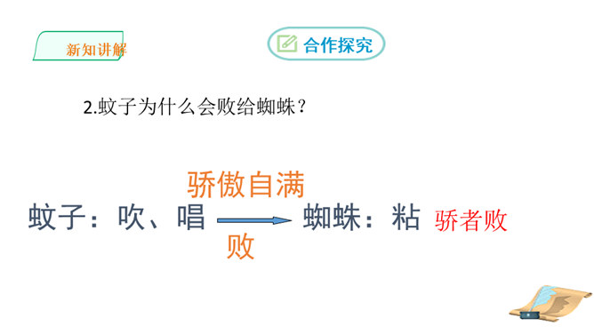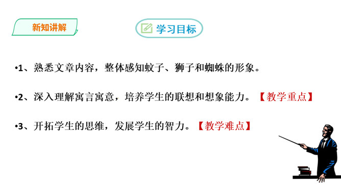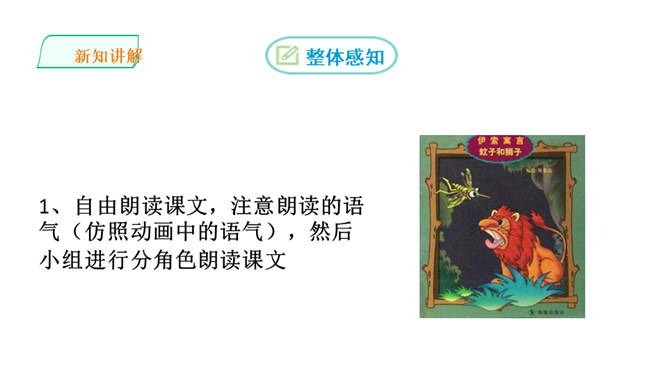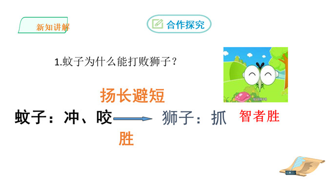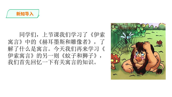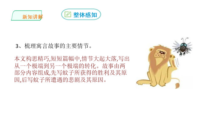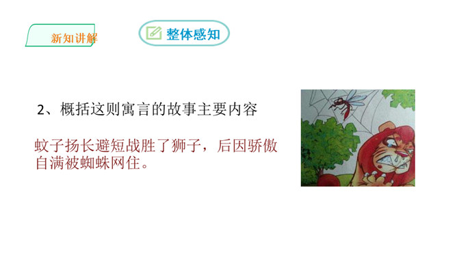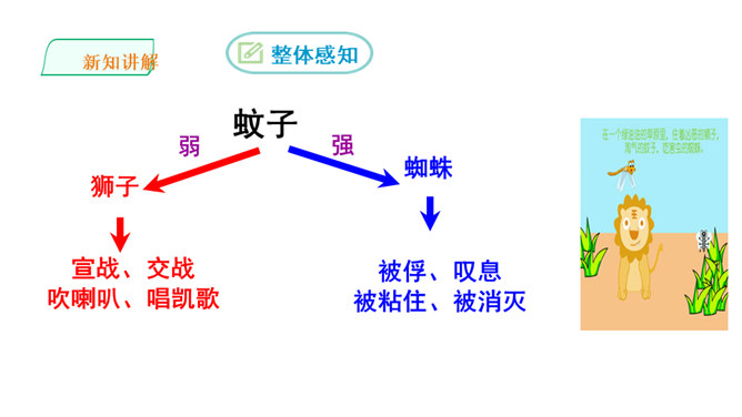 熟悉文章内容,整体感知蚊子、狮子和蜘蛛的形象。深入理解寓言寓意,培养学生的联想和想象能力。 开拓学生的思维,发展学生的智力。自由朗读课文,注意朗读的语气(仿照动画中的语气),然后小组进行分角色朗读课文。概括这则寓言的故事主要内容 。蚊子扬长避短战胜了狮子,后因骄傲自满被蜘蛛网住。蚊子在蛛网上叹息,是否明白了自己失败的原因?从文中哪个词可以看出来?文中前后两次引用蚊子的话,而标点符号、人称却不同,为什么?一是直接引用,一是间接引用。所属专题:蚊子和狮子ppt。