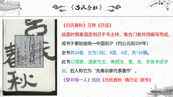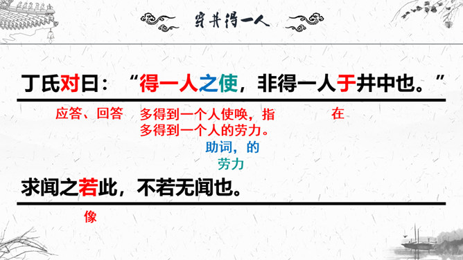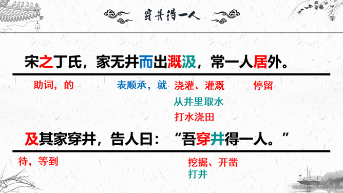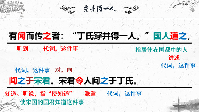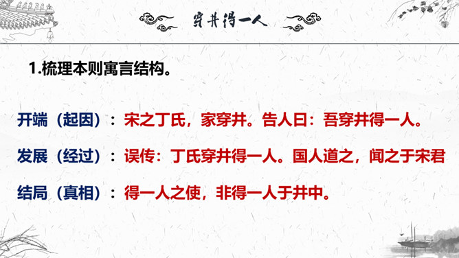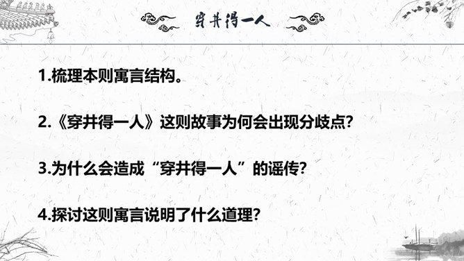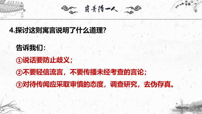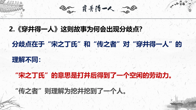 1.梳理本则寓言结构。2.这则故事为何会出现分歧点?3.为什么会造成“穿井得一人”的谣传?4.探讨这则寓言说明了什么道理?这则故事为何会出现分歧点?分歧点在于“宋之丁氏”和“传之者”对“穿井得一人”的理解不同:“宋之丁氏”的意思是打井后得到了一个空闲的劳动力。“传之者”则理解为挖井挖到了一个人。为什么会造成“穿井得一人”的谣传?①丁氏对此表述不清楚。②“有闻而传之者”未经调查分析就传播出去。③“国人”乐于接受这种离奇的传闻,于是愈传愈广。探讨这则寓言说明了什么道理?所属专题:穿井得一人ppt。