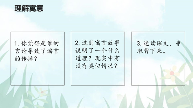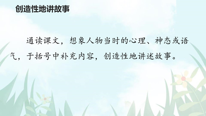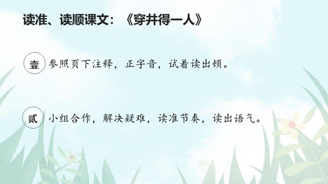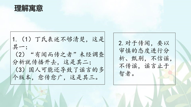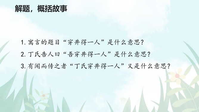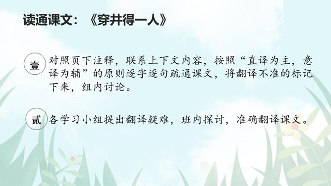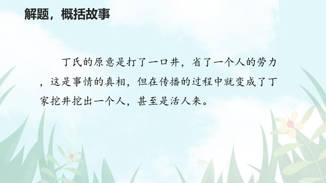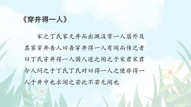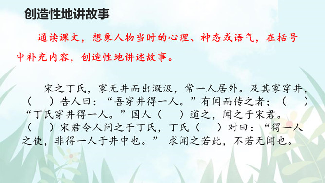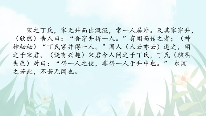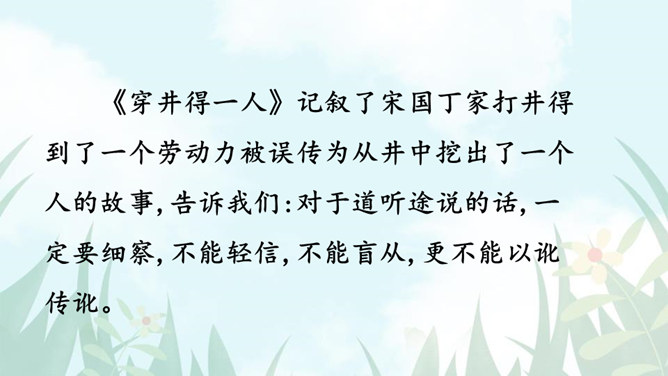 对照页下注释,联系上下文内容,按照“直译为主,意译为辅”的原则逐字逐句疏通课文,将翻译不准的标记下来,组内讨论。各学习小组提出翻译疑难,班内探讨,准确翻译课文。通读课文,想象人物当时的心理、神态或语气,于括号中补充内容,创造性地讲述故事。记叙了宋国丁家打井得到了一个劳动力被误传为从井中挖出了一个人的故事,告诉我们:对于道听途说的话,一定要细察,不能轻信,不能盲从,更不能以讹传讹。所属专题:穿井得一人ppt。