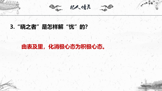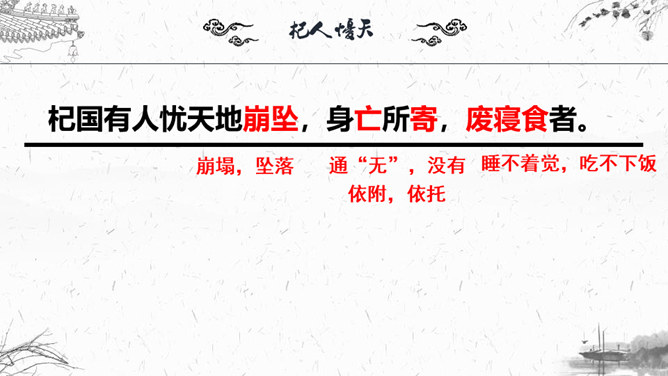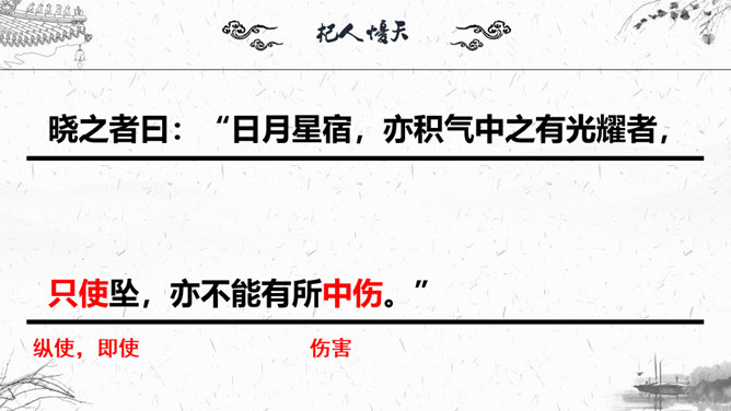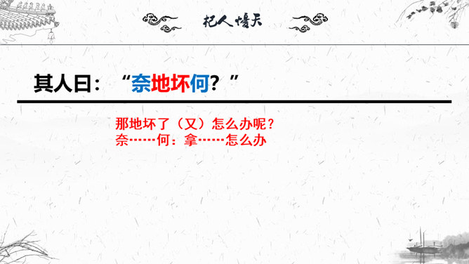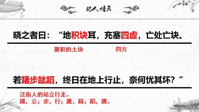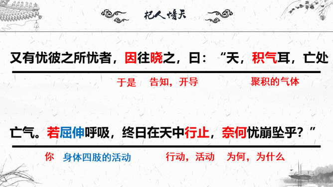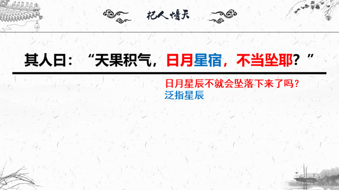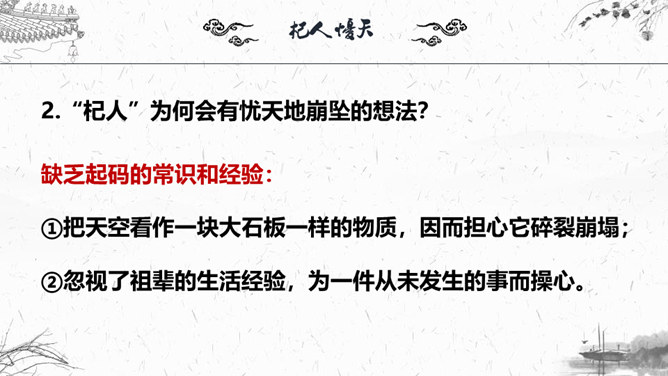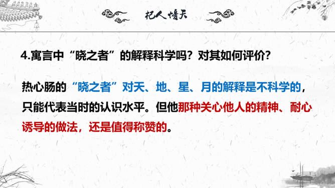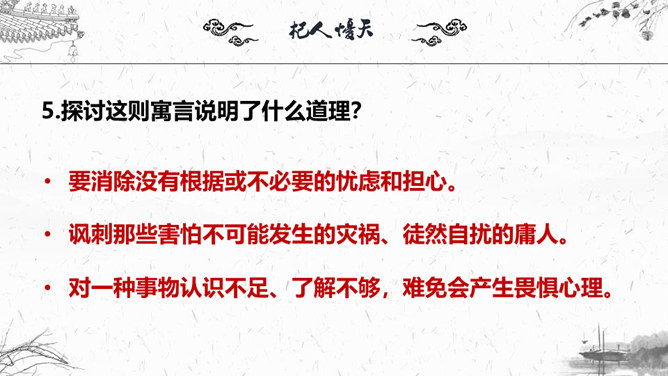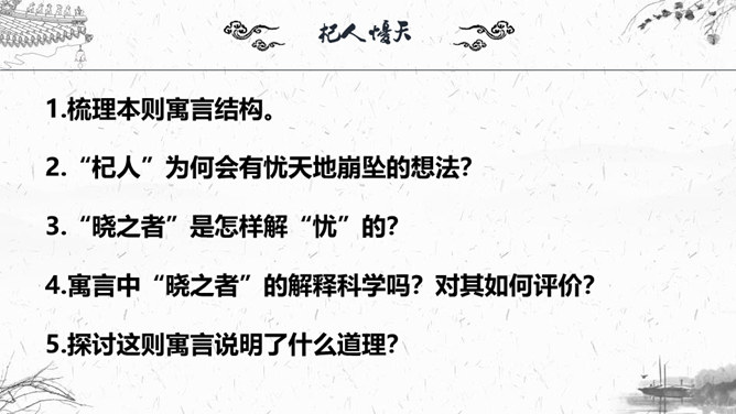 1.梳理本则寓言结构。2.“杞人”为何会有忧天地崩坠的想法?3.“晓之者”是怎样解“忧”的?4.寓言中“晓之者”的解释科学吗?对其如何评价?5.探讨这则寓言说明了什么道理?故事起因:有个杞国人担心:有一天天崩地陷,自己没有地方可以依靠,急得吃不下饭,睡不着觉;故事发展:有一个热心人听说此事去开导杞人;故事结局:杞人的担心没有了。“杞人”为何会有忧天地崩坠的想法?缺乏起码的常识和经验:把天空看作一块大石板一样的物质,因而担心它碎裂崩塌;忽视了祖辈的生活经验,为一件从未发生的事而操心。所属专题:杞人忧天ppt。