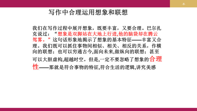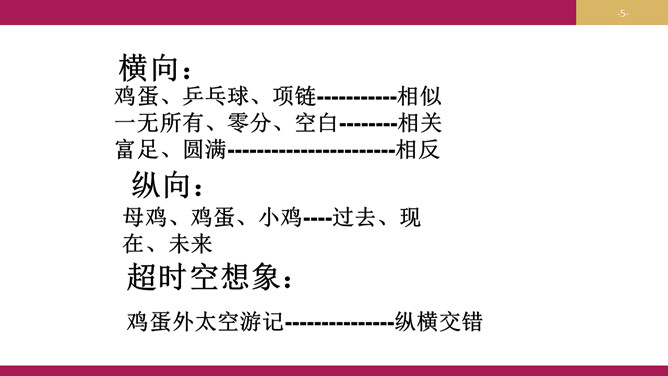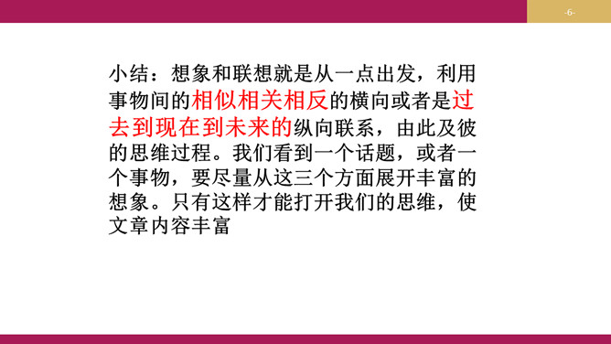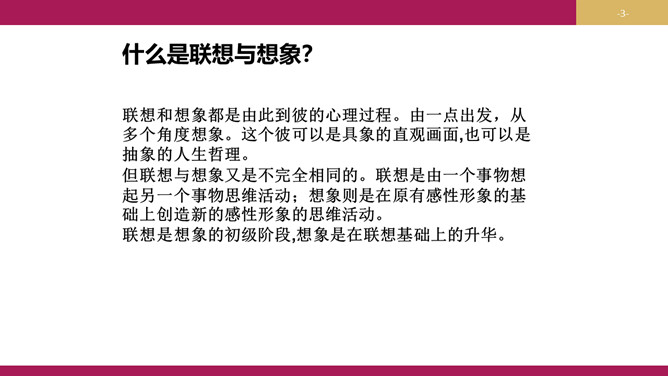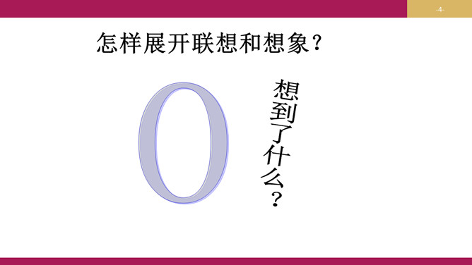 由这条波浪线,你们可以想到什么?由一段短短的波浪线,我们可以想到大海的波涛、蜿蜒的小路、学习成绩的起伏不定、音乐跳动的旋律、也可以想到曲折的人生之路 ……联想和想象都是由此到彼的心理过程。由一点出发,从多个角度想象。这个彼可以是具象的直观画面,也可以是抽象的人生哲理。但联想与想象又是不完全相同的。联想是由一个事物想起另一个事物思维活动;想象则是在原有感性形象的基础上创造新的感性形象的思维活动。联想是想象的初级阶段,想象是在联想基础上的升华。所属专题:发挥联想和想象ppt。