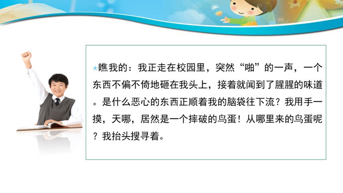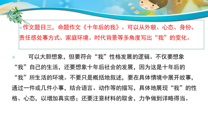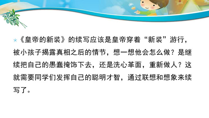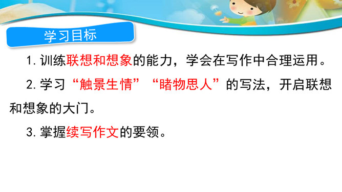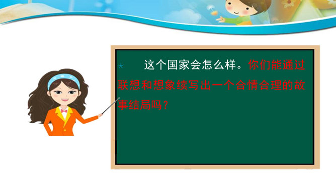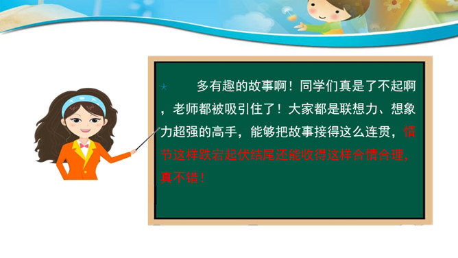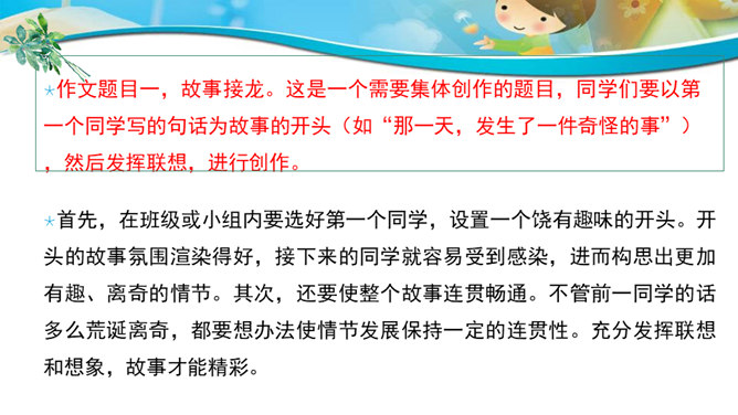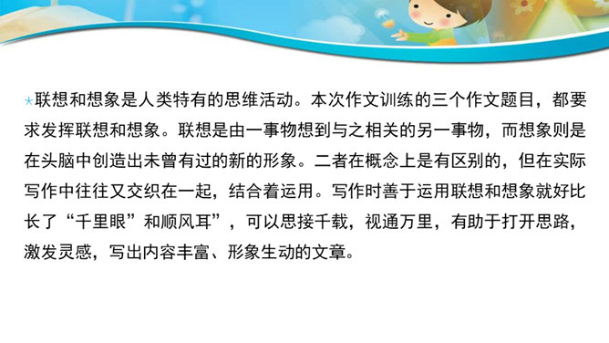 联想和想象是人类特有的思维活动。本次作文训练的三个作文题目,都要求发挥联想和想象。联想是由一事物想到与之相关的另一事物,而想象则是在头脑中创造出未曾有过的新的形象。二者在概念上是有区别的,但在实际写作中往往又交织在一起,结合着运用。写作时善于运用联想和想象就好比长了“千里眼”和顺风耳”,可以思接千载,视通万里,有助于打开思路,激发灵感,写出内容丰富、形象生动的文章。同学们都喜欢做游戏吧?今天我们来玩一个非常有趣的语文游戏,游戏的名字就叫“故事接龙”。所属专题:发挥联想和想象ppt。