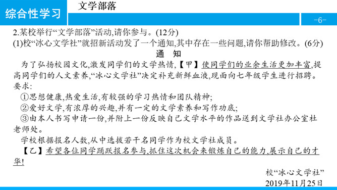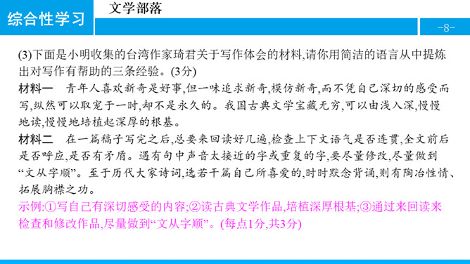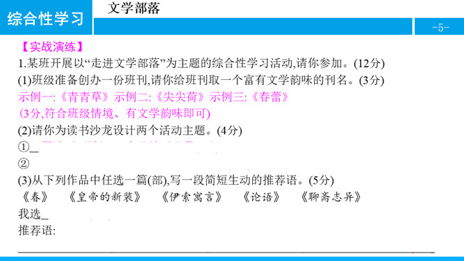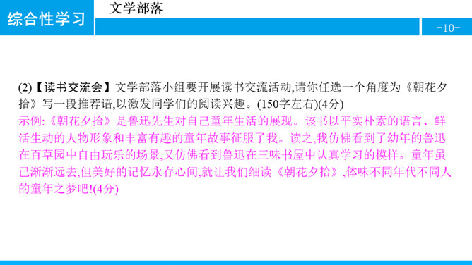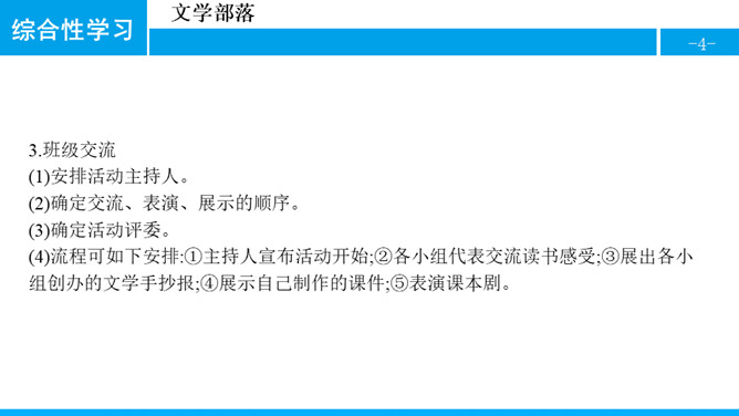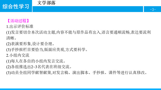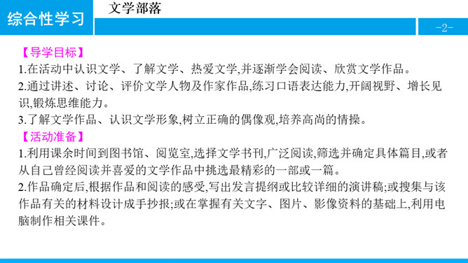 导学目标:1.在活动中认识文学、了解文学、热爱文学,并逐渐学会阅读、欣赏文学作品。2.通过讲述、讨论、评价文学人物及作家作品,练习口语表达能力,开阔视野、增长见识,锻炼思维能力。3.了解文学作品、认识文学形象,树立正确的偶像观,培养高尚的情操。活动准备:1.利用课余时间到图书馆、阅览室,选择文学书刊,广泛阅读,筛选并确定具体篇目,或者从自己曾经阅读并喜爱的文学作品中挑选最精彩的一部或一篇。2.作品确定后,根据作品和阅读的感受,写出发言提纲或比较详细的演讲稿;或搜集与该作品有关的材料设计成手抄报。所属专题:文学部落ppt。