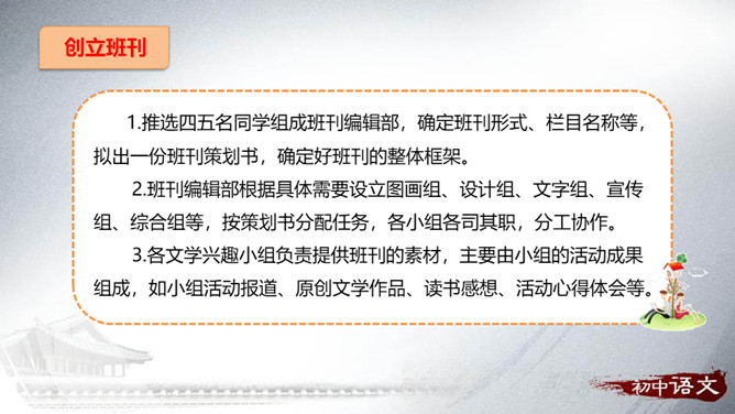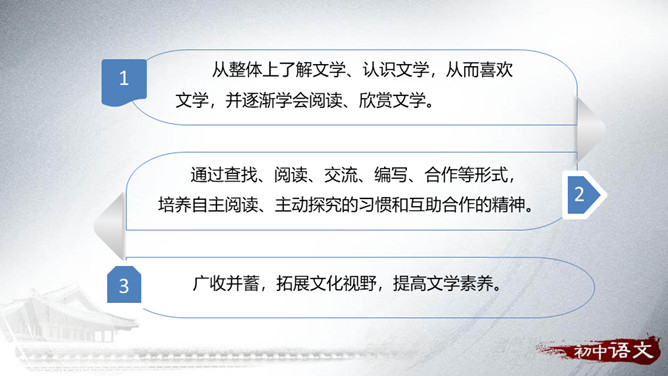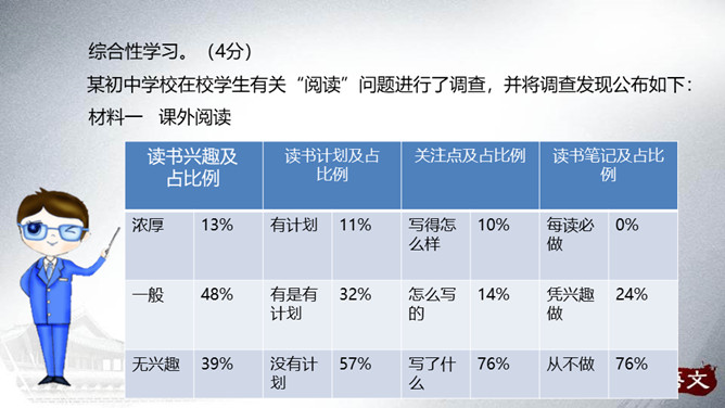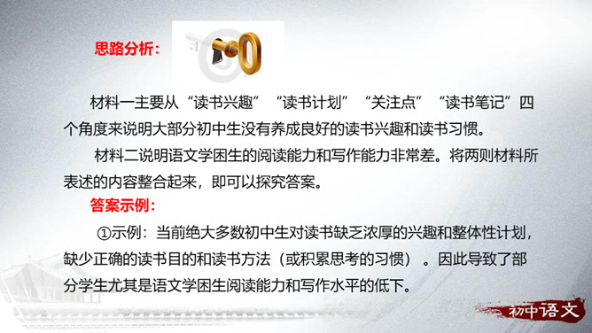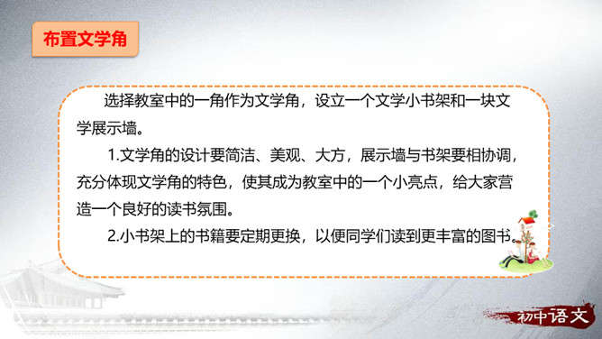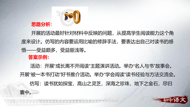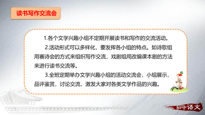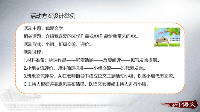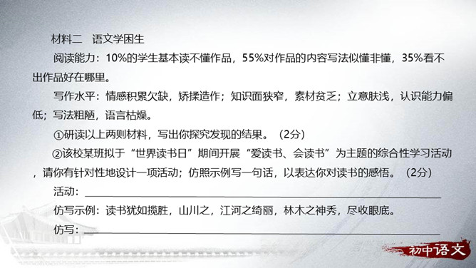 从整体上了解文学、认识文学,从而喜欢文学,并逐渐学会阅读、欣赏文学。通过查找、阅读、交流、编写、合作等形式,培养自主阅读、主动探究的习惯和互助合作的精神。广收并蓄,拓展文化视野,提高文学素养。开展的活动最好针对材料中反映的问题,从提高学生阅读能力这个角度来设计。仿写的内容要运用比喻的修辞手法,要表达出自己对读书的感悟——受益颇多,受益匪浅等。活动:开展“成长离不开阅读”主题演讲活动。举办“名人与书”故事会。开展“被一本书打动”好书推介活动。举办“学会阅读”读书经验与方法交流会。所属专题:文学部落ppt。