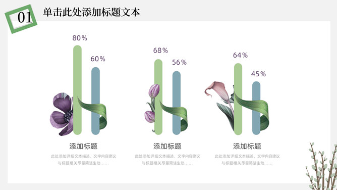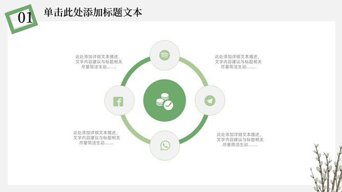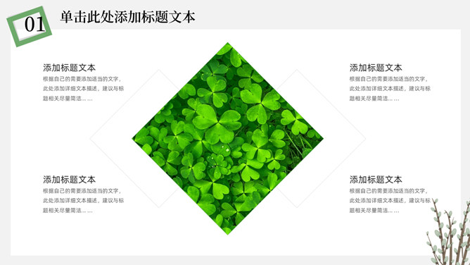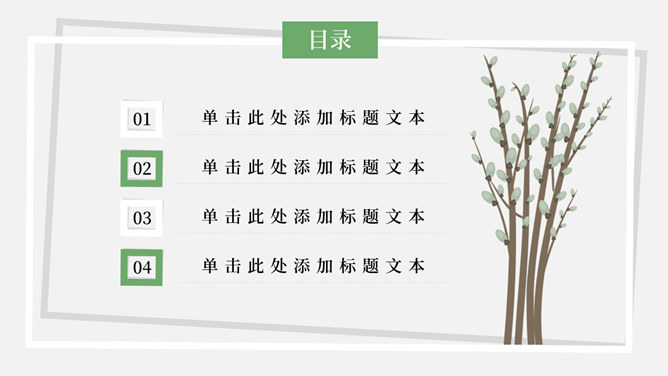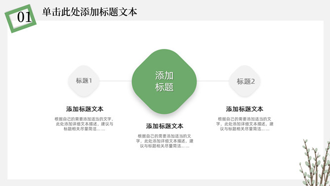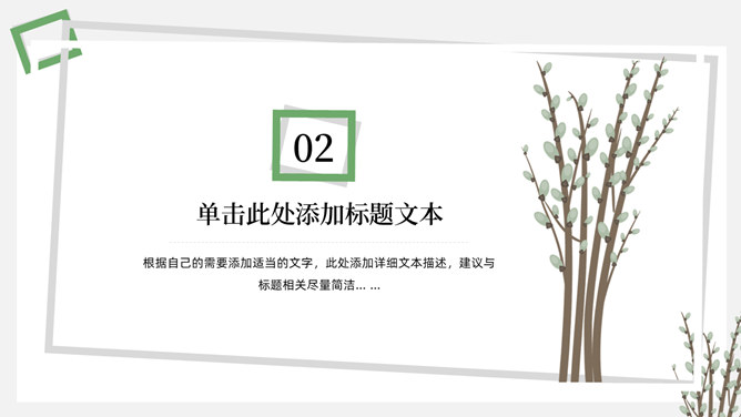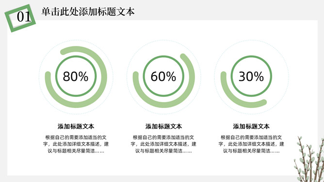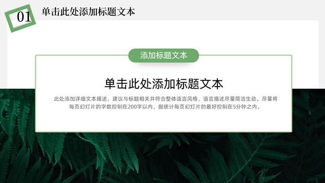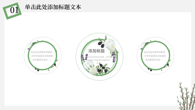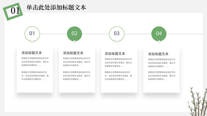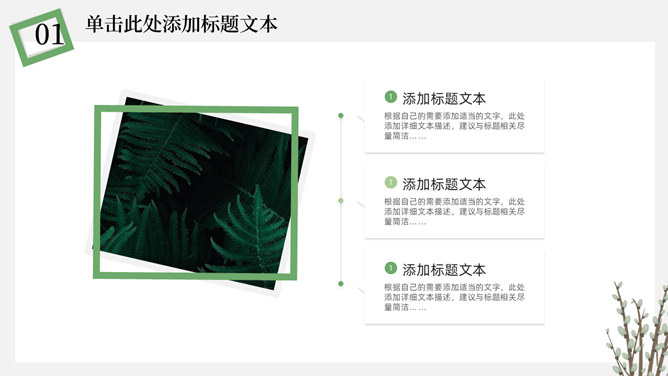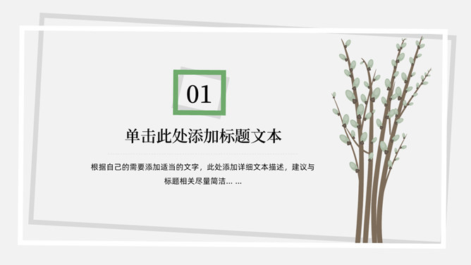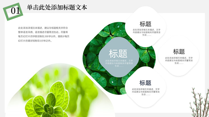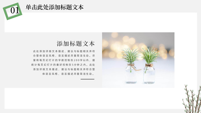 简洁淡雅文艺清新PPT模板。一套淡雅简约幻灯片模板,绿植元素设计,灰白背景,清新文艺,通用性强。