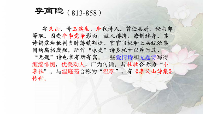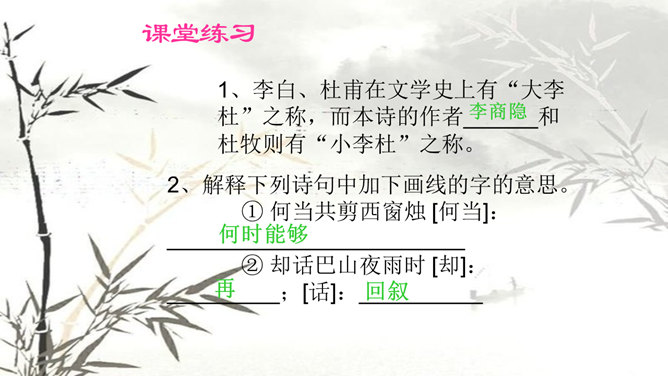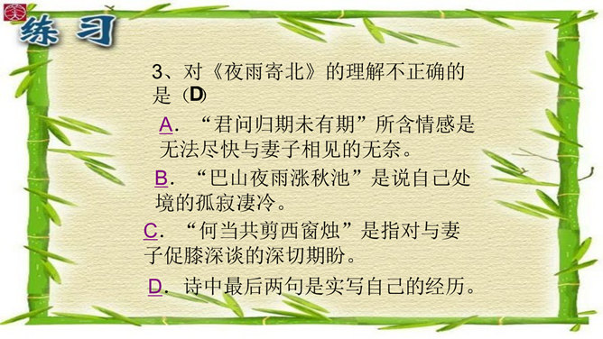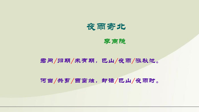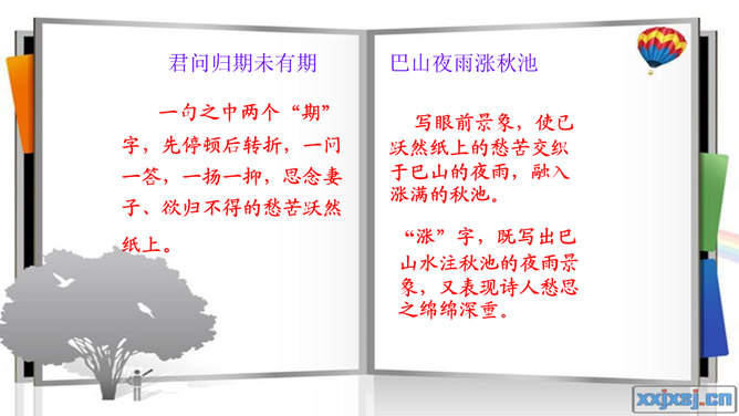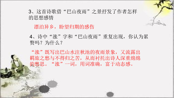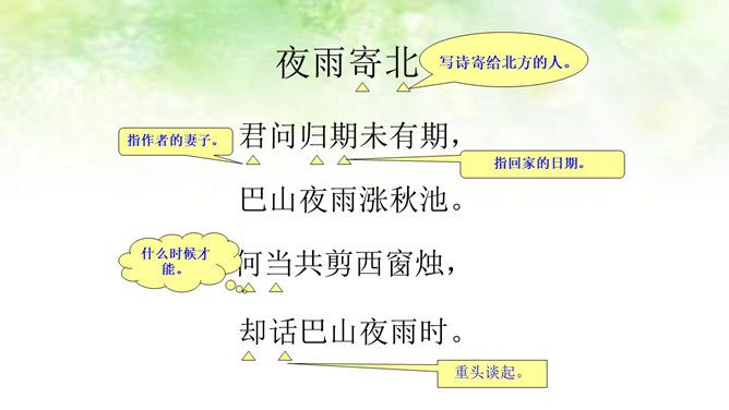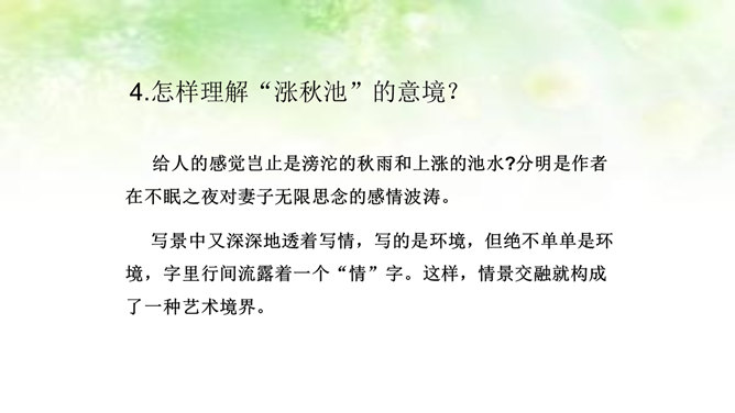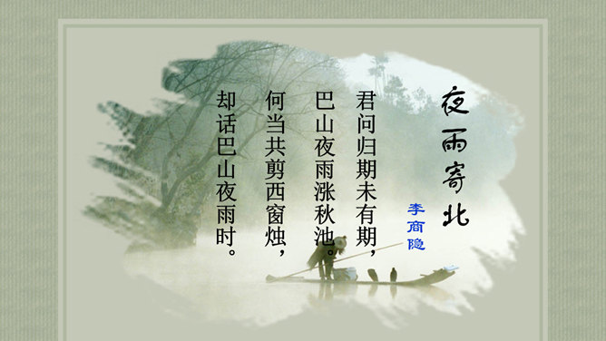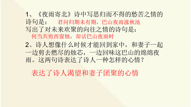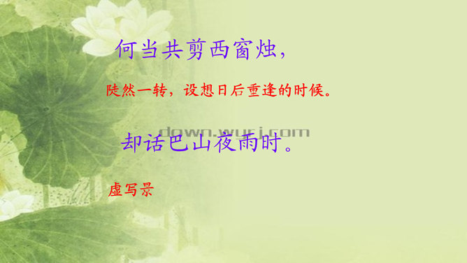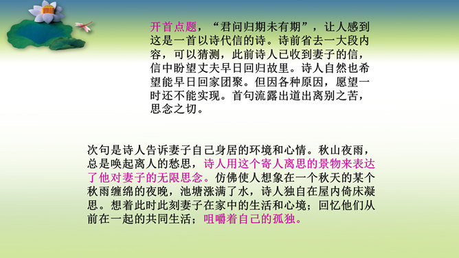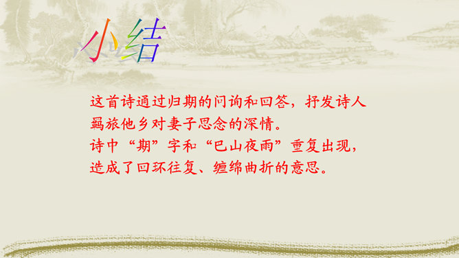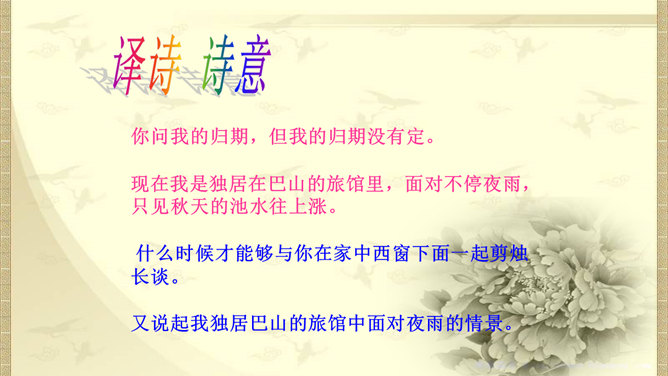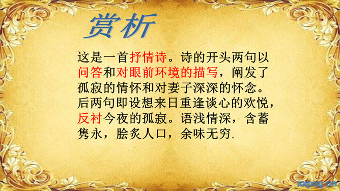 一句之中两个“期”字,先停顿后转折,一问一答,一扬一抑,思念妻子、欲归不得的愁苦跃然纸上。写眼前景象,使已跃然纸上的愁苦交织于巴山的夜雨,融入涨满的秋池。 “涨”字,既写出巴山水注秋池的夜雨景象,又表现诗人愁思之绵绵深重。这是一首抒情诗。诗的开头两句以问答和对眼前环境的描写,阐发了孤寂的情怀和对妻子深深的怀念。后两句即设想来日重逢谈心的欢悦,反衬今夜的孤寂。语浅情深,含蓄隽永,脍炙人口,余味无穷。所属专题:夜雨寄北ppt。