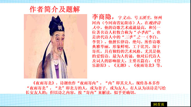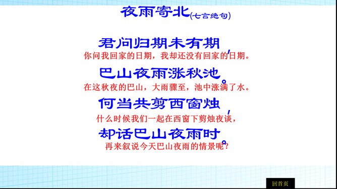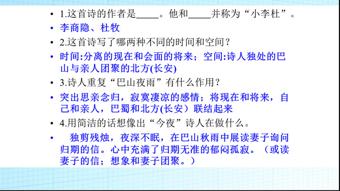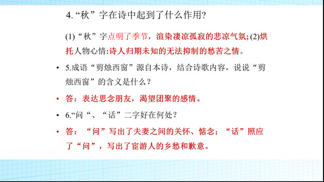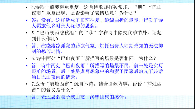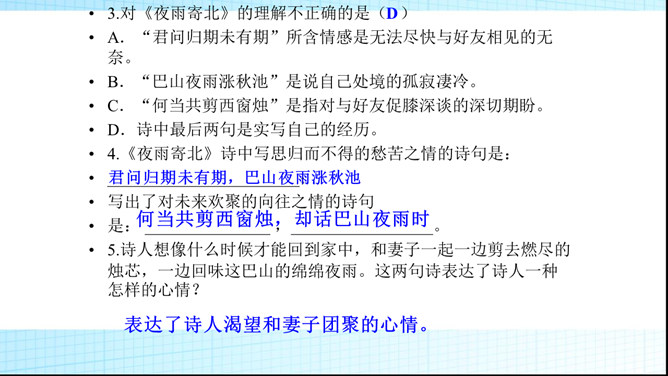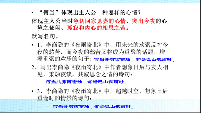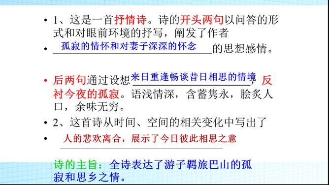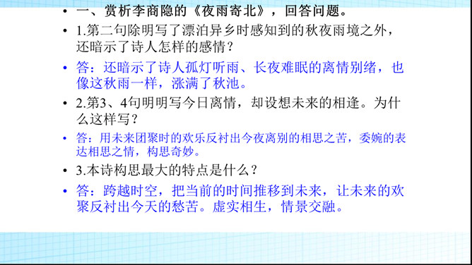 第二句除明写了漂泊异乡时感知到的秋夜雨境之外,还暗示了诗人怎样的感情?答:还暗示了诗人孤灯听雨、长夜难眠的离情别绪,也像这秋雨一样,涨满了秋池。第3、4句明明写今日离情,却设想未来的相逢。为什么这样写?答:用未来团聚时的欢乐反衬出今夜离别的相思之苦,委婉的表达相思之情,构思奇妙。本诗构思最大的特点是什么?答:跨越时空,把当前的时间推移到未来,让未来的欢聚反衬出今天的愁苦。虚实相生,情景交融。所属专题:夜雨寄北ppt。
