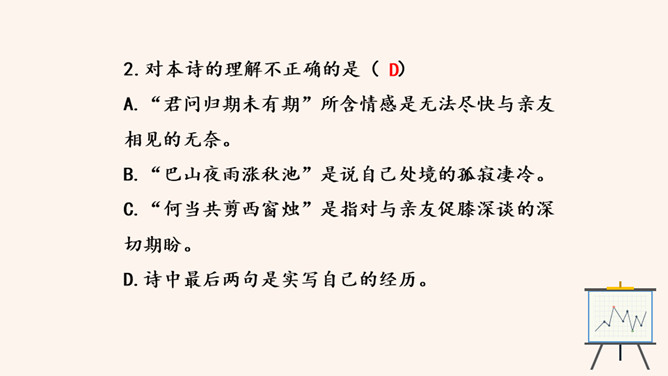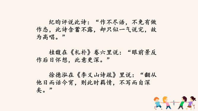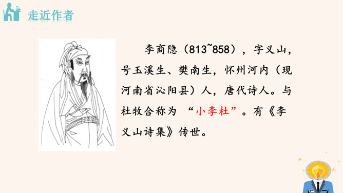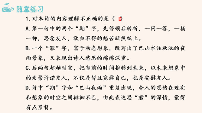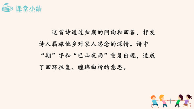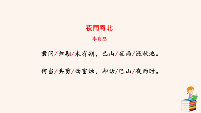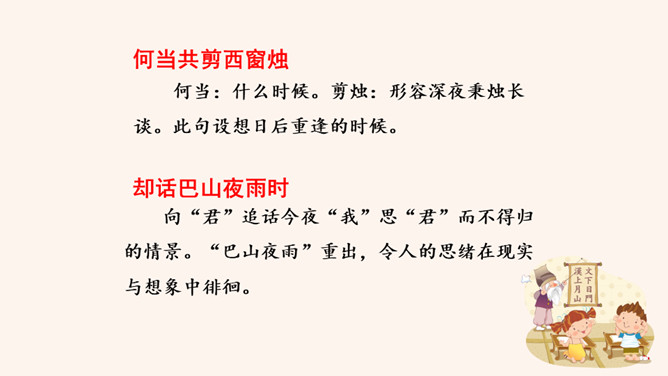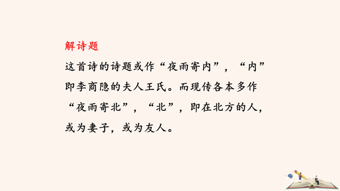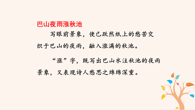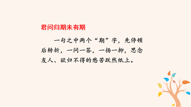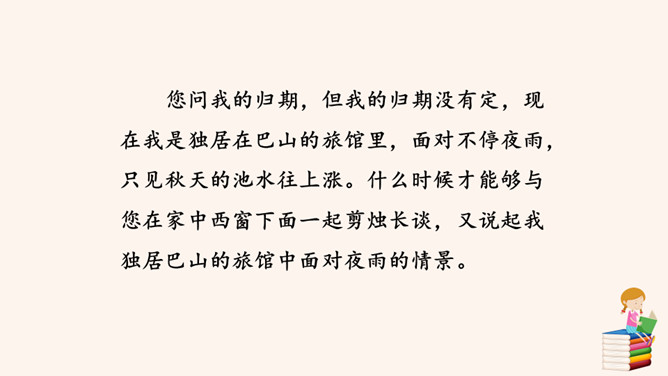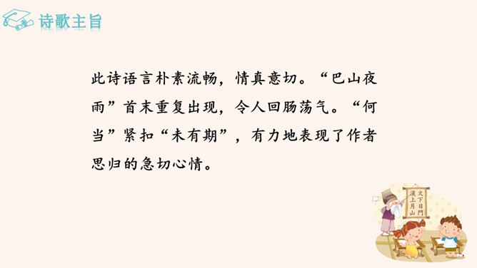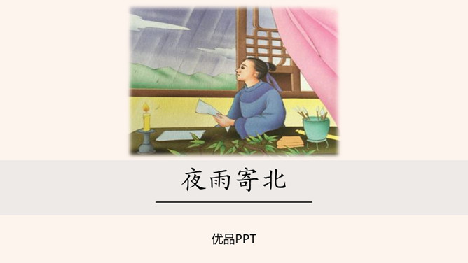 这首诗的诗题或作“夜雨寄内”,“内”即李商隐的夫人王氏。而现传各本多作“夜雨寄北”,“北”,即在北方的人,或为妻子,或为友人。您问我的归期,但我的归期没有定,现在我是独居在巴山的旅馆里,面对不停夜雨,只见秋天的池水往上涨。什么时候才能够与您在家中西窗下面一起剪烛长谈,又说起我独居巴山的旅馆中面对夜雨的情景。此诗语言朴素流畅,情真意切。“巴山夜雨”首末重复出现,令人回肠荡气。“何当”紧扣“未有期”,有力地表现了作者思归的急切心情。所属专题:夜雨寄北ppt。