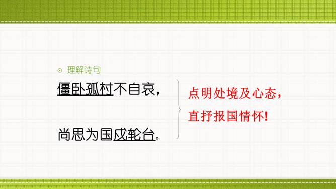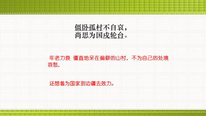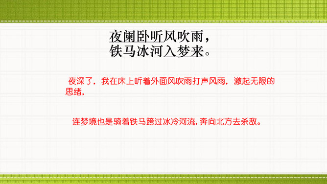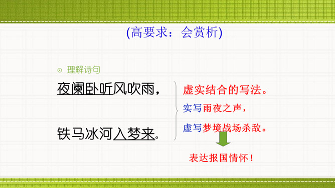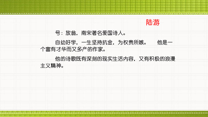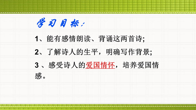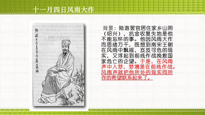 学习目标:1、能有感情朗读、背诵这两首诗;2、了解诗人的生平,明确写作背景;3 、感受诗人的爱国情怀,培养爱国情感。 体会主旨,语言,表现方法:全诗通过写出作者夜卧孤村,连梦中都想为国戍边杀敌的描述,充分表达了作者报国情怀。这首诗语言朴实明快、豪放流畅、通俗平易;表现方法上采用“寄情于梦,虚实结合的写法”。陆游号放翁,南宋著名爱国诗人。自幼好学,一生坚持抗金,为权贵所嫉。 他是一个富有才华而又多产的作家。他的诗歌既有深刻的现实生活内容,又有积极的浪漫主义精神。所属专题:十一月四日风雨大作ppt。