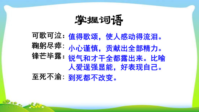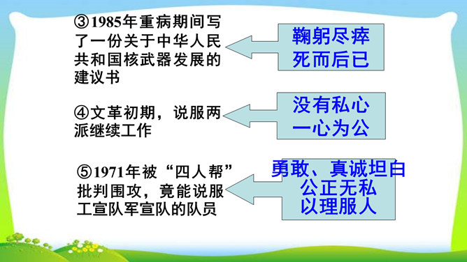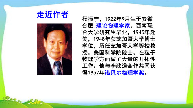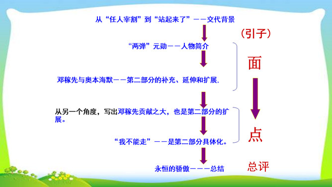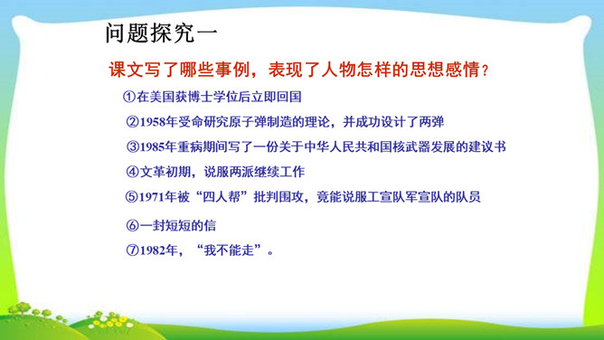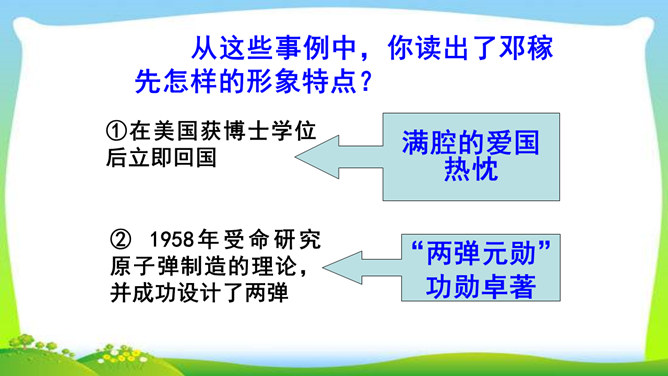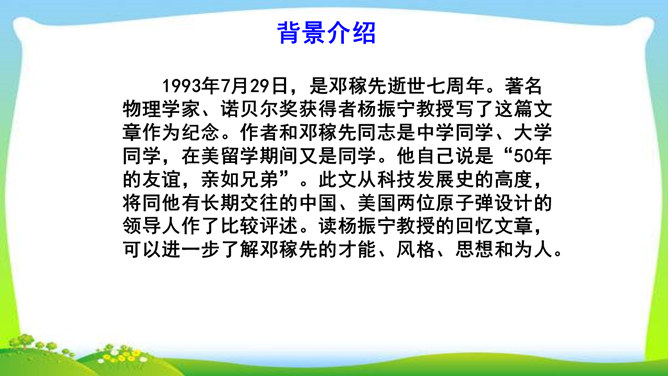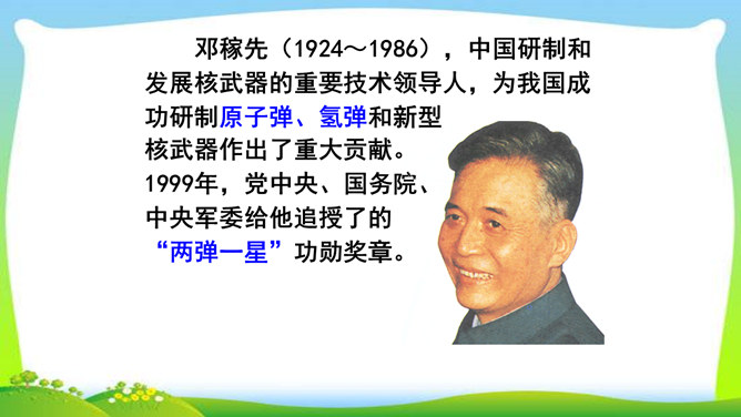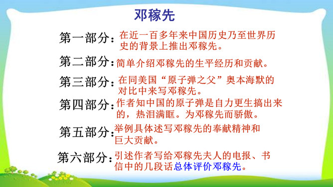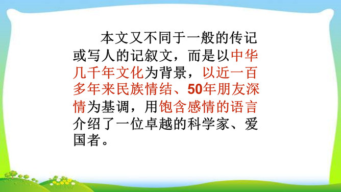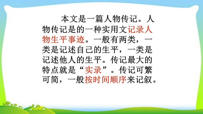 本文是一篇人物传记。人物传记是的一种实用文记录人物生平事迹。一般有两类,一类是记述自己的生平,一类是记述他人的生平。传记最大的特点就是“实录”。传记可繁可简,一般按时间顺序来记叙。本文又不同于一般的传记或写人的记叙文,而是以中华几千年文化为背景,以近一百多年来民族情结、50年朋友深情为基调,用饱含感情的语言介绍了一位卓越的科学家、爱国者。邓稼先在我国现代国防和科学发展史上是一个不平凡的人物,但作者在赞颂他的伟大精神时,却侧重选择了一些小事,于细微处见深情,于平凡中见高尚。所属专题:邓稼先ppt。