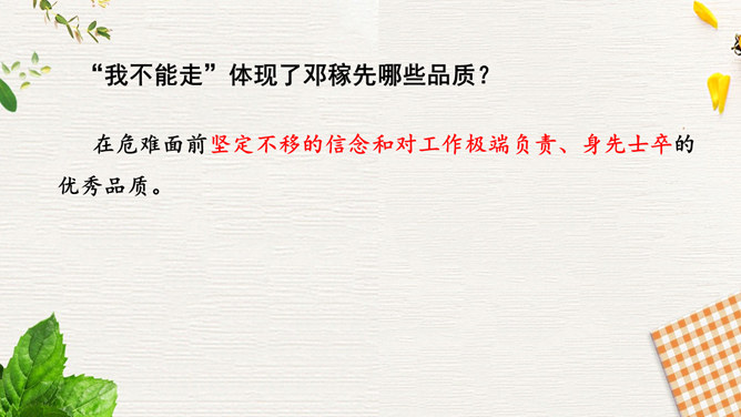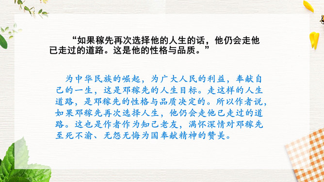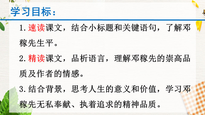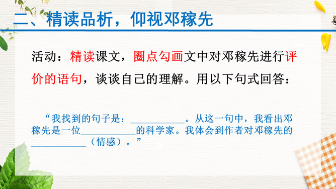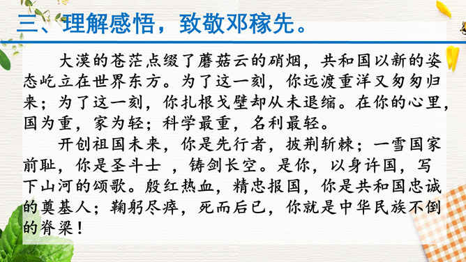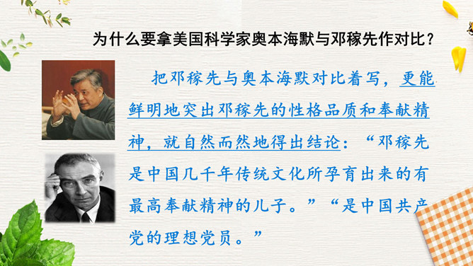 1.速读课文,结合小标题和关键语句,了解邓稼先生平。2.精读课文,品析语言,理解邓稼先的崇高品质及作者的情感。3.结合背景,思考人生的意义和价值,学习邓稼先无私奉献、执着追求的精神品质。活动:精读课文,圈点勾画文中对邓稼先进行评价的语句,谈谈自己的理解。在写邓稼先之前,为什么先概述我国一百多年来的历史?先概述我国近一百多年来的历史,是为了说明邓稼先是对中华民族从“任人宰割”到“站起来了”这一巨大转变做出重要贡献的科学家,是对民族的发展产生巨大影响的历史人物。所属专题:邓稼先ppt。