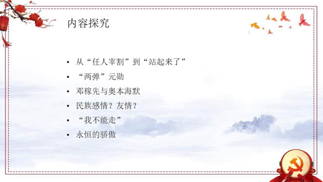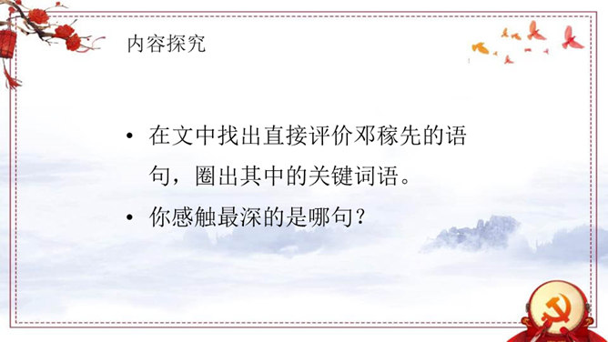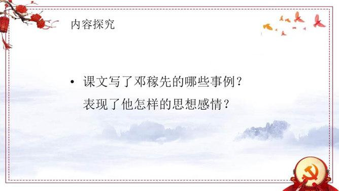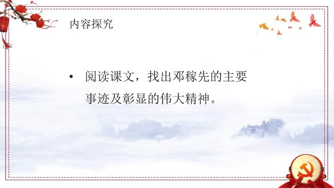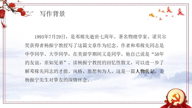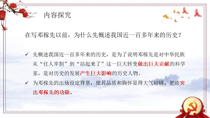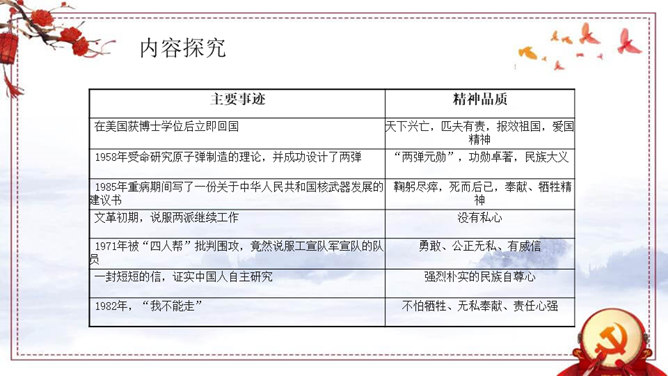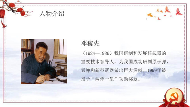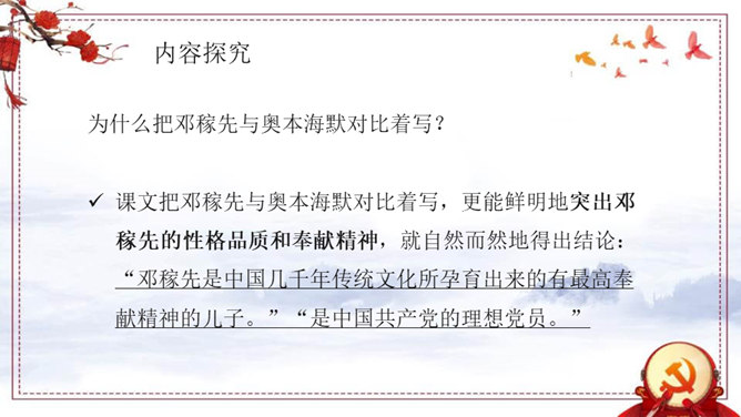 阅读课文,找出邓稼先的主要事迹及彰显的伟大精神。课文写了邓稼先的哪些事例?表现了他怎样的思想感情?在文中找出直接评价邓稼先的语句,圈出其中的关键词语。你感触最深的是哪句?为什么把邓稼先与奥本海默对比着写?课文把邓稼先与奥本海默对比着写,更能鲜明地突出邓稼先的性格品质和奉献精神,就自然而然地得出结论:“邓稼先是中国几千年传统文化所孕育出来的有最高奉献精神的儿子。”“是中国共产党的理想党员。”所属专题:邓稼先ppt。