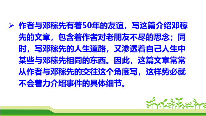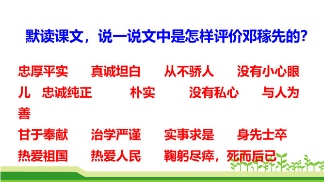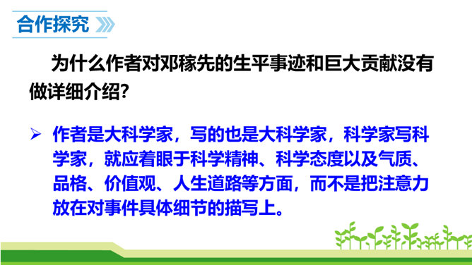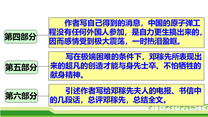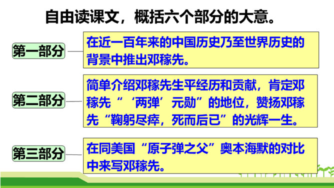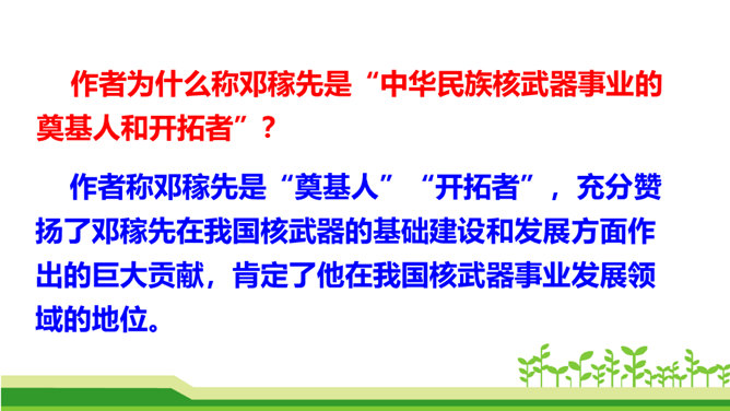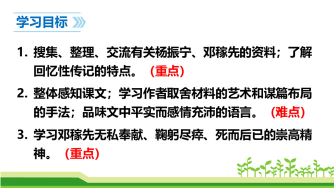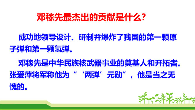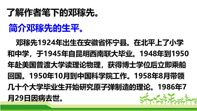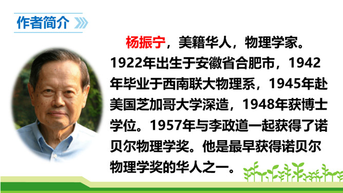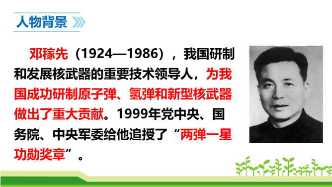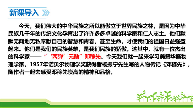今天,我们伟大的中华民族之所以能傲立于世界民族之林,是因为中华民族几千年的传统文化孕育出了许许多多卓越的科学家和仁人志士。他们默默无闻地无私奉献自己的智慧和青春,甚至生命,才使我们的祖国日益强盛起来。他们是我们的民族英雄,是我们民族的骄傲。这其中,就有一位杰出的科学家——“‘两弹’元勋”邓稼先。今天我们就一起来学习美籍华裔物理学家,1957年诺贝尔物理学奖获得者杨振宁先生写的人物传记《邓稼先》,随作者一起去感受邓稼先崇高的精神和品格。搜集、整理、交流有关杨振宁、邓稼先的资料;了解回忆性传记的特点。所属专题:邓稼先ppt。