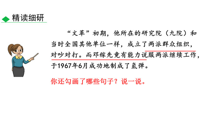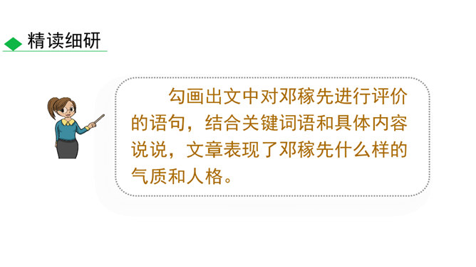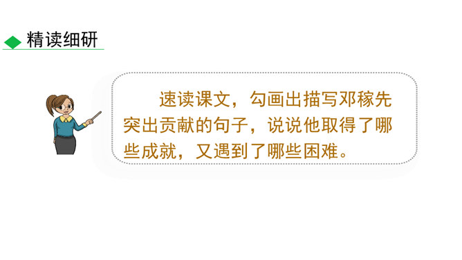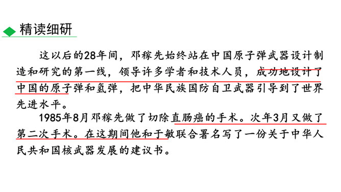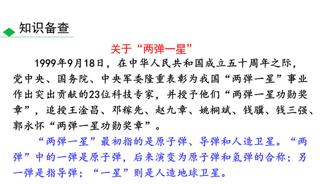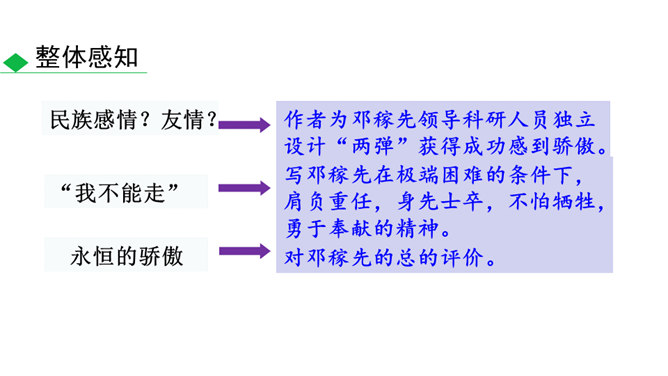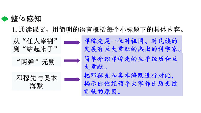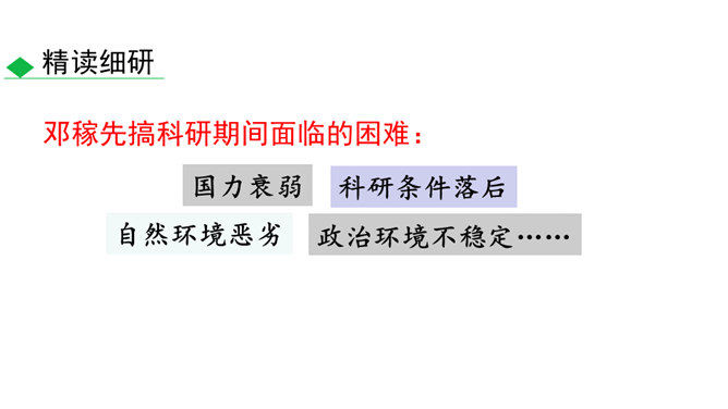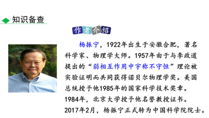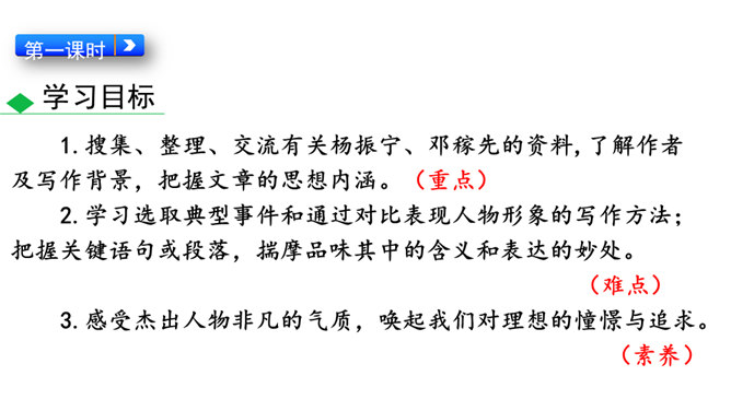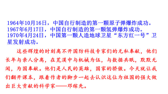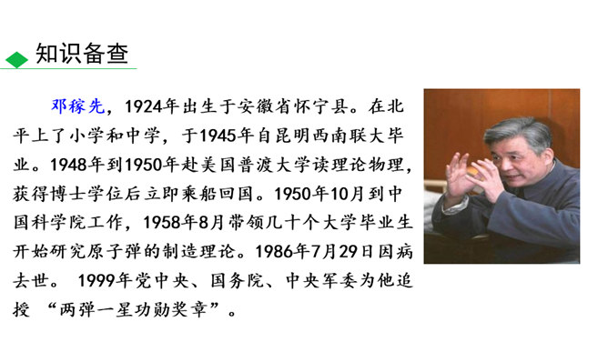 这些辉煌的时刻离不开国防科技专家们的无私奉献,他们长年与亲人分离,在荒漠中与机械为伍,与数据共眠,默默无闻,为国奉献。他们是人民的英雄,国家的骄傲。今天就让我们翻开课本,跟着作者的脚步一起去认识这位为祖国的强大做出巨大贡献的科学家——邓稼先。 1.搜集、整理、交流有关杨振宁、邓稼先的资料,了解作者及写作背景,把握文章的思想内涵。(重点)2.学习选取典型事件和通过对比表现人物形象的写作方法;把握关键语句或段落,揣摩品味其中的含义和表达的妙处。(难点)3.感受杰出人物非凡的气质,唤起我们对理想的憧憬与追求。所属专题:邓稼先ppt。