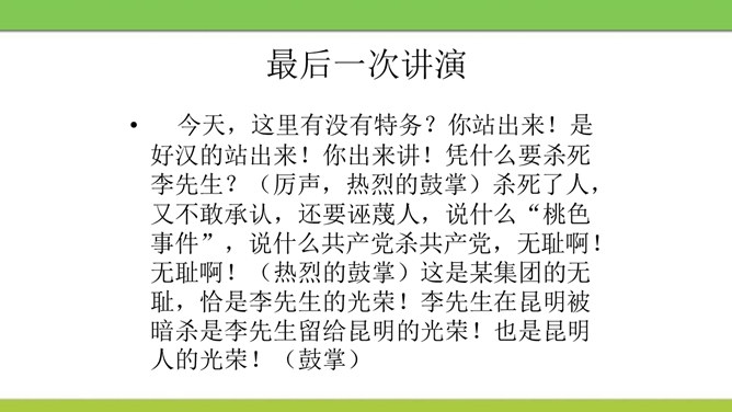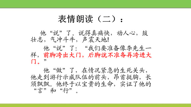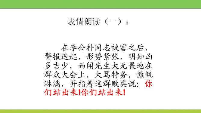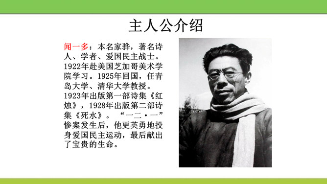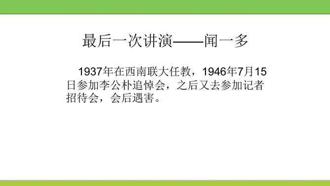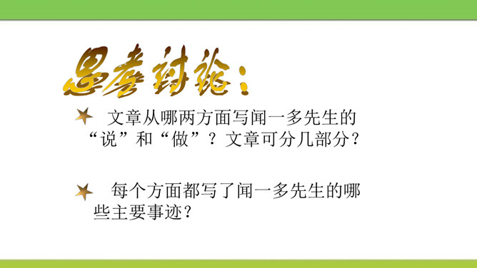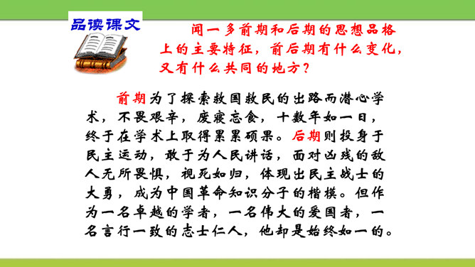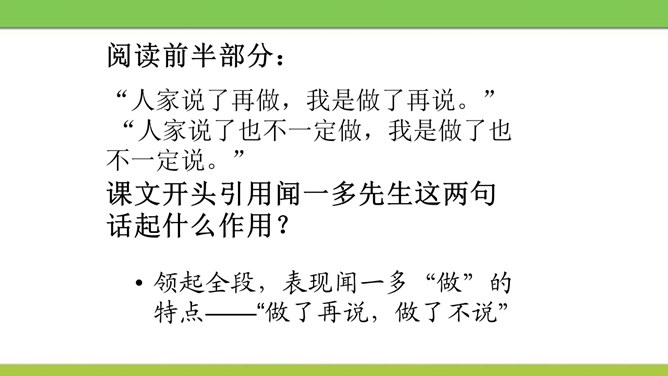文章从哪两方面写闻一多先生的“说”和“做”?文章可分几部分?每个方面都写了闻一多先生的哪些主要事迹?课文开头引用闻一多先生这两句话起什么作用?领起全段,表现闻一多“做”的特点——“做了再说,做了不说”。闻一多前期和后期的思想品格上的主要特征,前后期有什么变化,又有什么共同的地方?前期为了探索救国救民的出路而潜心学术,不畏艰辛,废寝忘食,十数年如一日,终于在学术上取得累累硕果。后期则投身于民主运动,敢于为人民讲话,面对凶残的敌人无所畏惧,视死如归,体现出民主战士的大勇。所属专题:说和做:记闻一多先生的言行片段ppt。