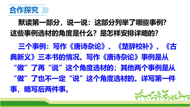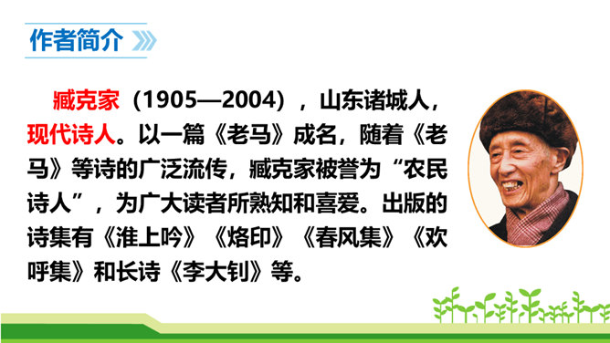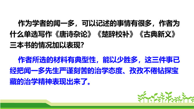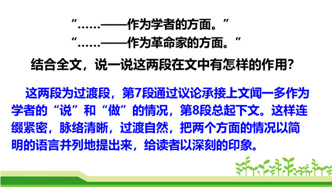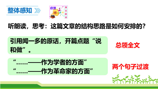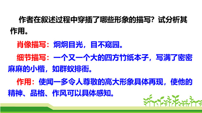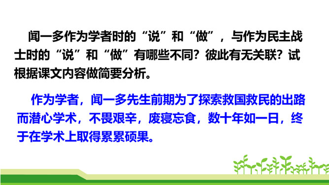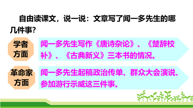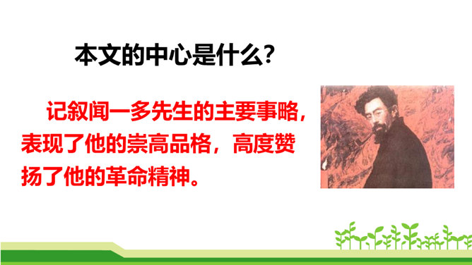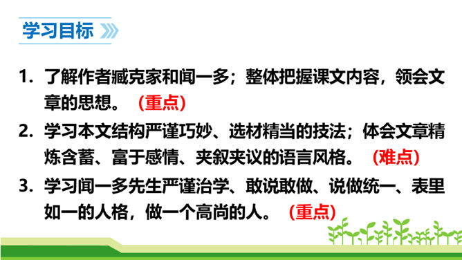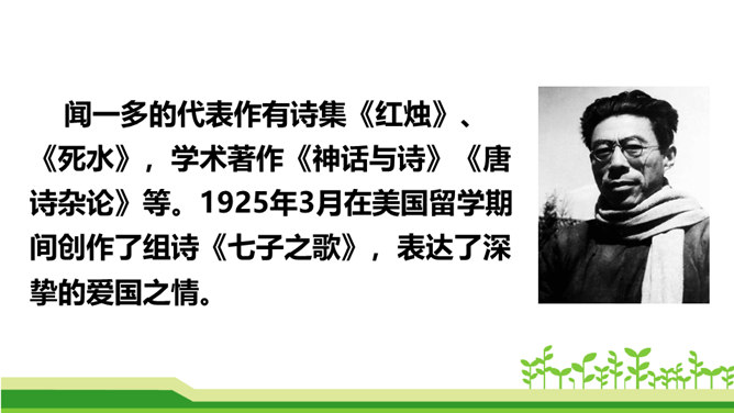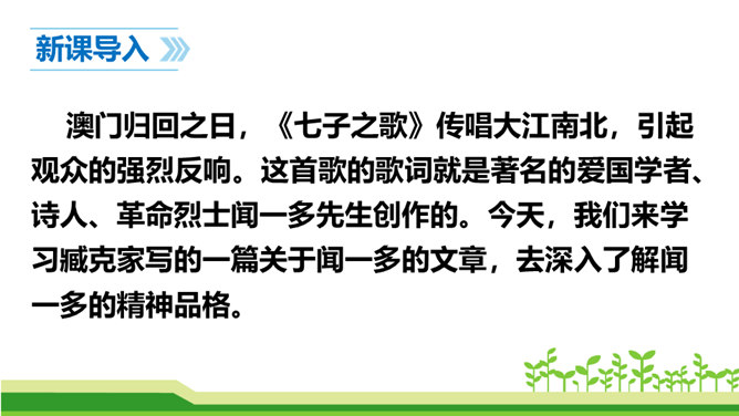 澳门归回之日,《七子之歌》传唱大江南北,引起观众的强烈反响。这首歌的歌词就是著名的爱国学者、诗人、革命烈士闻一多先生创作的。今天,我们来学习臧克家写的一篇关于闻一多的文章,去深入了解闻一多的精神品格。了解作者臧克家和闻一多;整体把握课文内容,领会文章的思想。(重点)学习本文结构严谨巧妙、选材精当的技法;体会文章精炼含蓄、富于感情、夹叙夹议的语言风格。(难点)学习闻一多先生严谨治学、敢说敢做、说做统一、表里如一的人格,做一个高尚的人。(重点)所属专题:说和做:记闻一多先生的言行片段ppt。