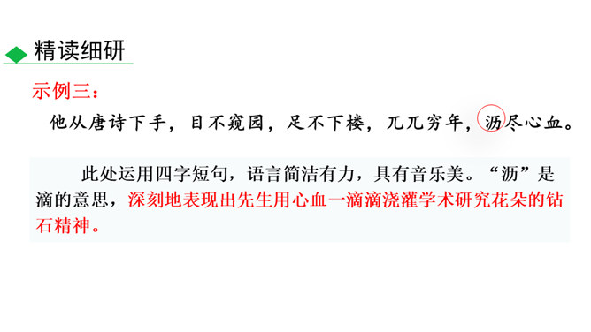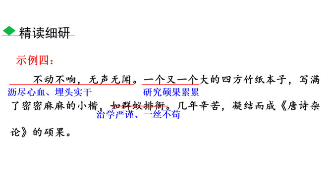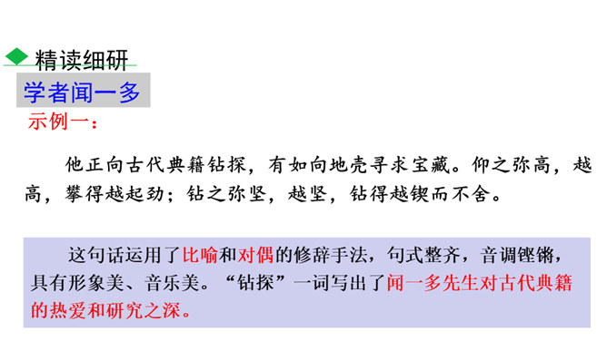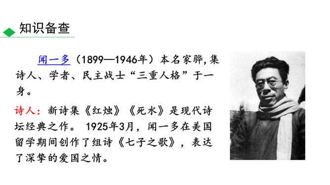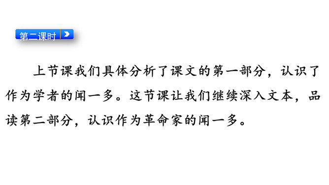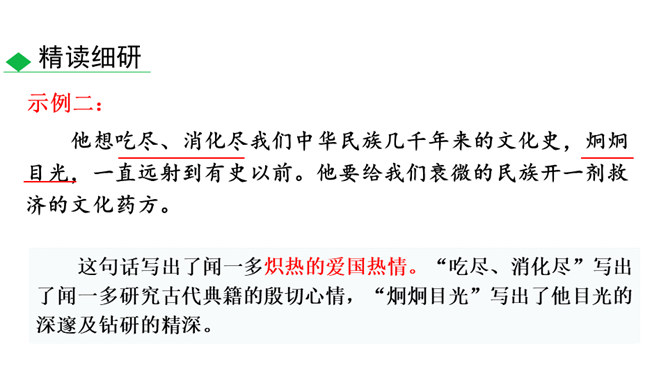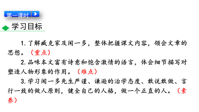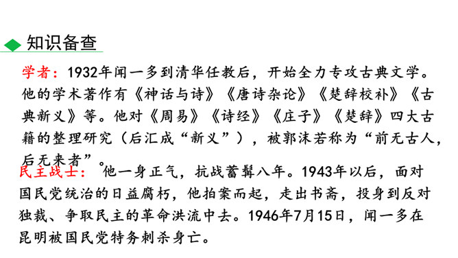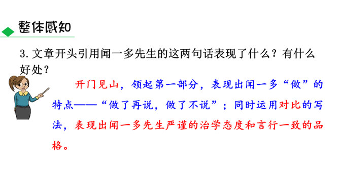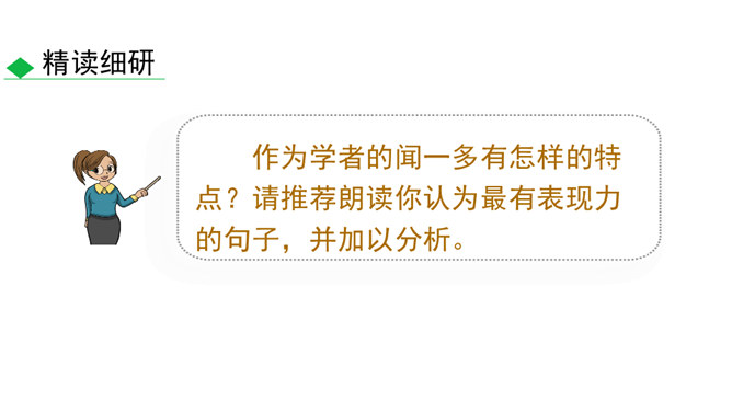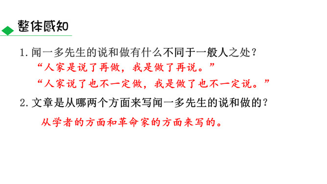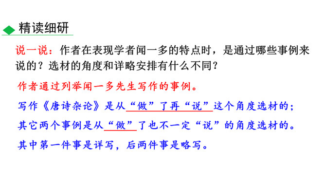 作为学者的闻一多有怎样的特点?请推荐朗读你认为最有表现力的句子,并加以分析。说一说:作者在表现学者闻一多的特点时,是通过哪些事例来说的?选材的角度和详略安排有什么不同?作者通过列举闻一多先生写作的事例。 写作《唐诗杂论》是从“做”了再“说”这个角度选材的;其它两个事例是从“做”了也不一定“说”的角度选材的。其中第一件事是详写,后两件事是略写。作为革命家的闻一多先生,课文又选取了哪些事迹来写呢?表现了闻一多怎样的精神品质?所属专题:说和做:记闻一多先生的言行片段ppt。