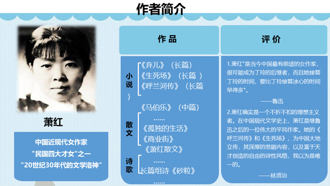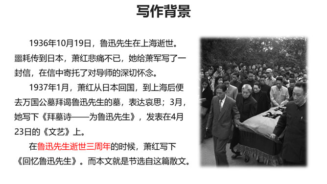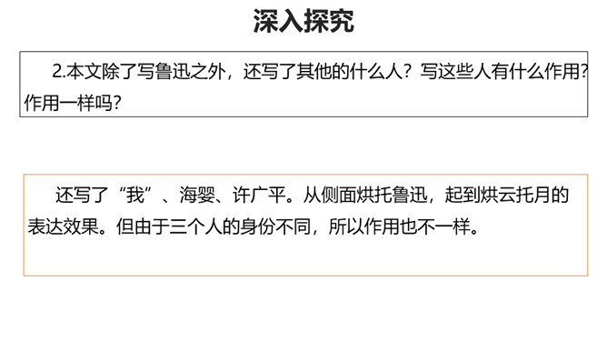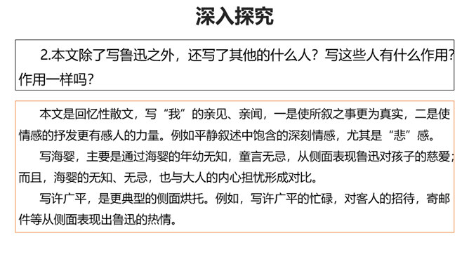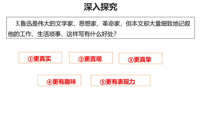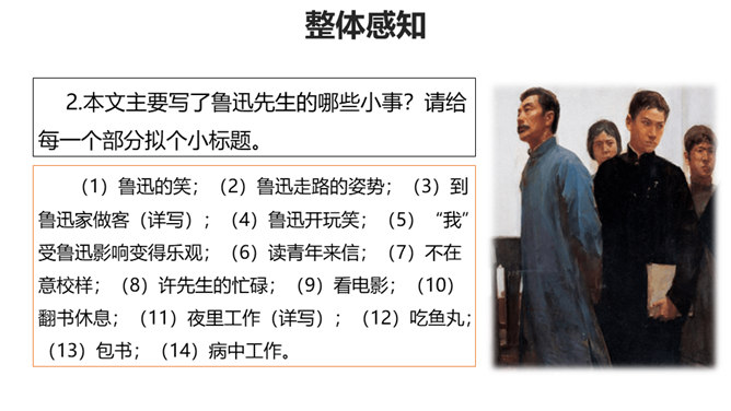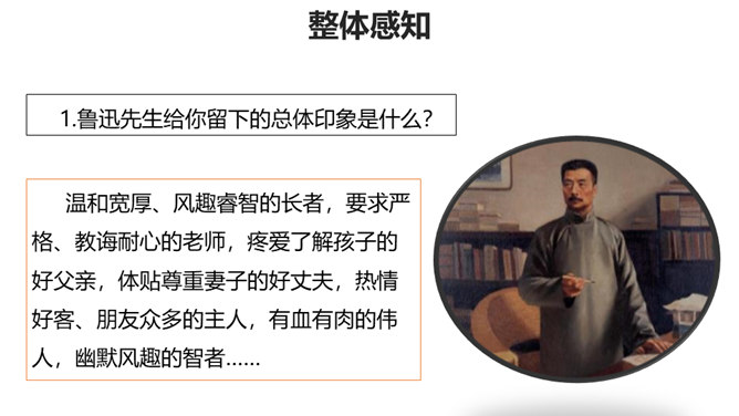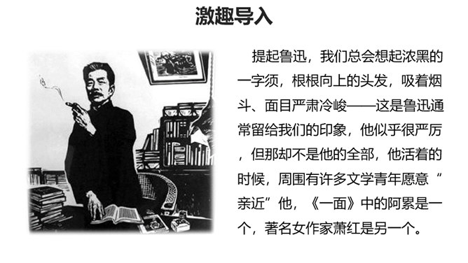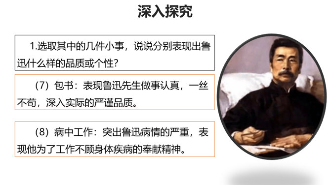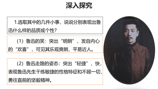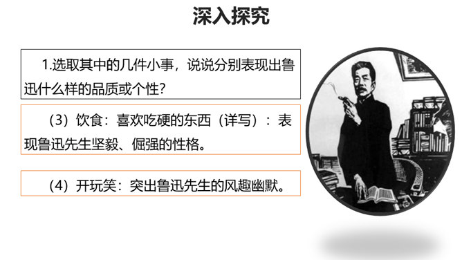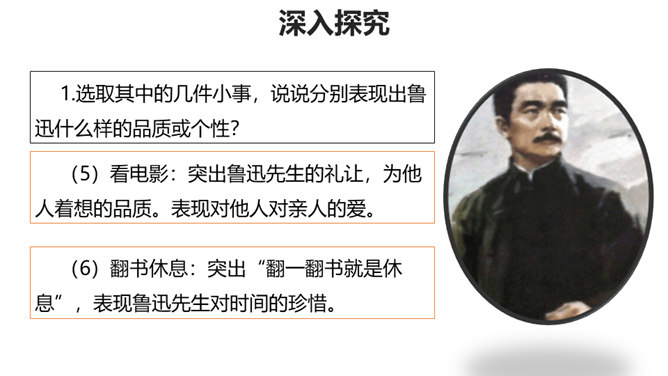 选取其中的几件小事,说说分别表现出鲁迅什么样的品质或个性?(1)鲁迅的笑:突出“明朗”,发自内心的“欢喜”,可见其乐观爽朗、平易近人。(2)鲁迅走路的姿态:突出“轻捷”,快,表现鲁迅先生干练敏捷的性格特征和不顾一切、勇往直前的坚毅精神。(3)饮食:喜欢吃硬的东西(详写):表现鲁迅先生坚毅、倔强的性格。(4)开玩笑:突出鲁迅先生的风趣幽默。(5)看电影:突出鲁迅先生的礼让,为他人着想的品质。表现对他人对亲人的爱。(6)翻书休息:突出“翻一翻书就是休息”,表现鲁迅先生对时间的珍惜。所属专题:回忆鲁迅先生ppt。