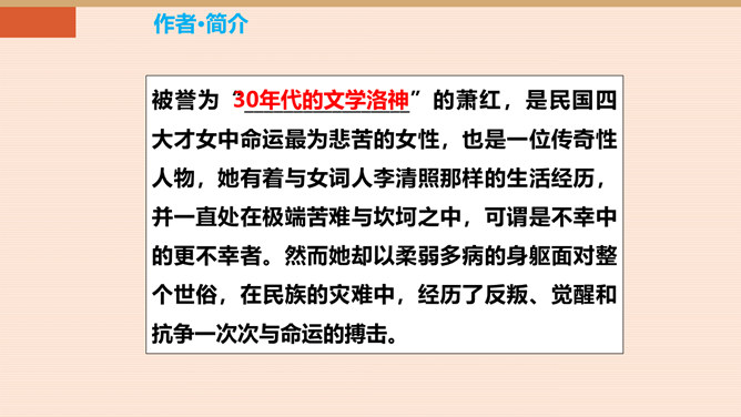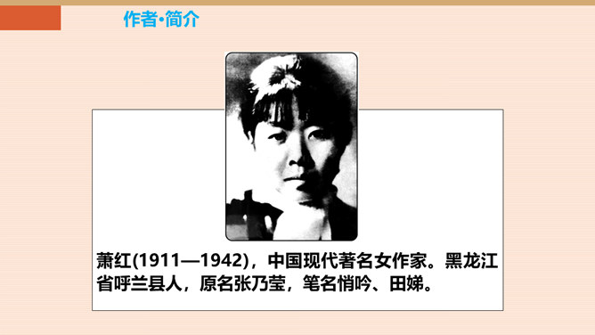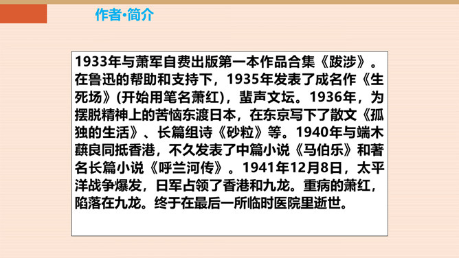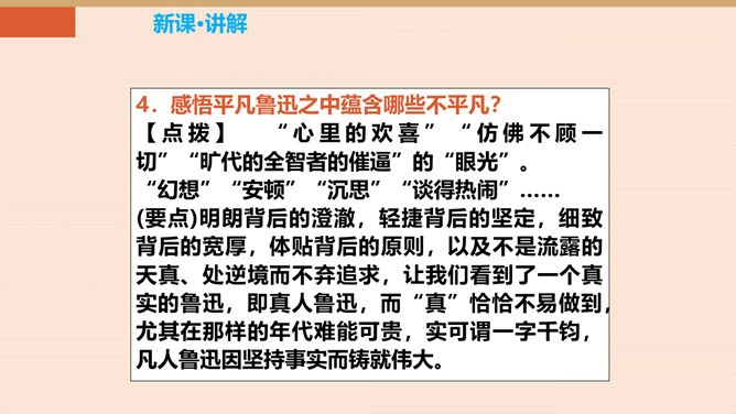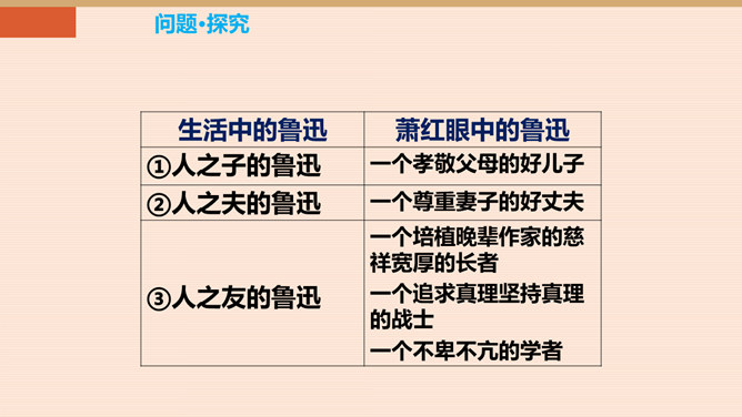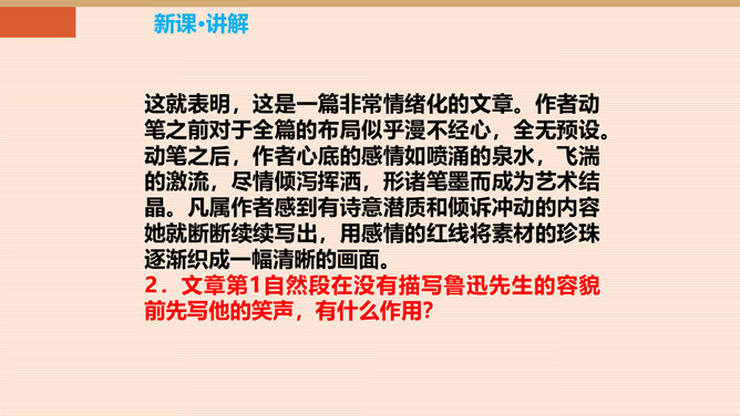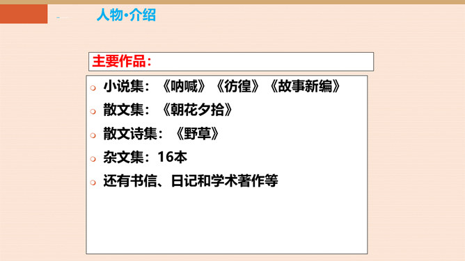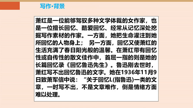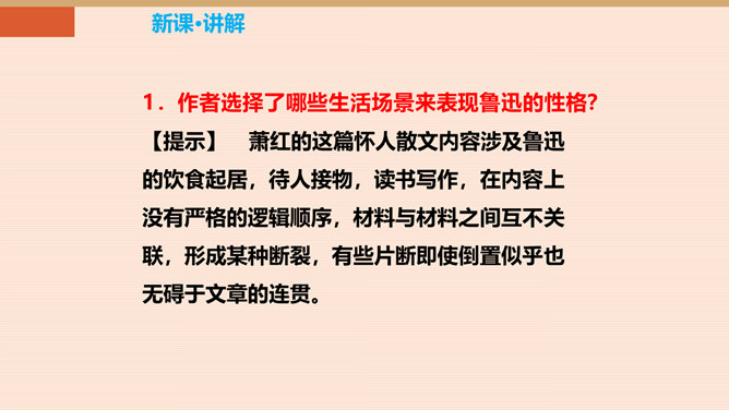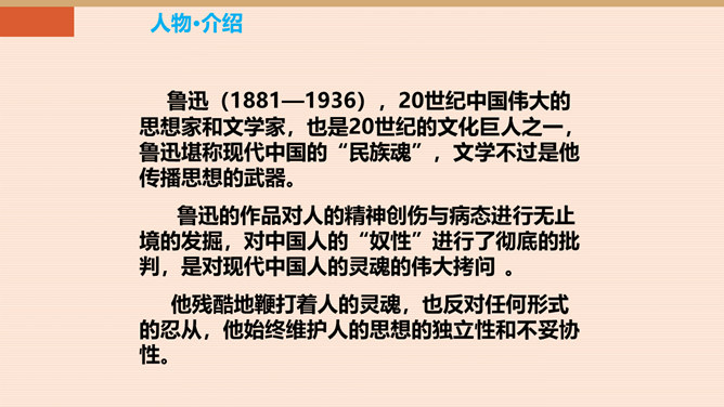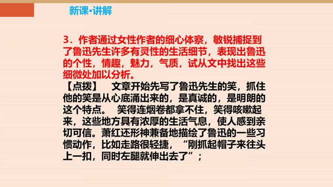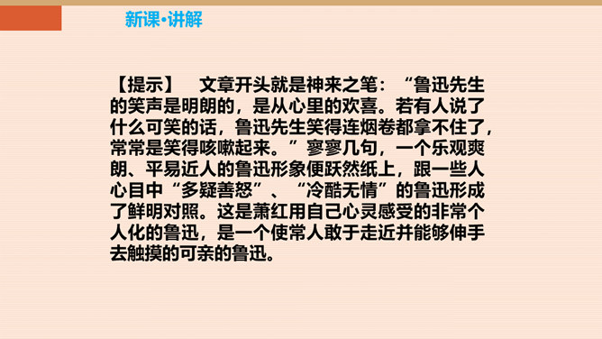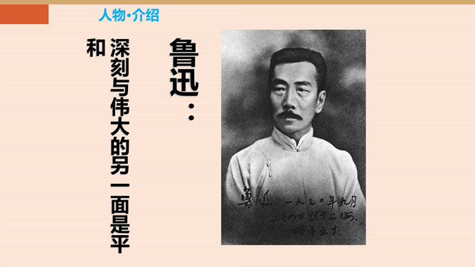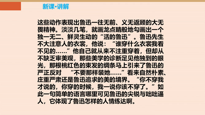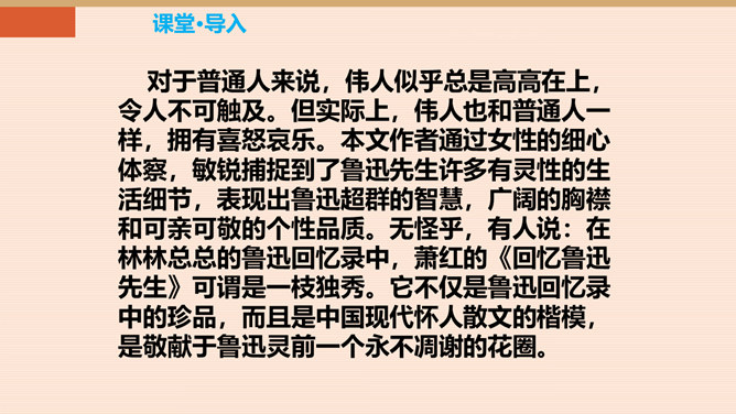萧红还形神兼备地描绘了鲁迅的一些习惯动作,比如走路很轻捷,“刚抓起帽子来往头上一扣,同时左腿就伸出去了”;这些动作表现出鲁迅一往无前、义无返顾的大无畏精神。淡淡几笔,就画龙点睛般地勾画出一个独一无二、鲜灵生动的“活的鲁迅”。鲁迅先生不大注意人的衣裳,他说:“谁穿什么衣裳我看不见的……”他自己就从来不注重穿着,但却从不缺乏审美观,那些美学的诊断足见他独到的眼光,那根桃红色的束发的绸条马上引来了鲁迅的严正反对“不要那样装饰她……”所属专题:回忆鲁迅先生ppt。