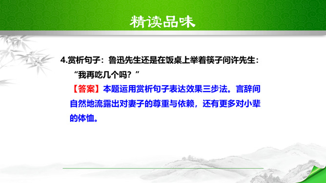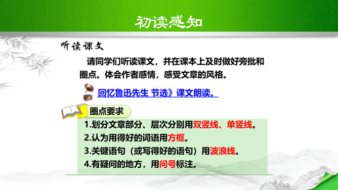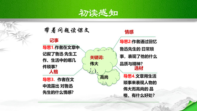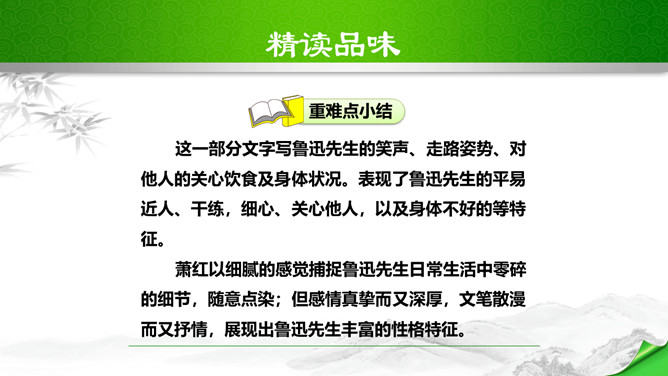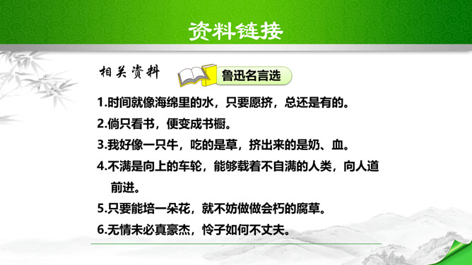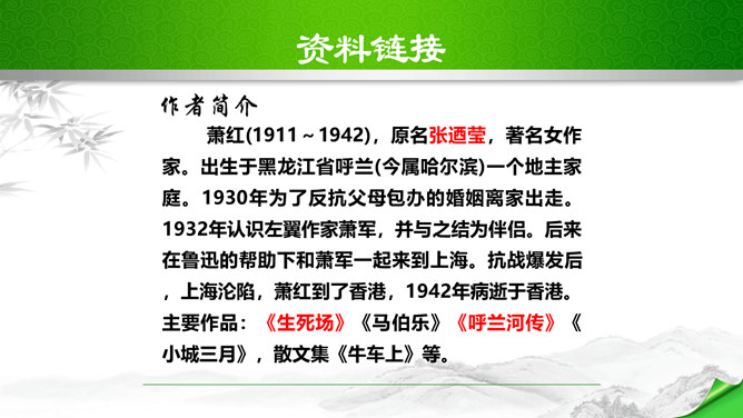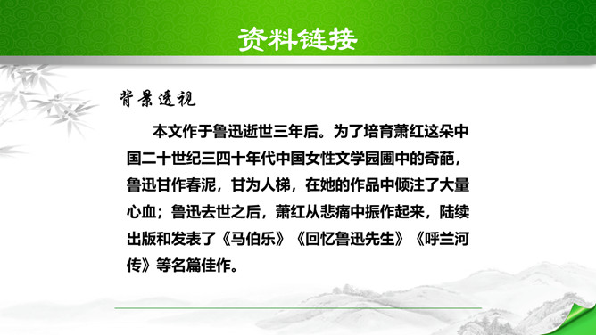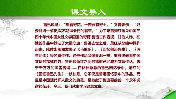 鲁迅说过:“想看好花,一定要有好土。”又曾表示:“只要能培一朵花,就不妨做会朽的腐草。”为了培育萧红这朵中国三四十年代中国女性文学园圃的奇葩,鲁迅甘作春泥,甘为人梯,在她的作品中倾注了大量心血;鲁迅去世之后,萧红从悲痛中振作起来,陆续出版和发表了《马伯乐》、《回忆鲁迅先生》、《呼兰河传》等名篇佳作。这些作品又像春泥一样,继续滋养着中国文坛的茂林佳卉。鲁迅和萧红之间的情谊已经成为文坛佳话,被千千万万的读者传诵……在林林总总的鲁迅回忆录中,萧红的《回忆鲁迅先生》一枝独秀。所属专题:回忆鲁迅先生ppt。
