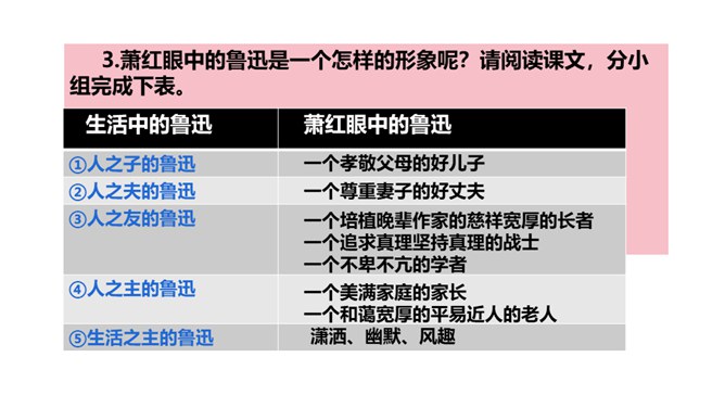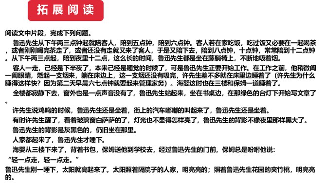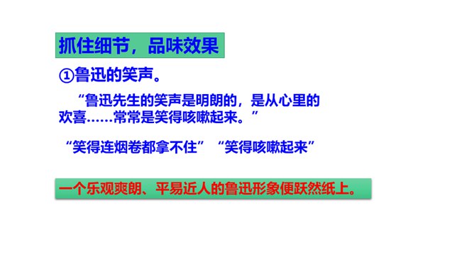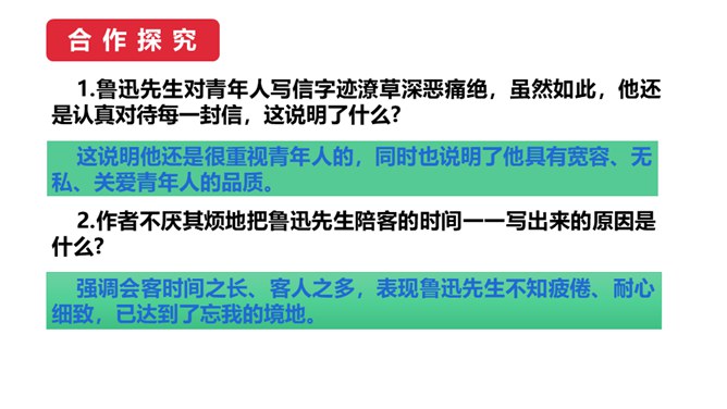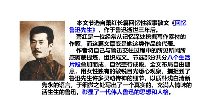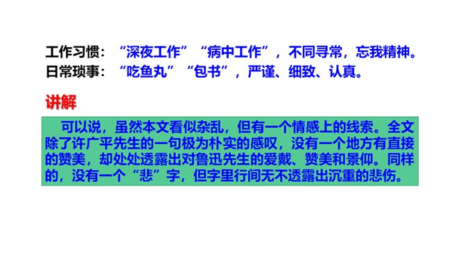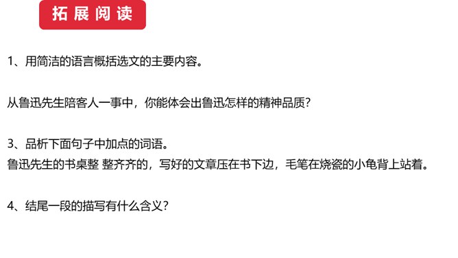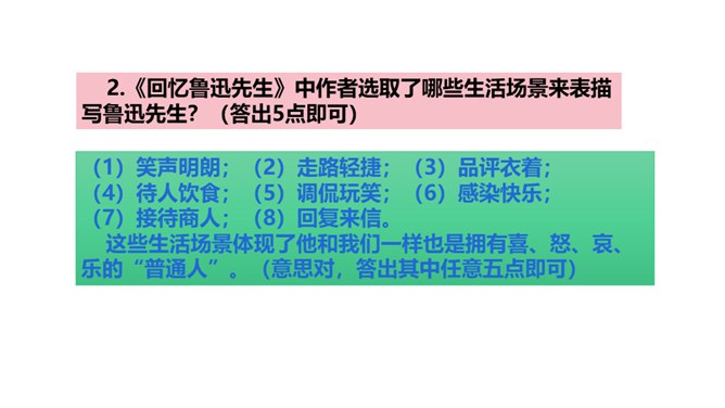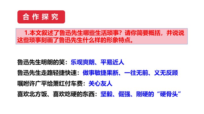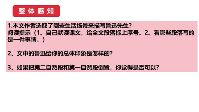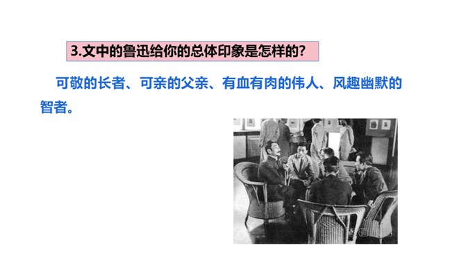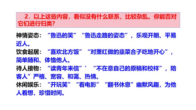 1.鲁迅是伟大的文学家、思想家、革命家,但本文却大量细致地记叙他的工作、生活琐事,这样写有什么好处?(1)更真实。伟人也像凡人一样会生病,会害怕,也聊天、看电影,也有自己的生活特点和习惯,这就给了读者一个活生生的、真实的鲁迅。这样的鲁迅,更让人觉得可亲。(2)更直观。通篇都是对鲁迅的工作生活琐事的记叙,让我们直接感受到鲁迅的为人、做事、对待生活、对待工作方面的许多感人之处,以及他思想、性格方面的不少特点。而这些都不是通过作者的抽象说教中来的。所属专题:回忆鲁迅先生ppt。